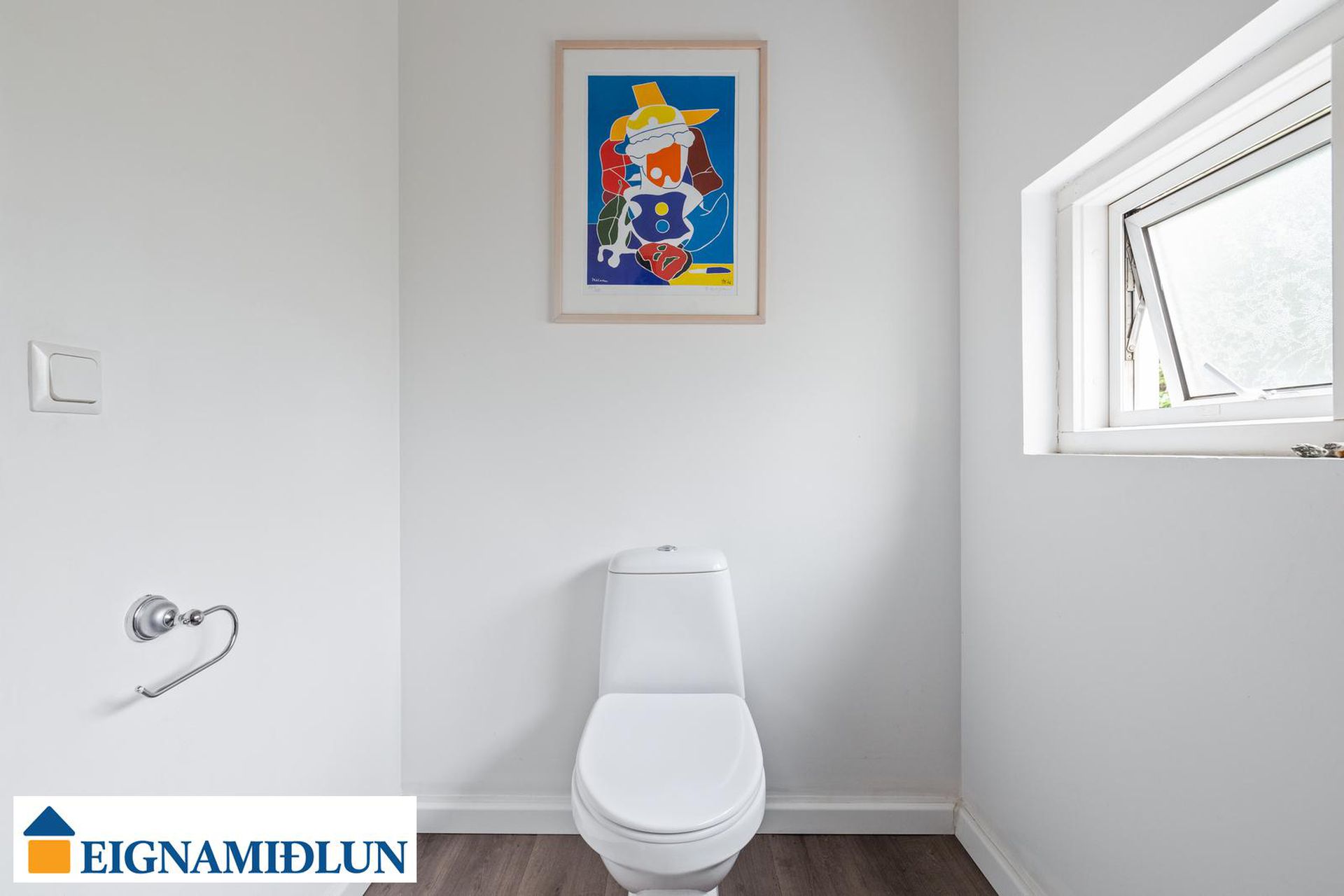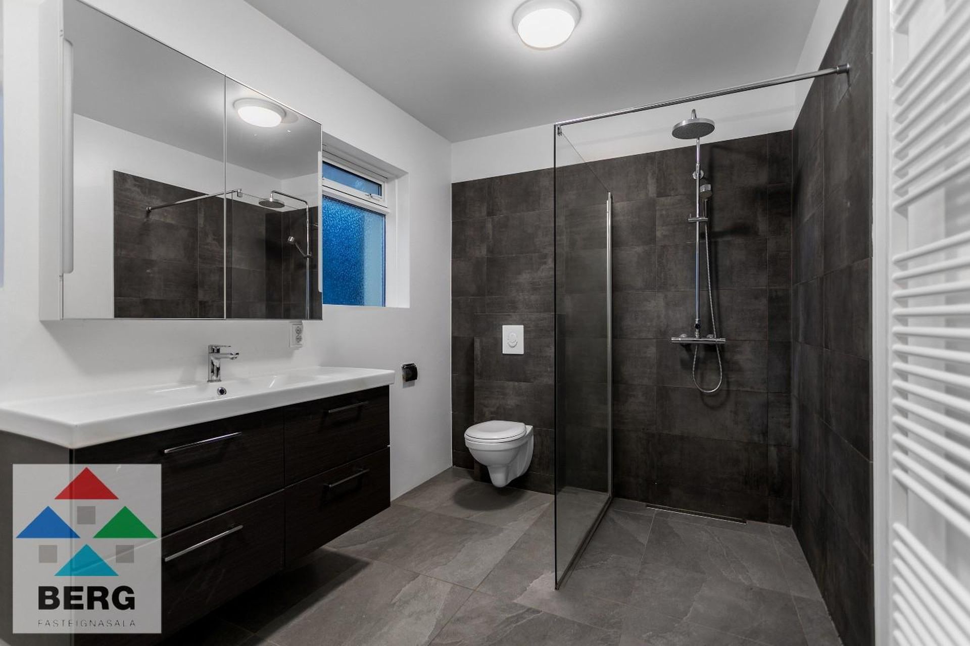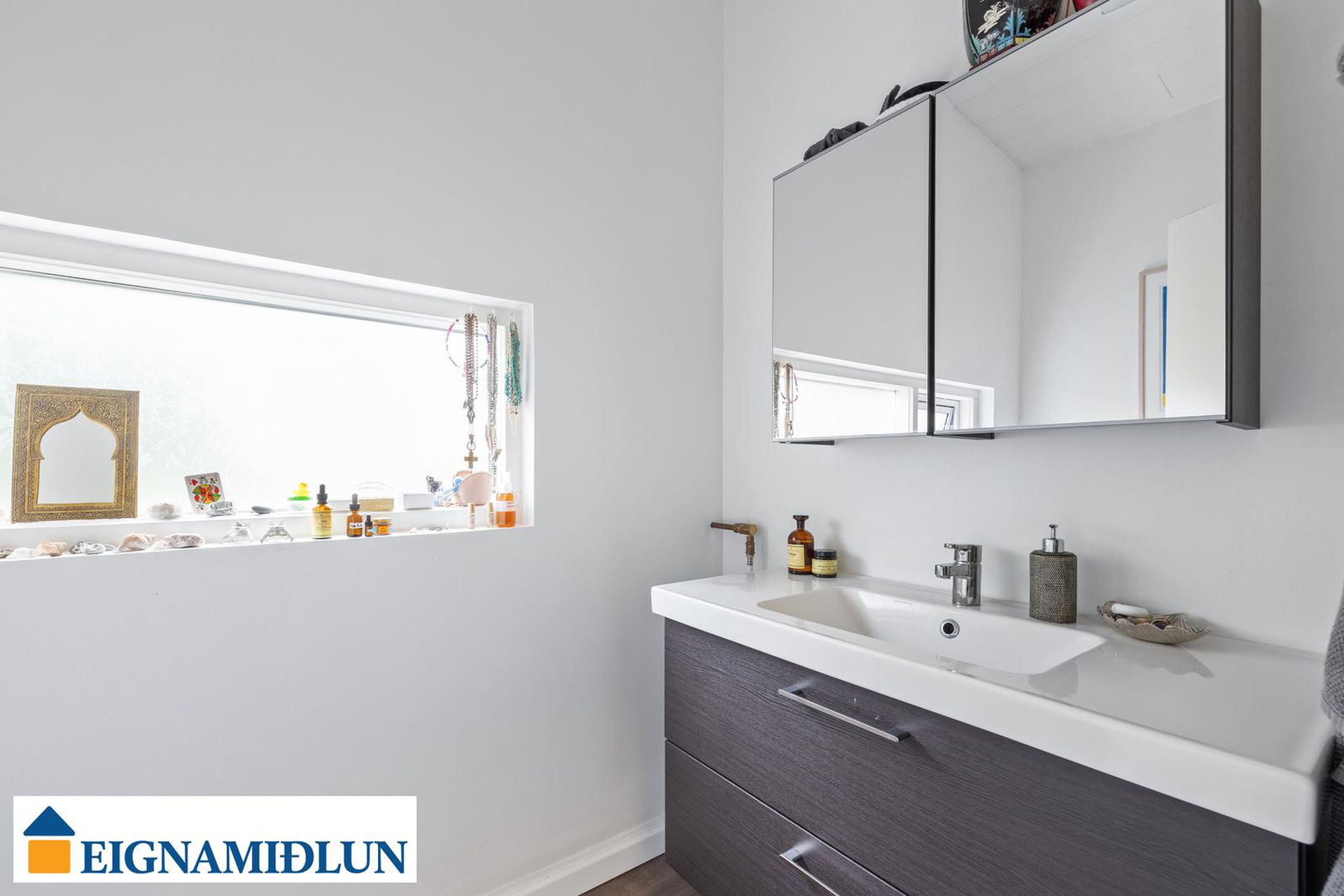 Baðherbergið er með flísum á gólfi og hluta veggja. Inn á baði er sturta, vegghengt salerni og innrétting með skolvask. Góð þvottaaðstaða með innréttingu og efri skápum. Tveir opnanlegir gluggar.