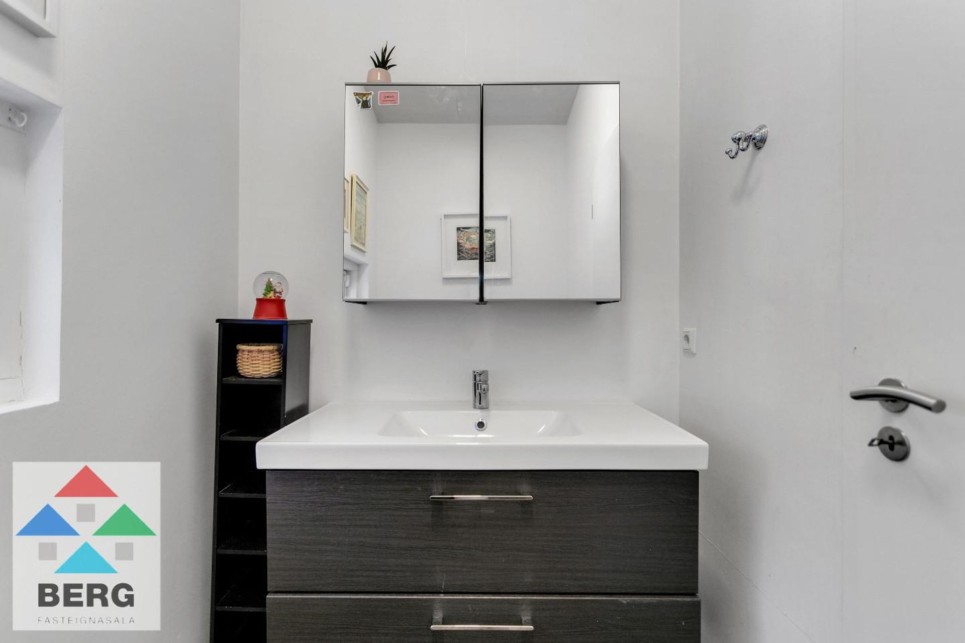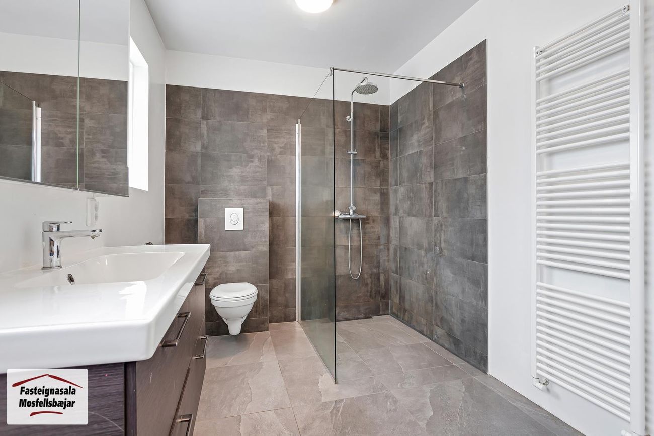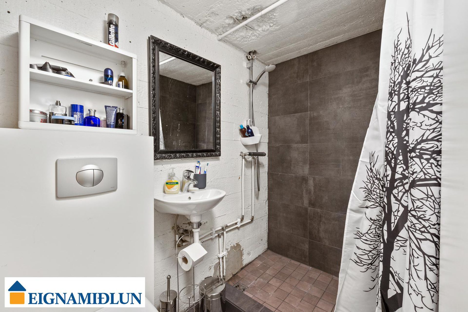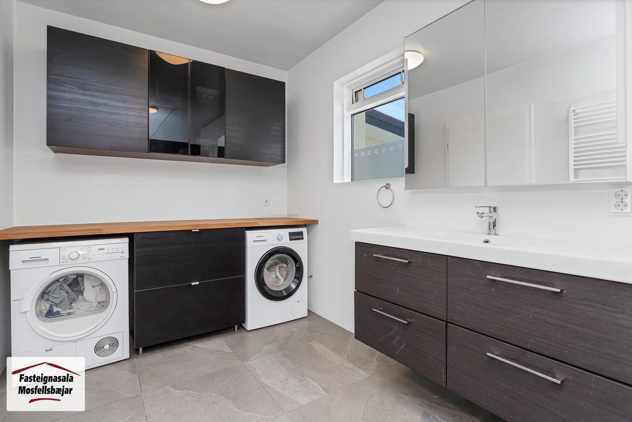 Baðherbergið er með flísum á gólfi og hluta veggja. Inn á baði er sturta, vegghengt salerni og innrétting með skolvask. Góð þvottaaðstaða með innréttingu og efri skápum. Tveir opnanlegir gluggar.