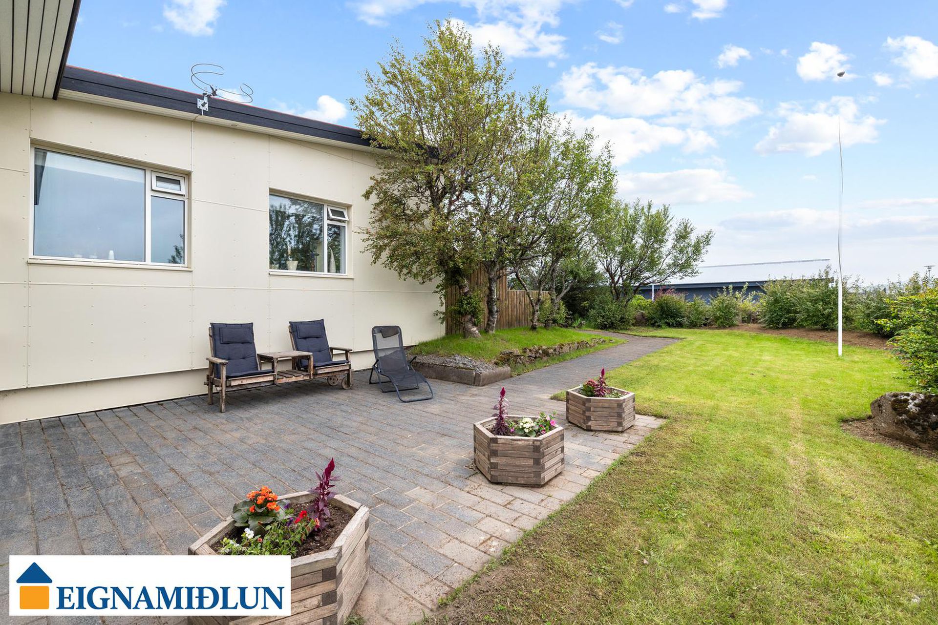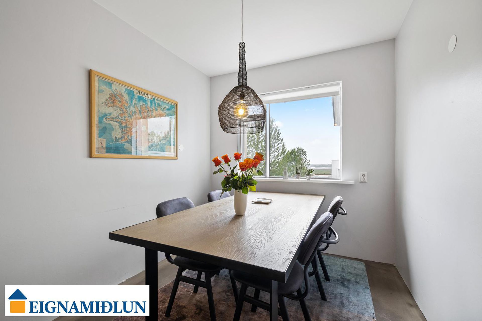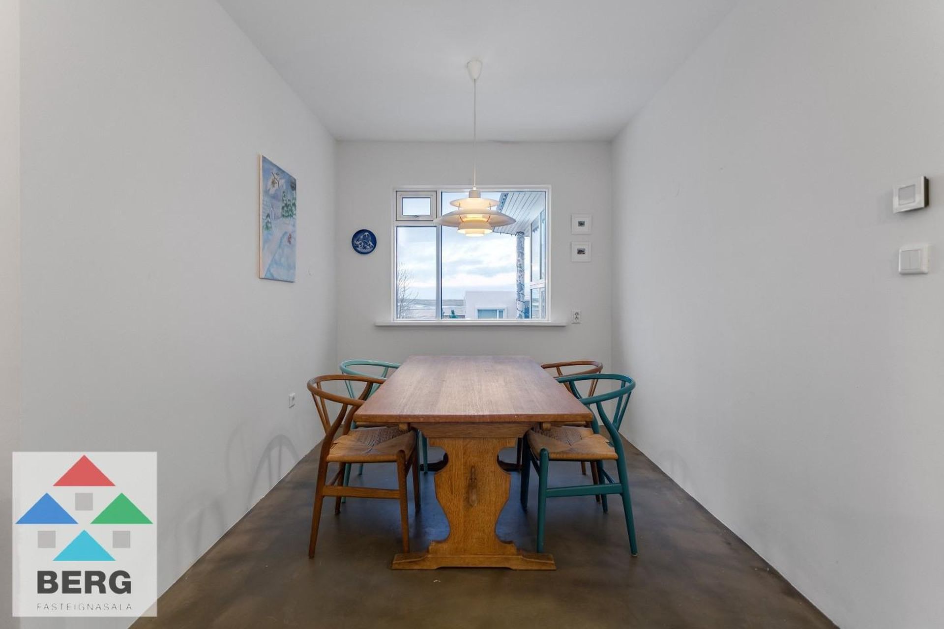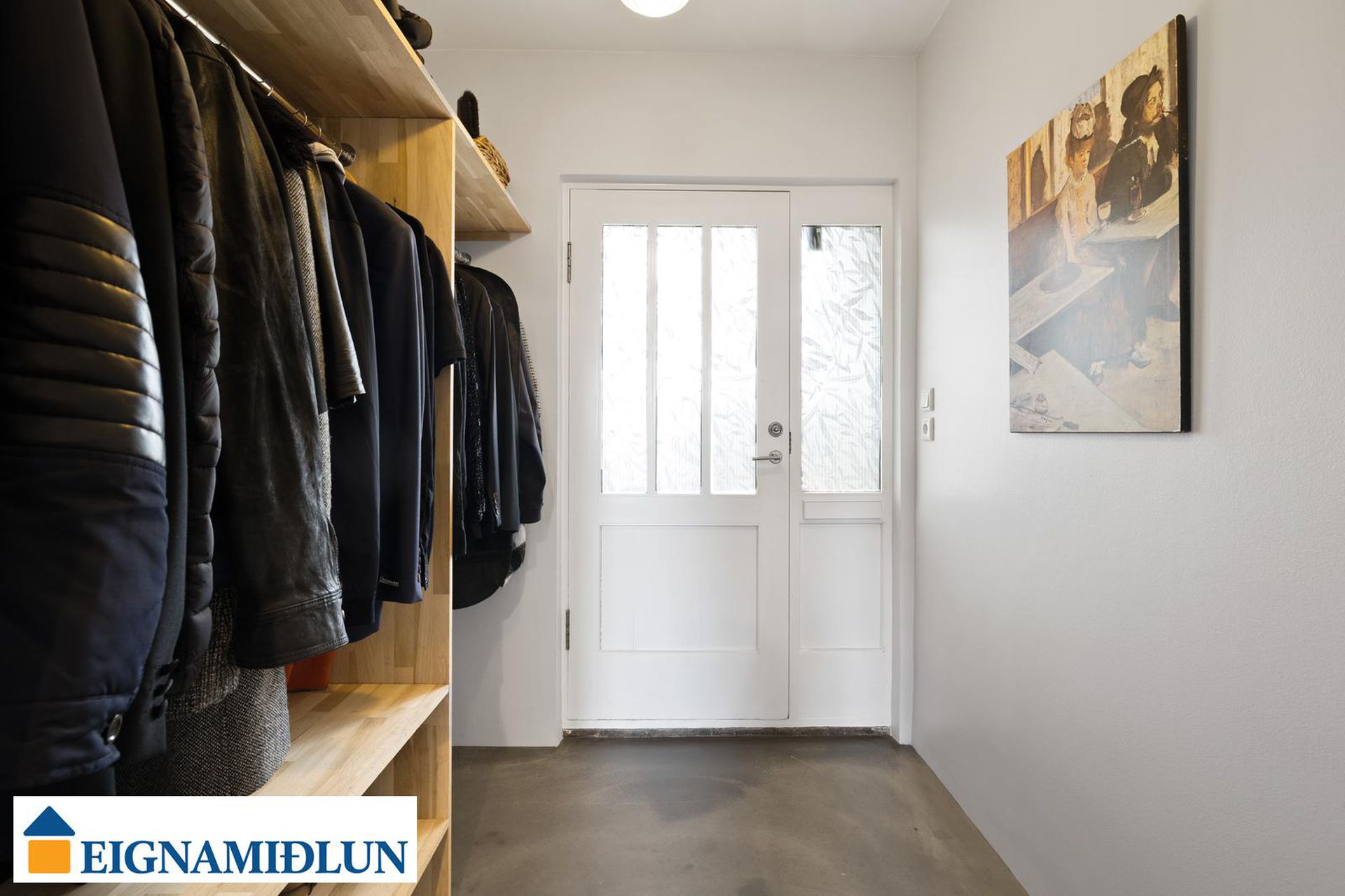 Bílskúr er rúmgóður og með rafdrifinni hurð. Innaf bílskúr er