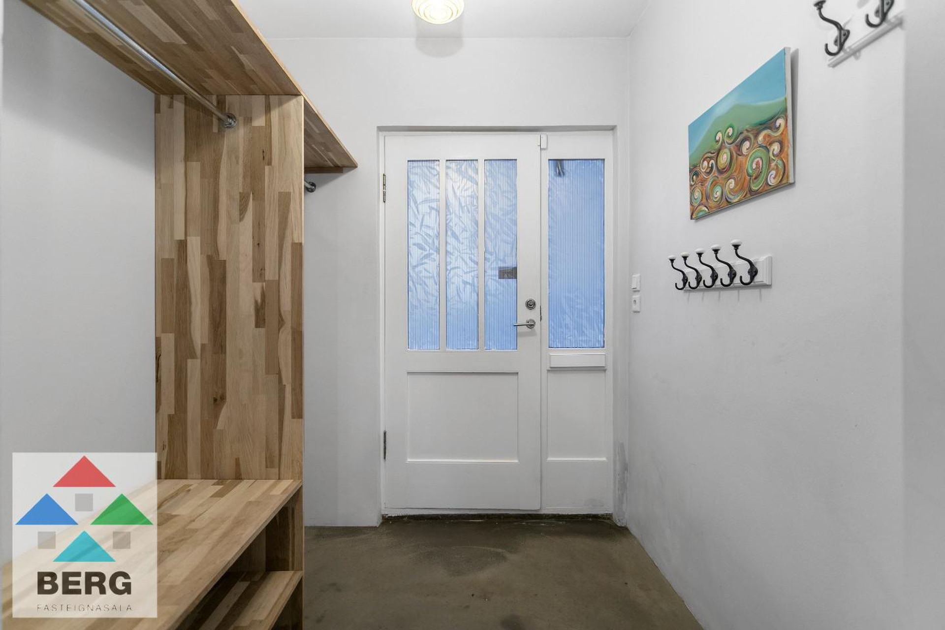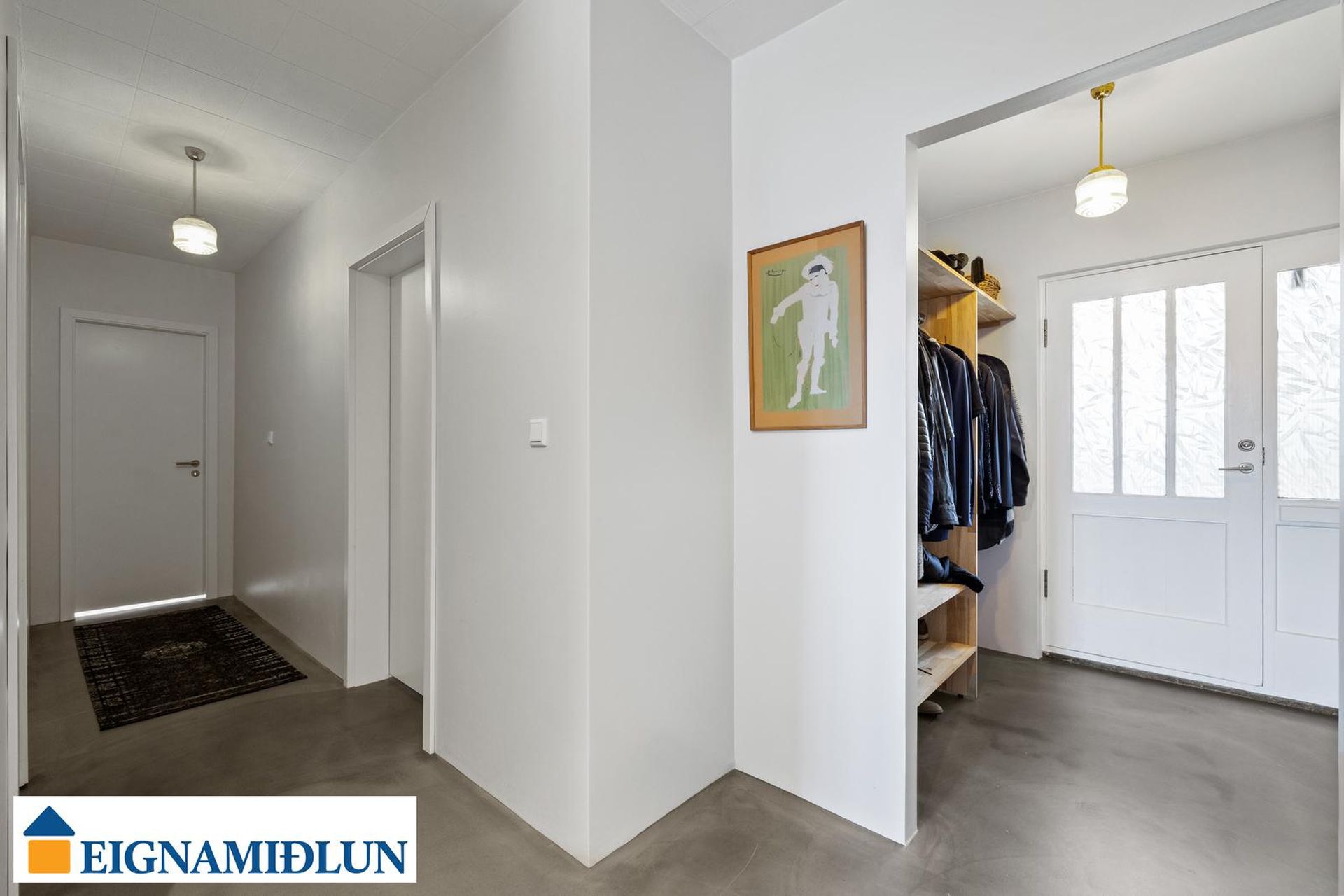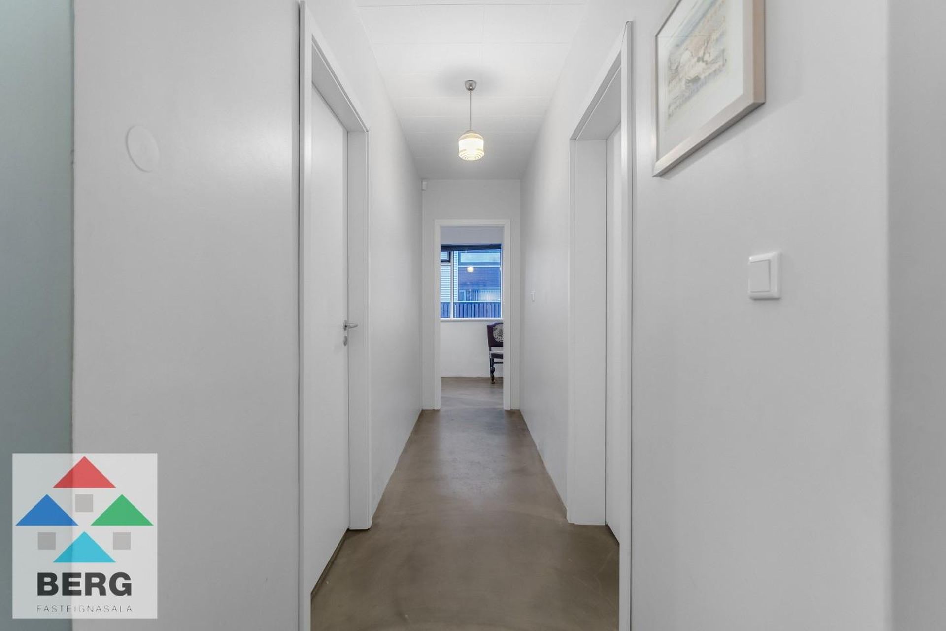gangur sem leiðir að svefnherbergjum og baðherbergi en einnig að hurð út í garð.