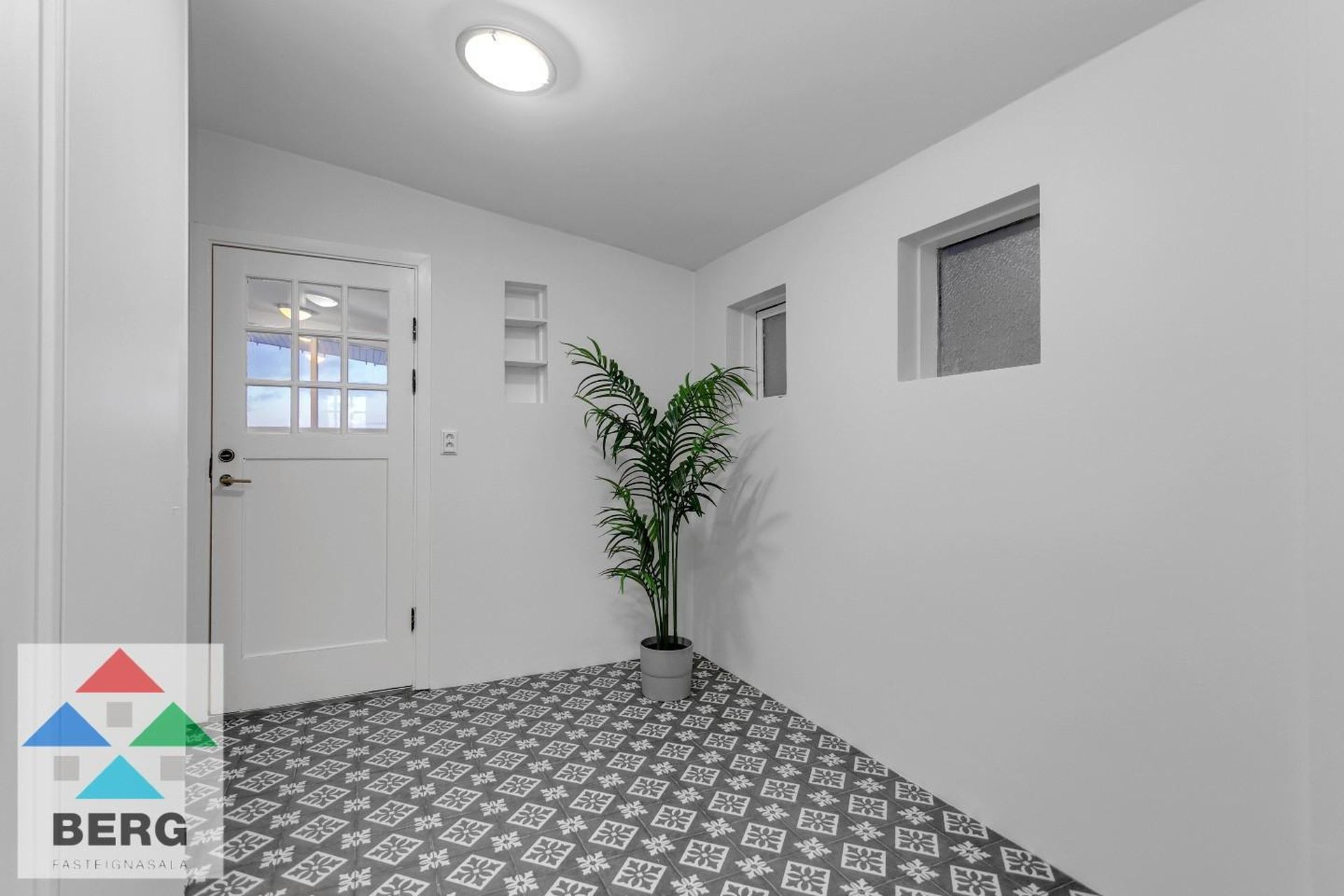 Forstofuherbergi með gluggum sem gæti t.d. verið notað sem skrifstofa eða svefnherbergi. Flísar á gólfi