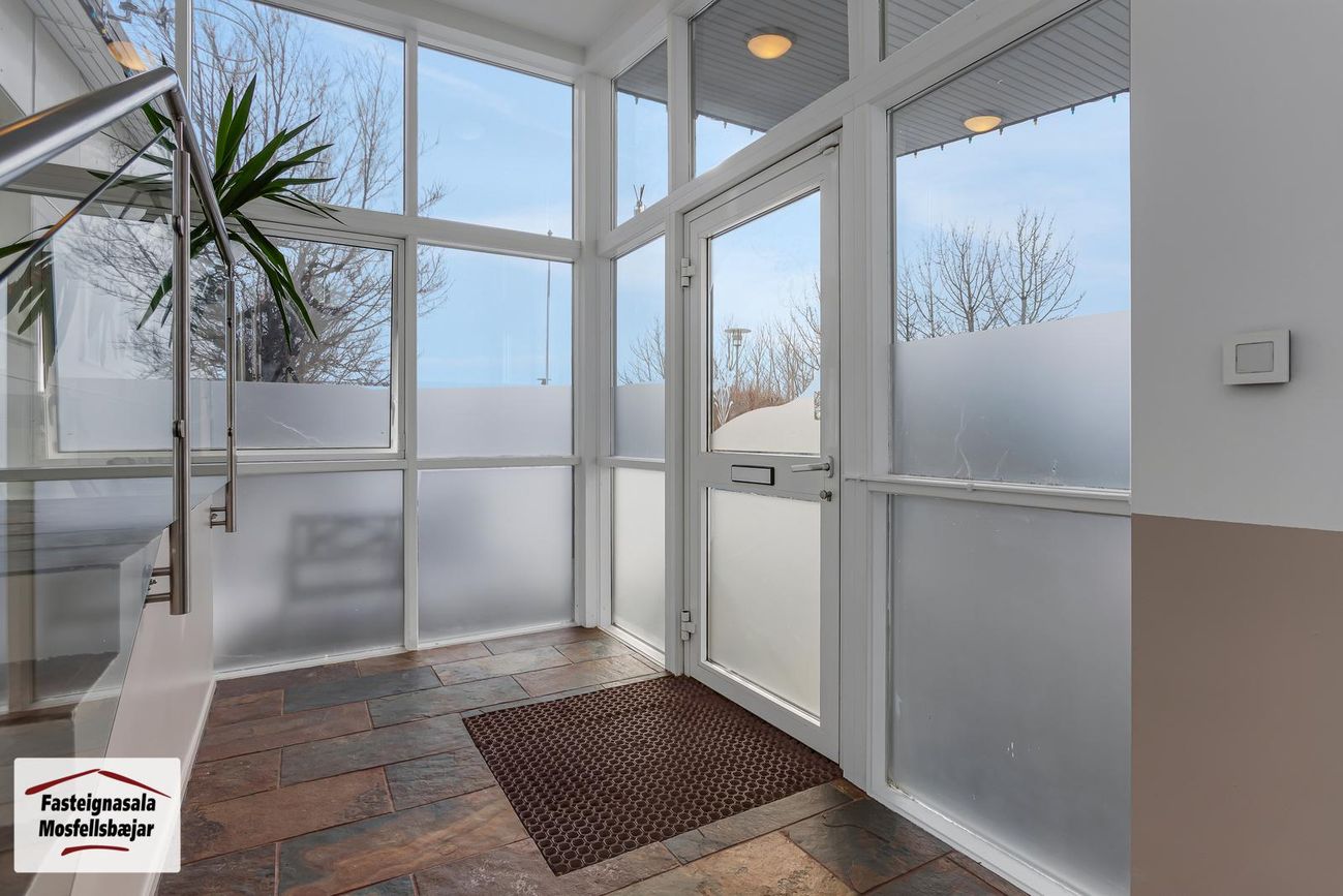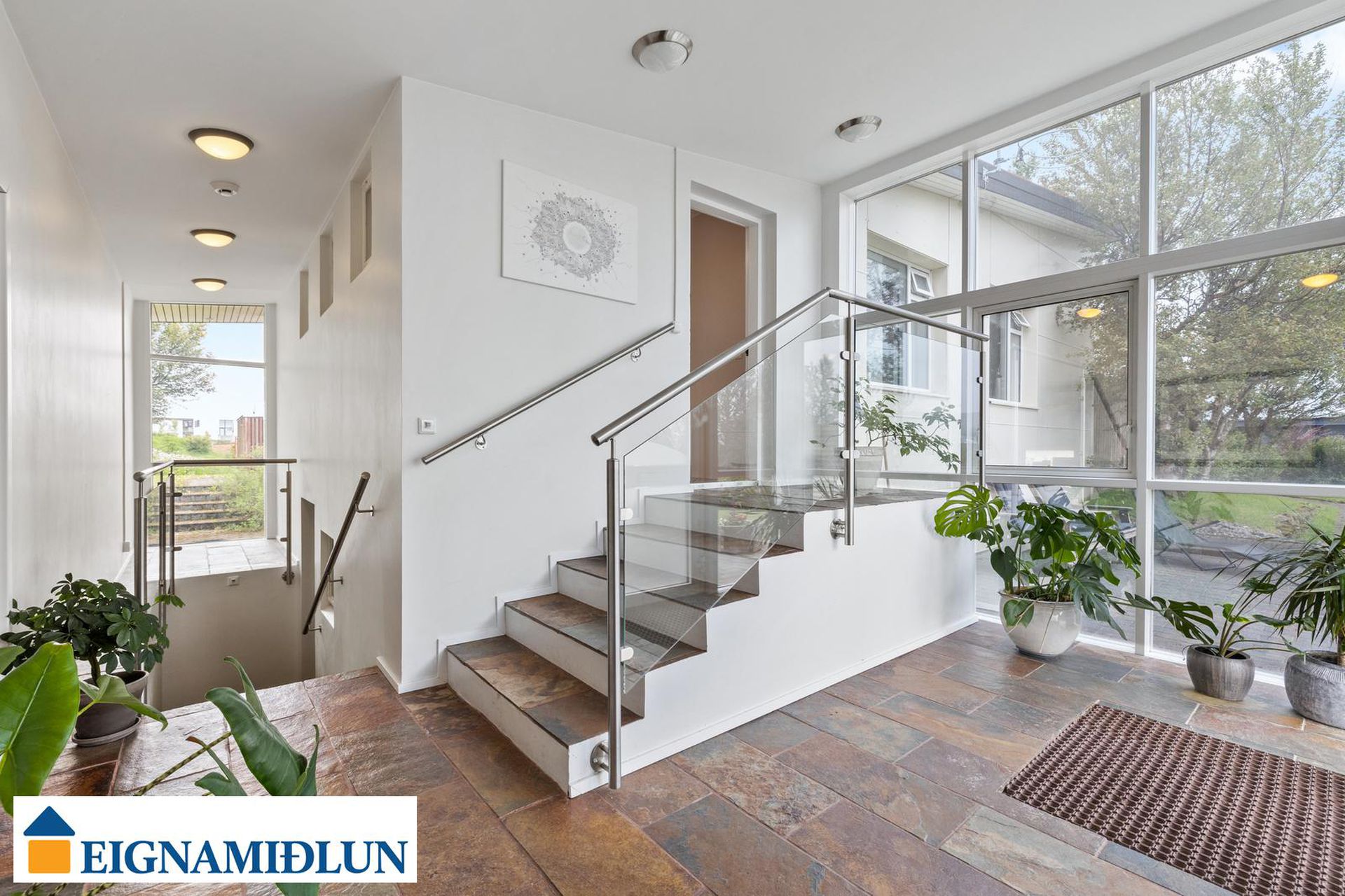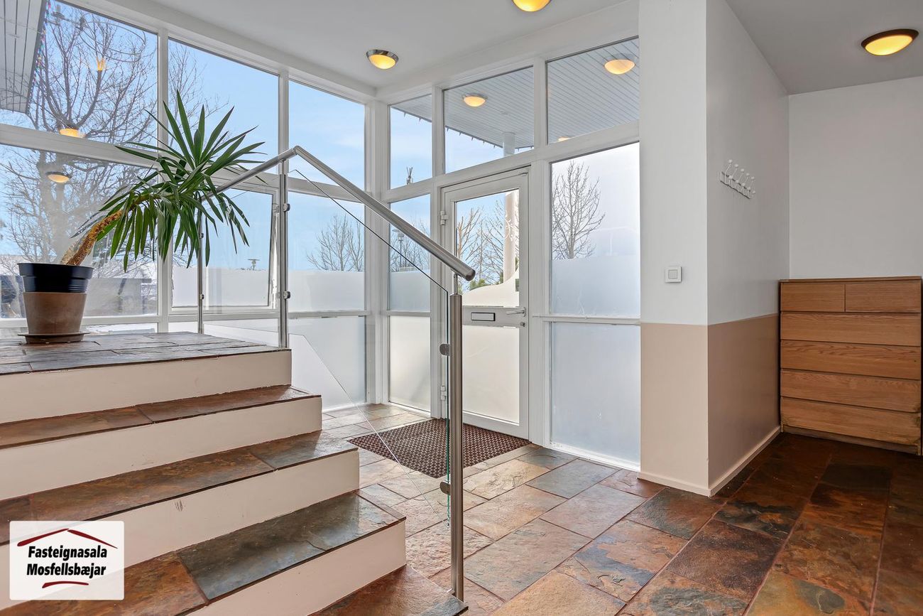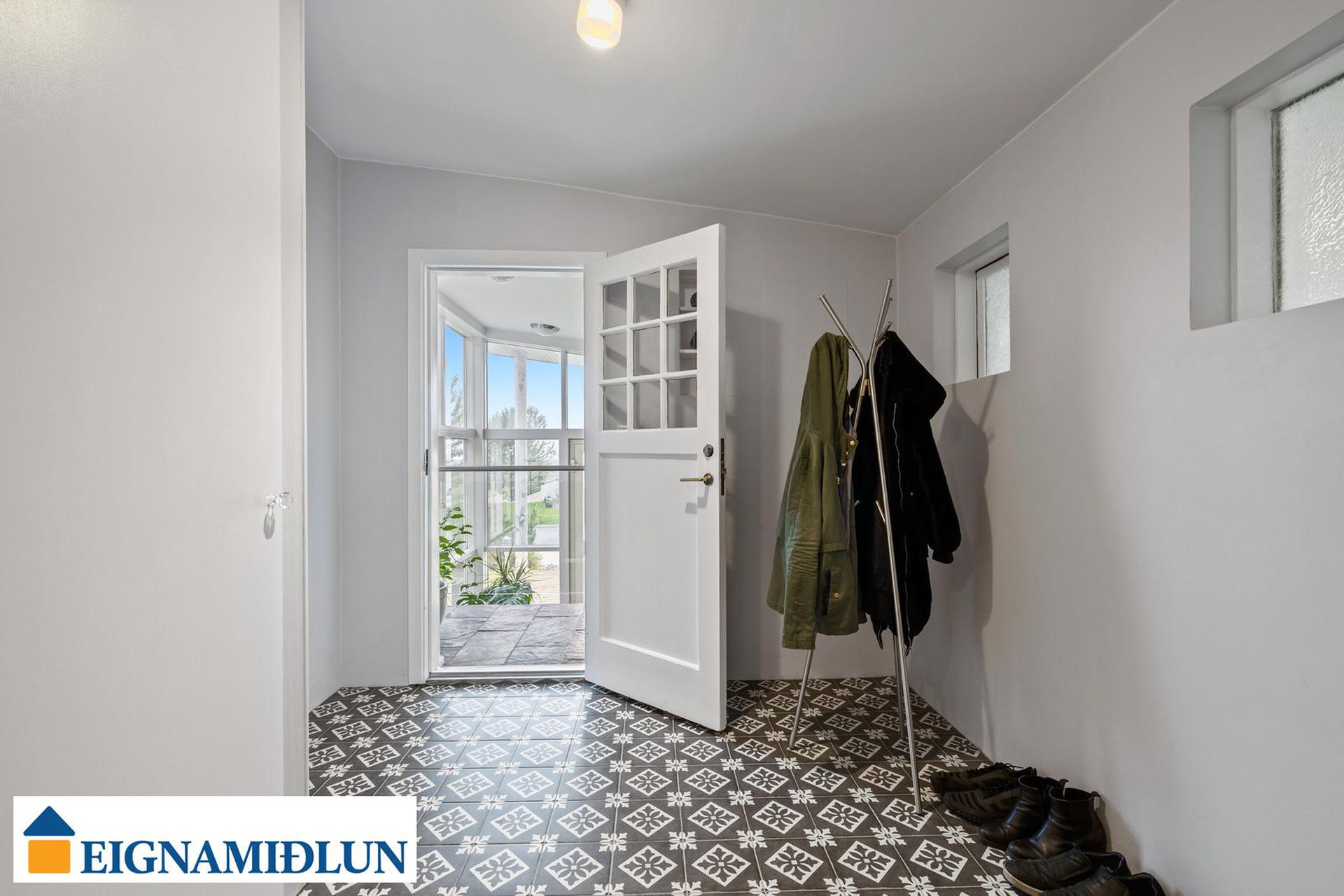 Forstofan tengir saman önnur rými hússins. Rýmið er sérlega bjart og flísalagt. Hægt er að ganga upp í aðalhæð, niður í herbergi neðri hæðar og inn í bílskúr. Öll rýmin eru lokanleg með hurð. Forstofan og bílskúrinn var byggt árið 2007.Aðalhæð:Forstofan er flísalögð