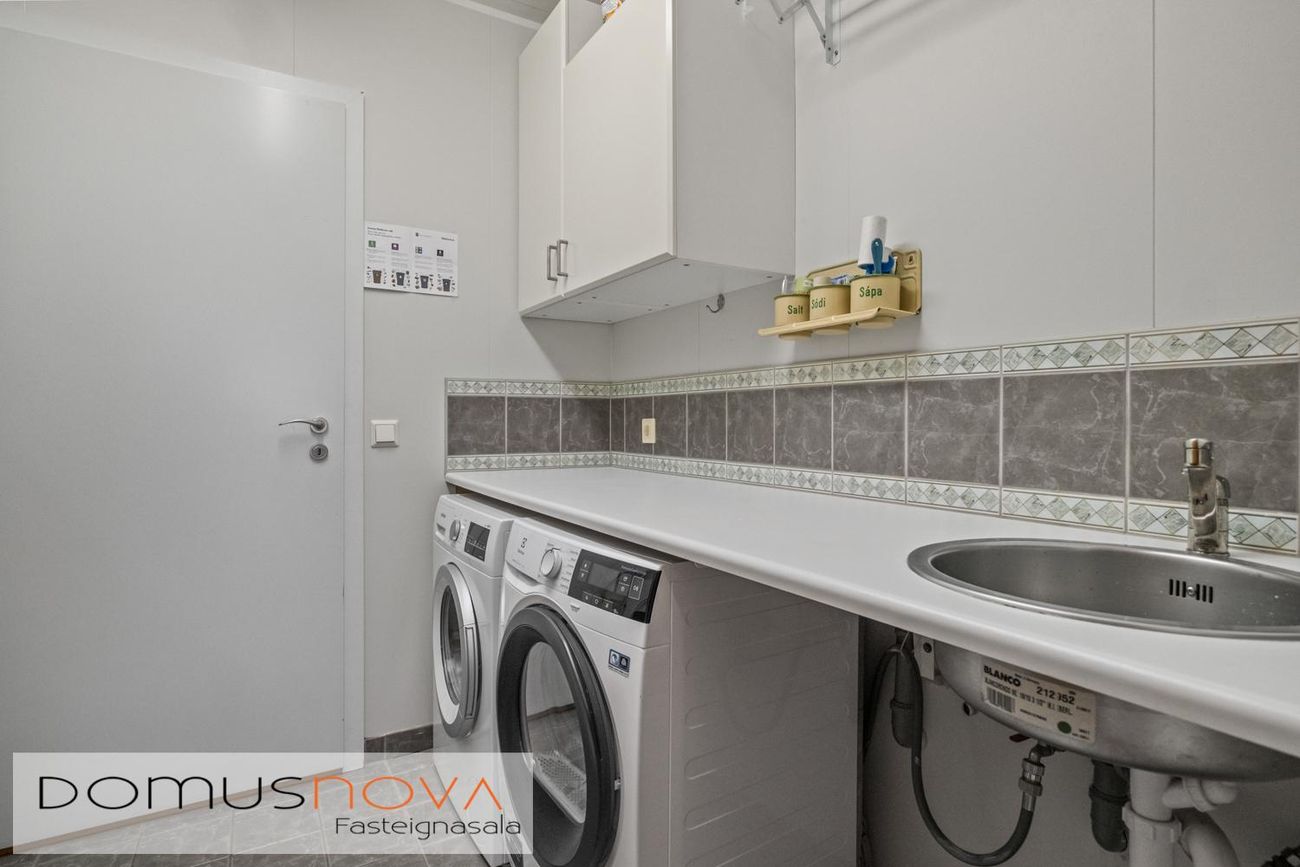 Þvottaherbergi með flísum á gólf og skolvask