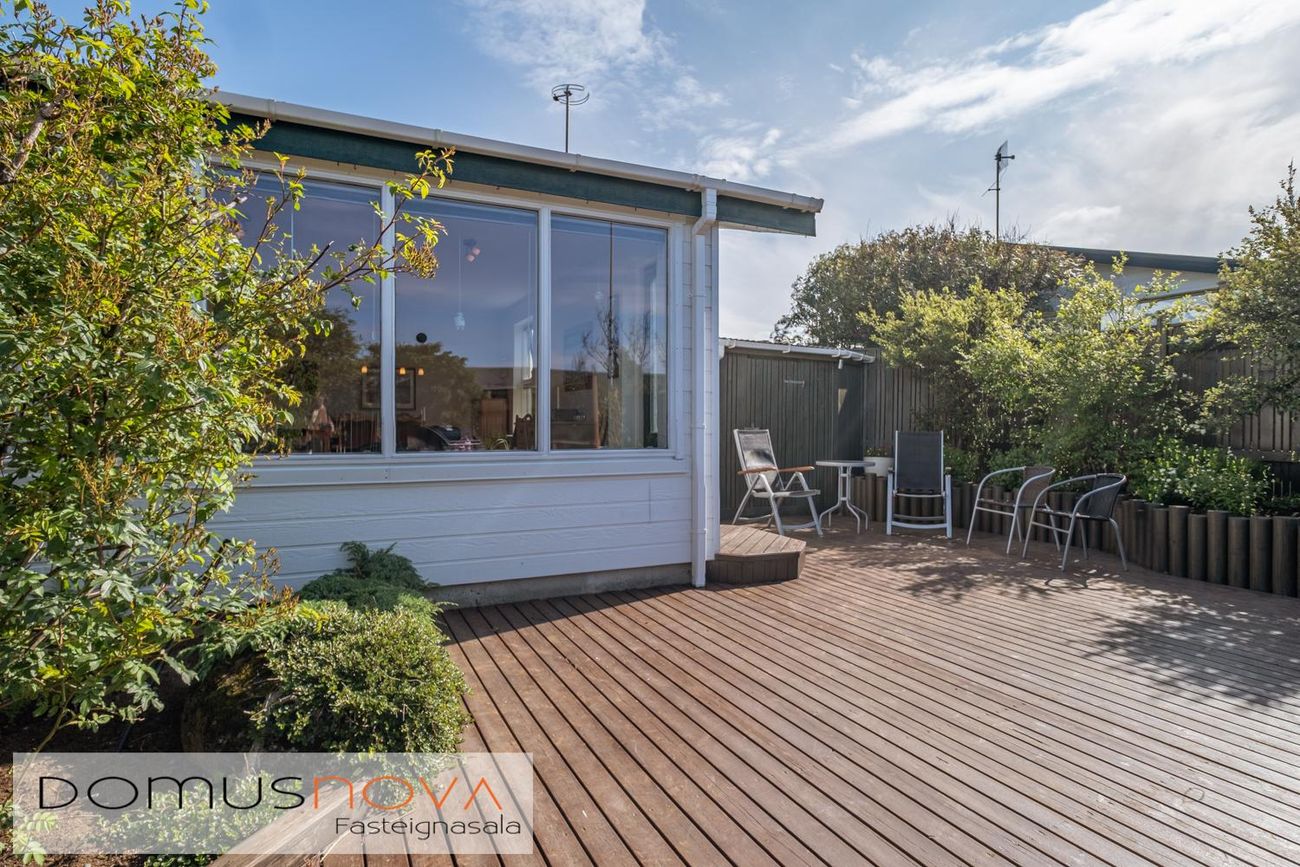 Parhús úr timbri á steyptri plötu með hellulagðri stétt að inngangi. Staðsett í rólegu hverfi nálægt golfvelli og gönguleiðum.