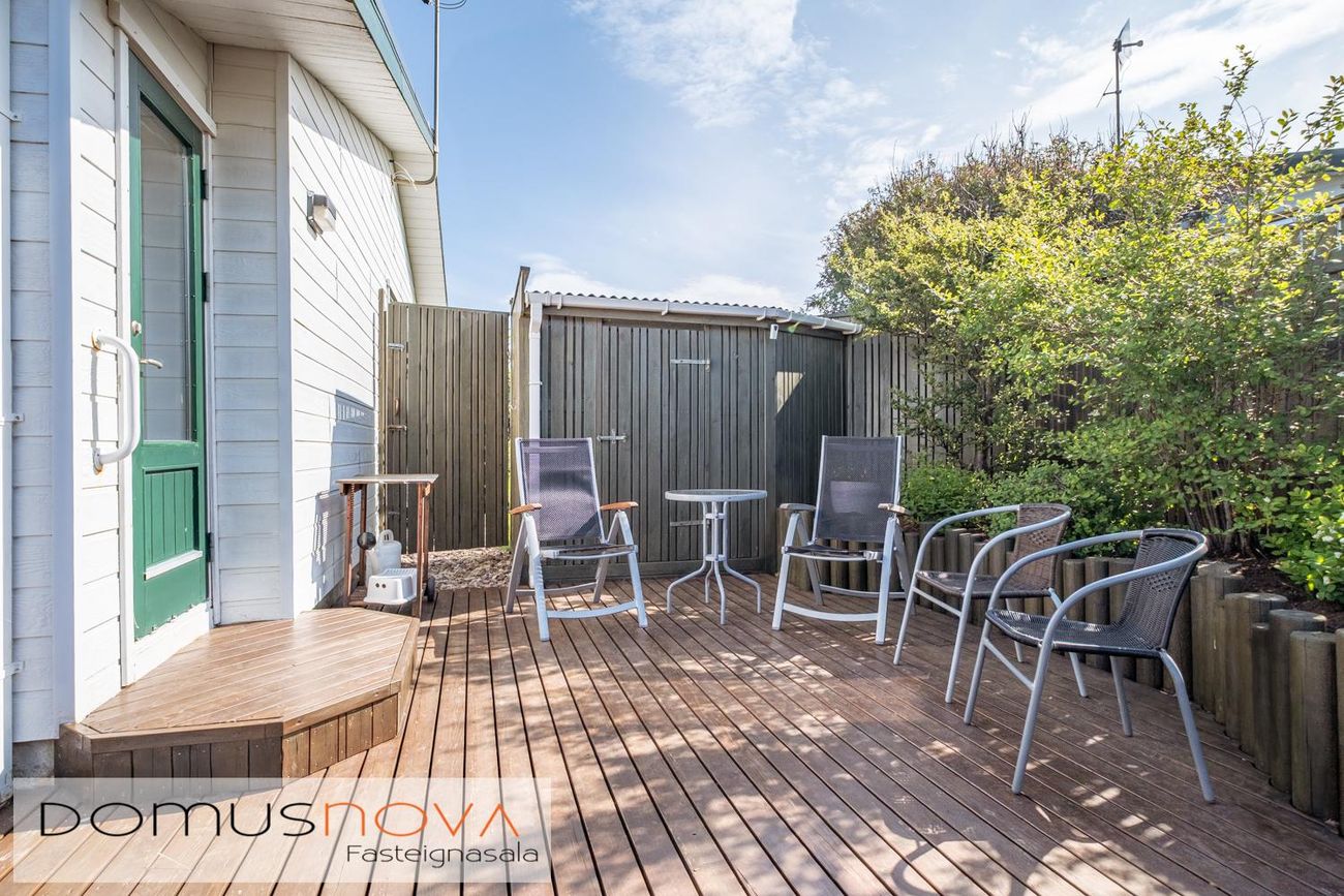 Stofa með sólpalli og gólfhita.