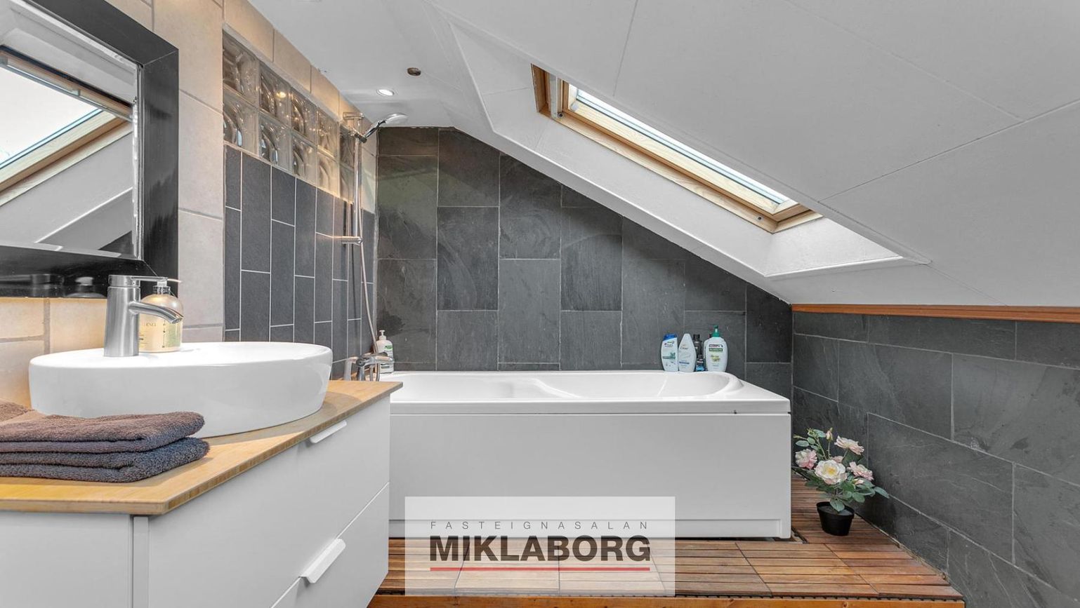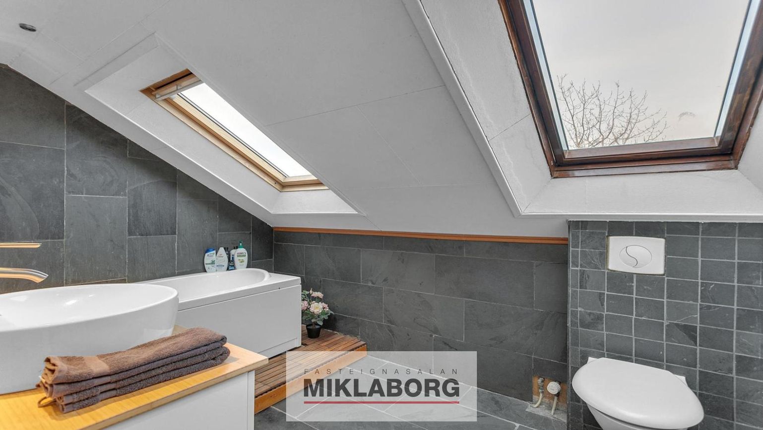 Baðherbergi: Rúmgott baðherbergi sem er flísalagt að mestu, baðkar, upphengt salerni og innrétting með vaski.