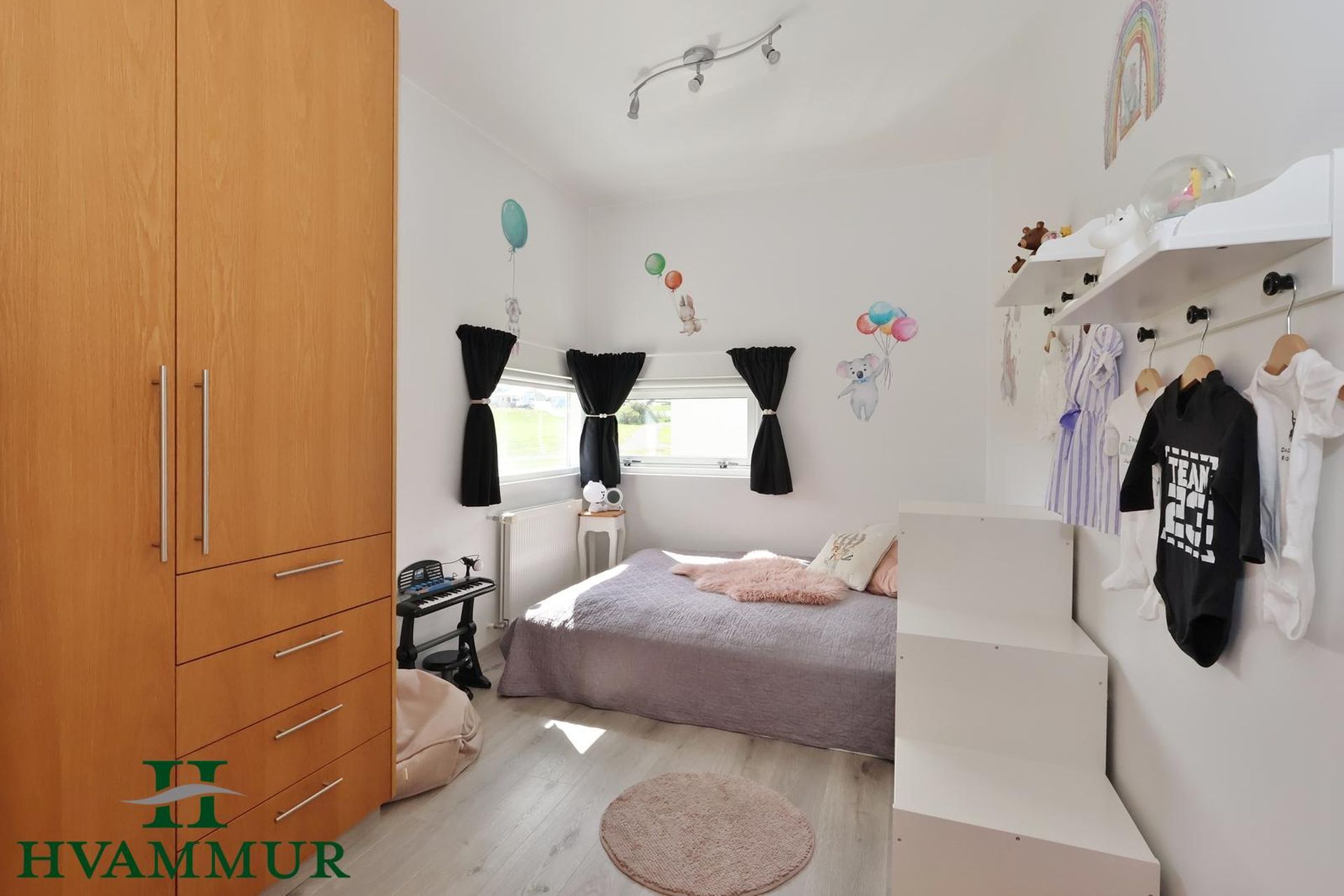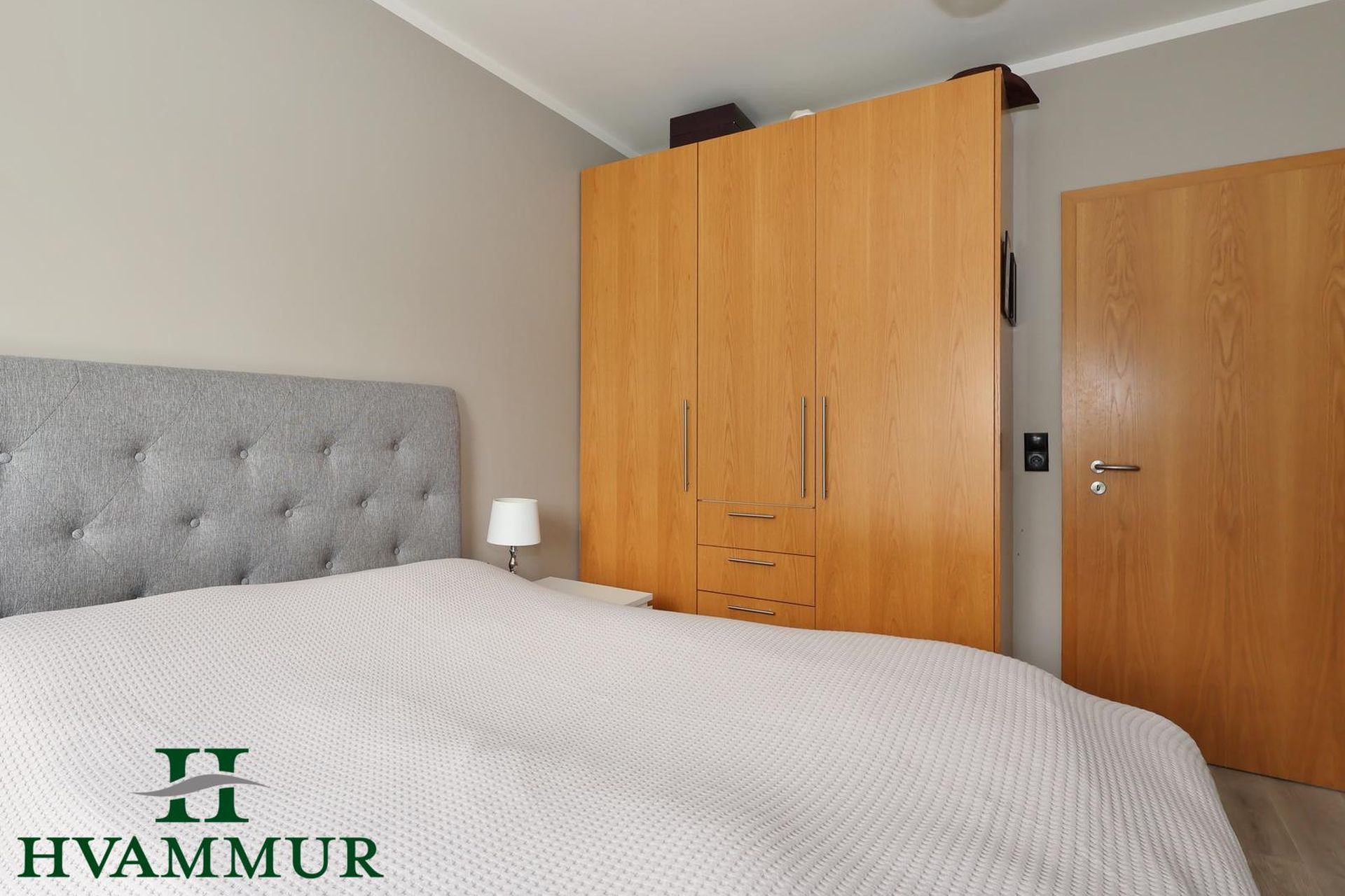 Svefnherbergin eru tvö, bæði með ljósu harð parketi á gólfi og spónlögðum eikar fataskápum. Stærð herbergja er skv. teikningum 9,5 og 12,5 m².