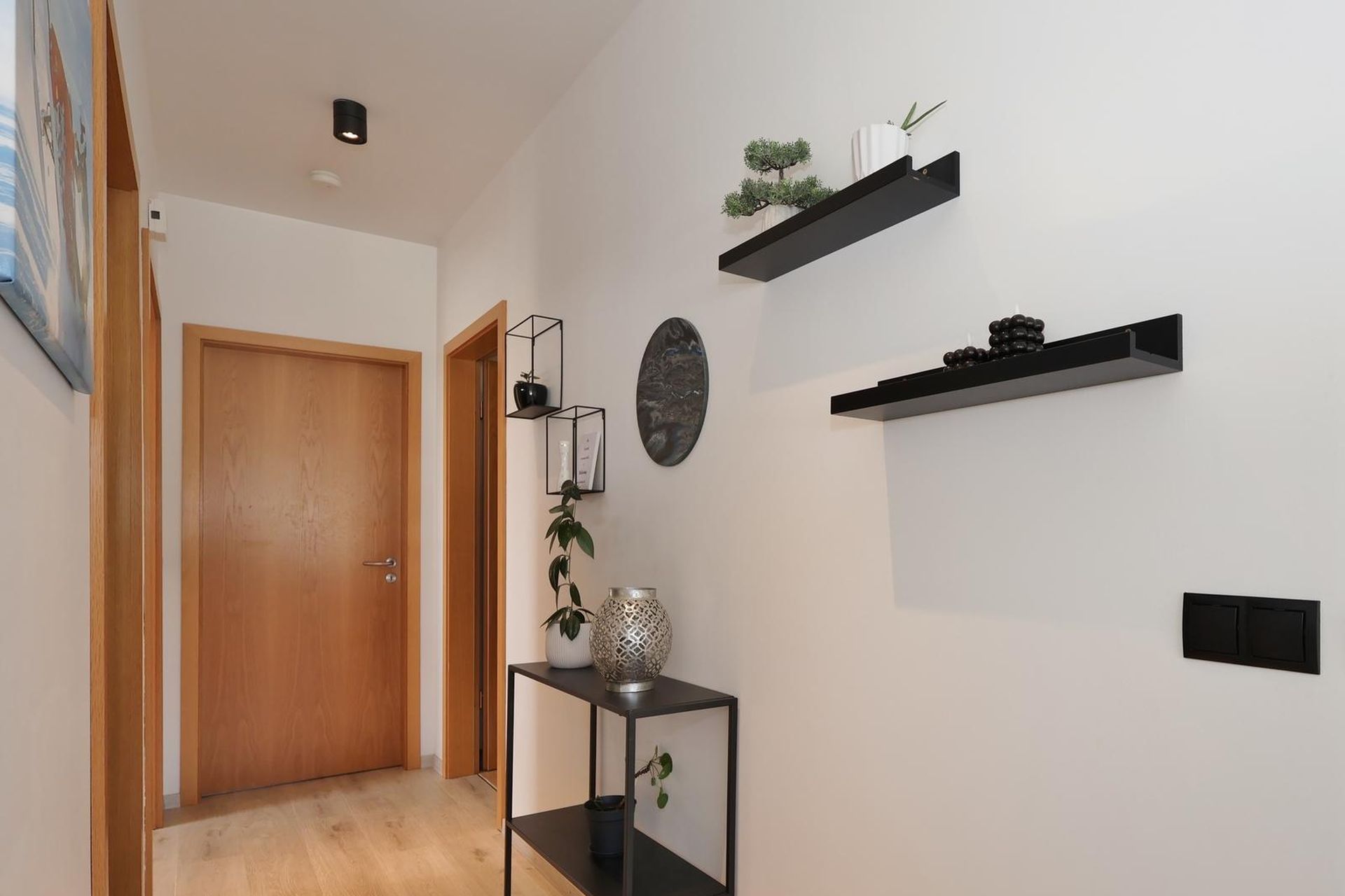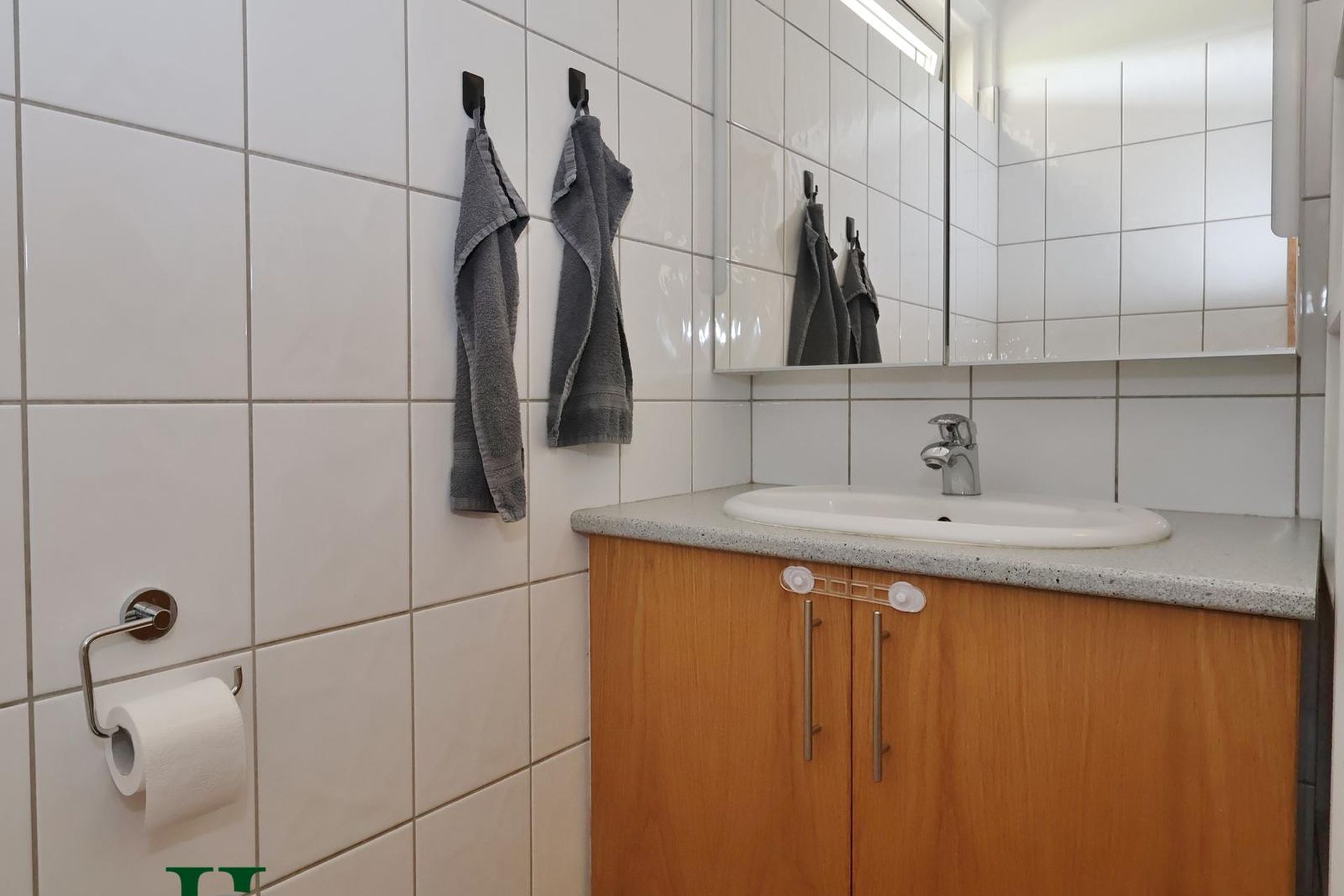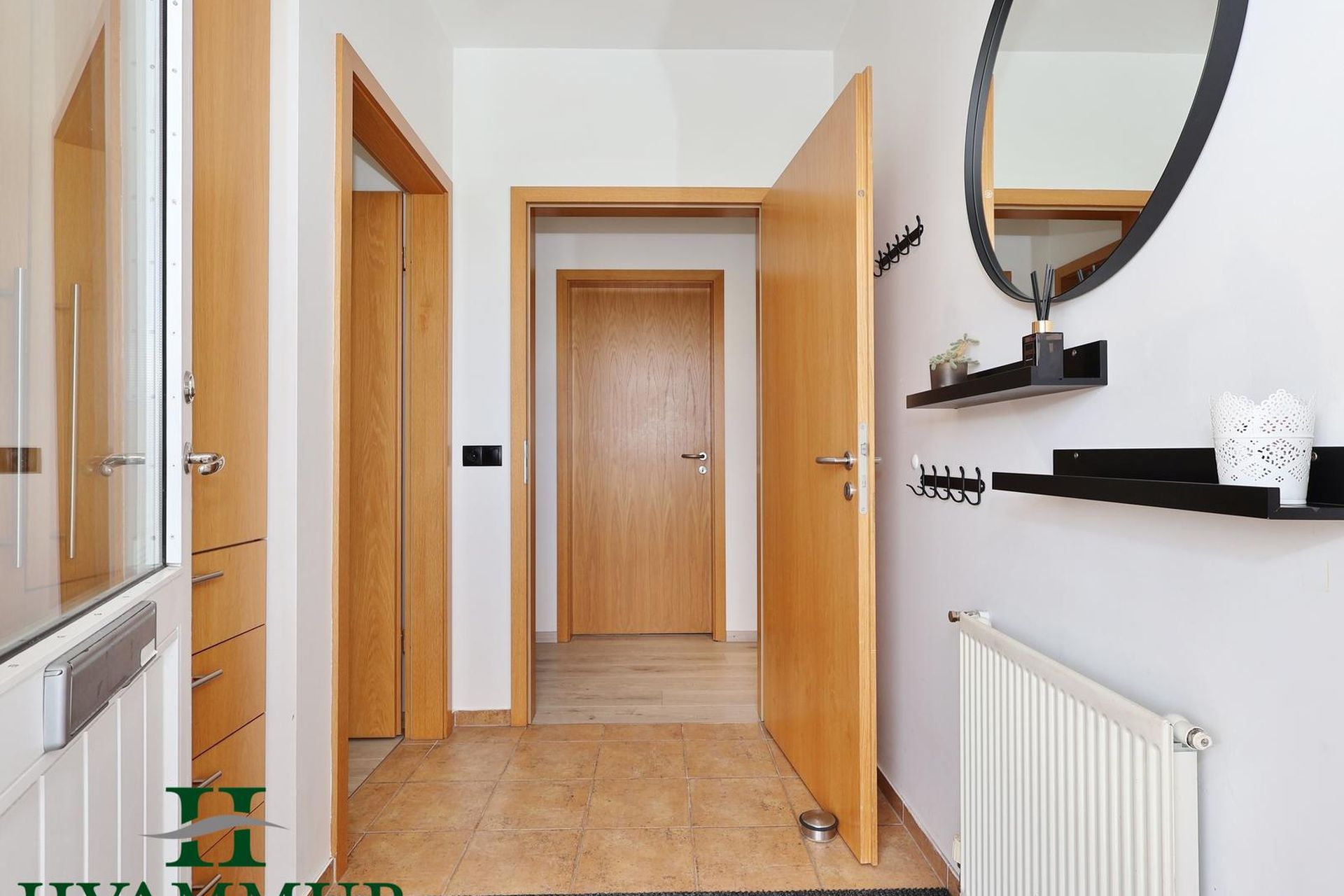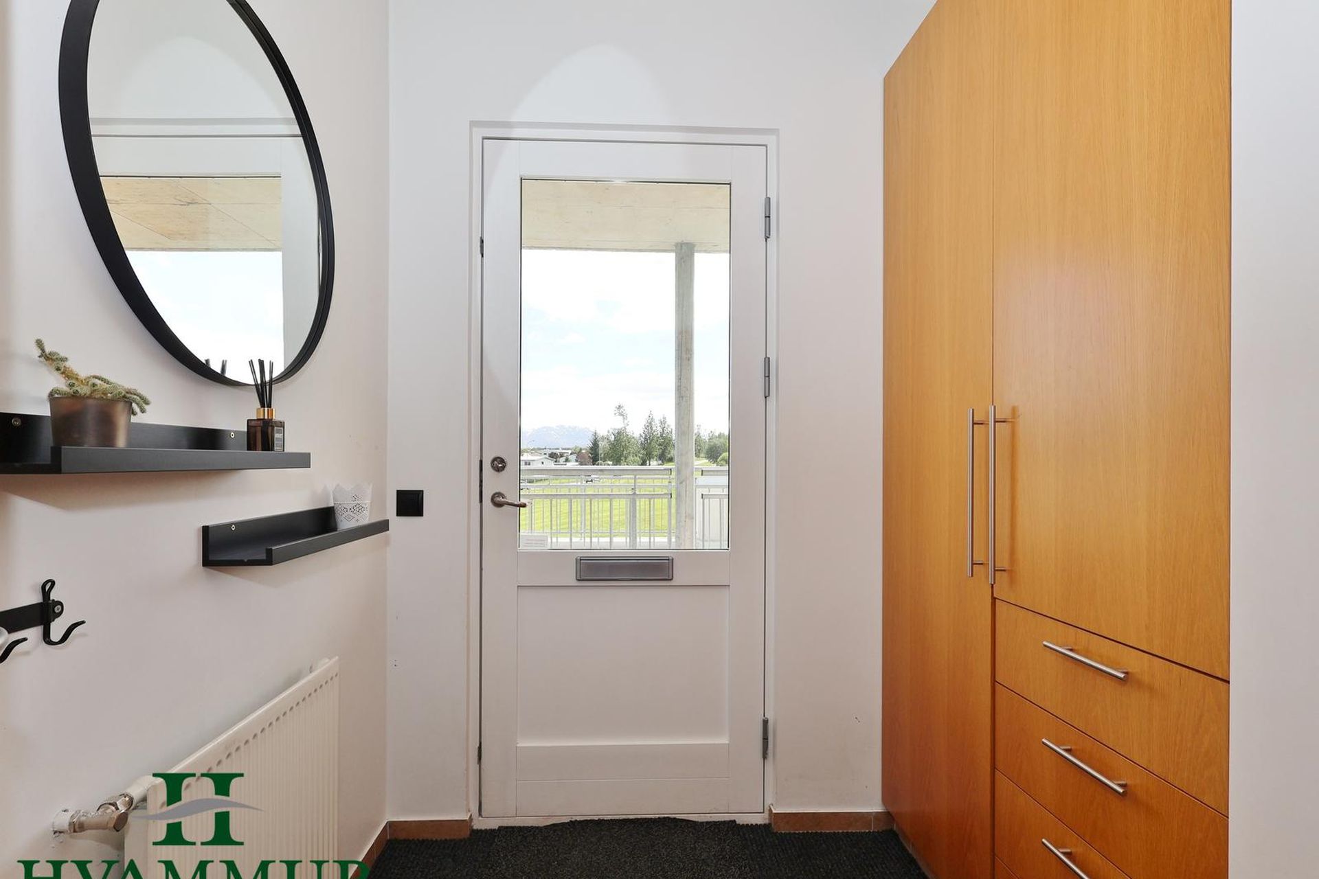 Forstofa er með flísum á gólfi og spónlögðum eikar fataskáp.