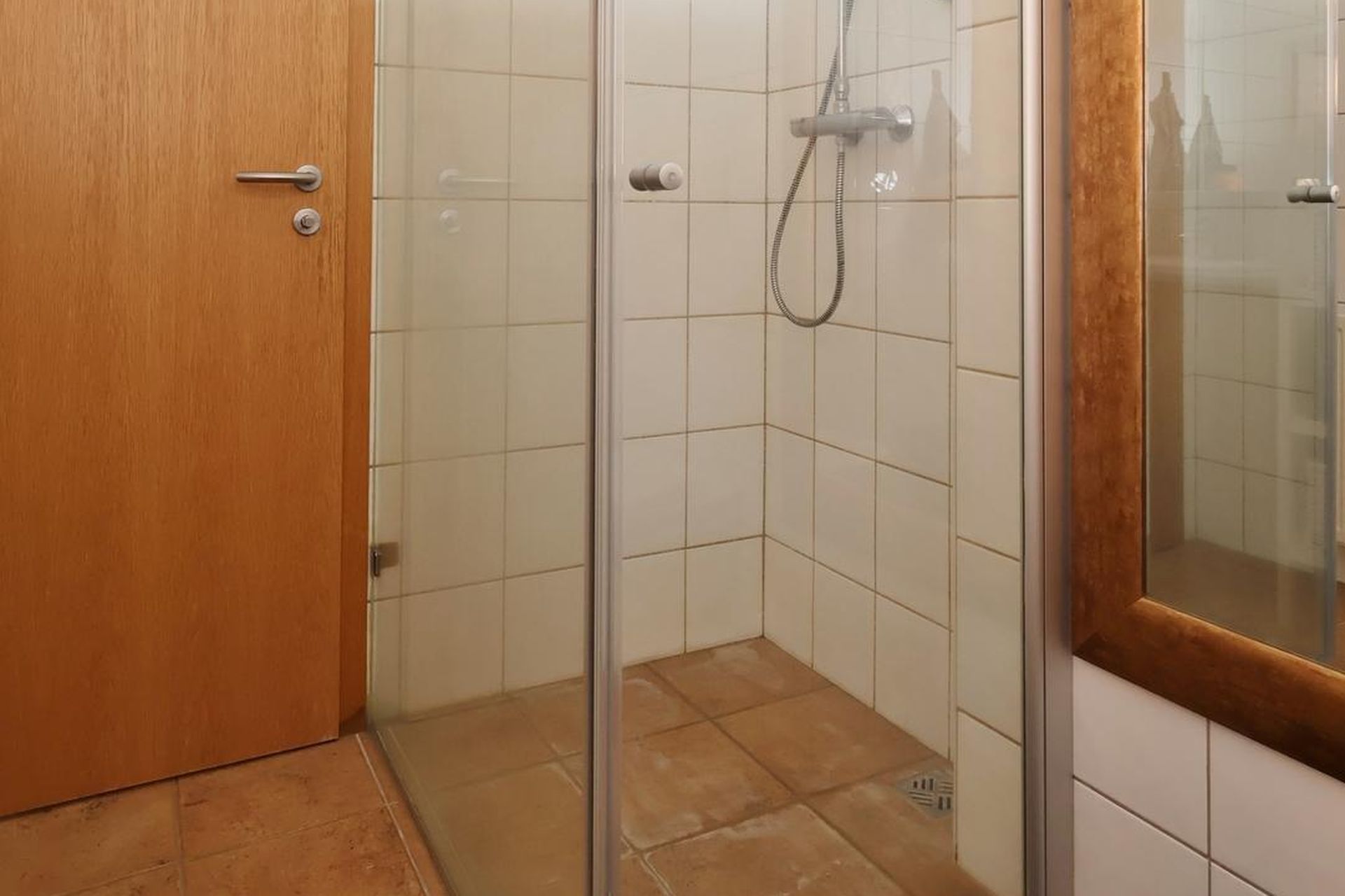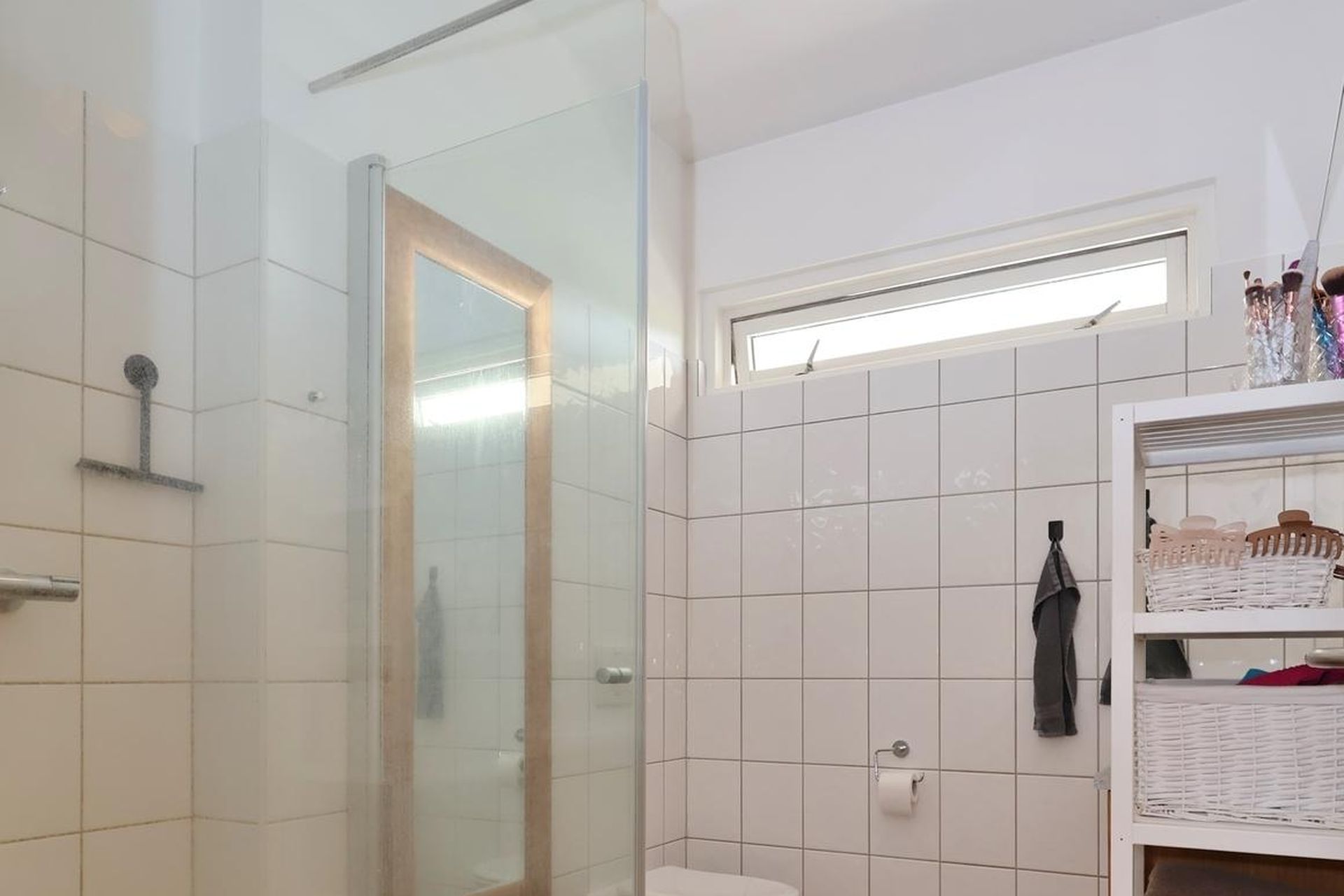 Baðherbergi er með flísum á gólfi og hluta veggja, spónlagðri eikar innréttingu og speglaskáp, upphengdu wc, walk-in sturtu og opnanlegum glugga.