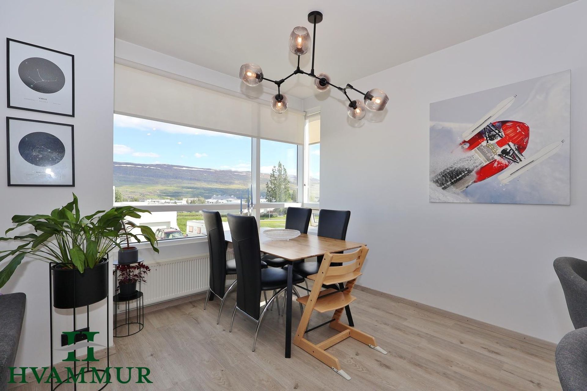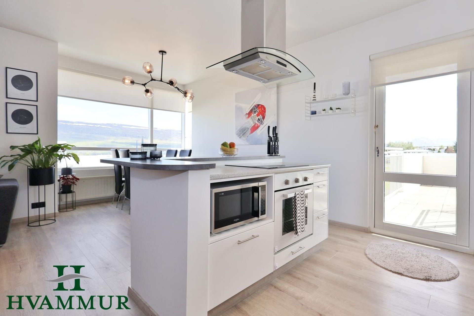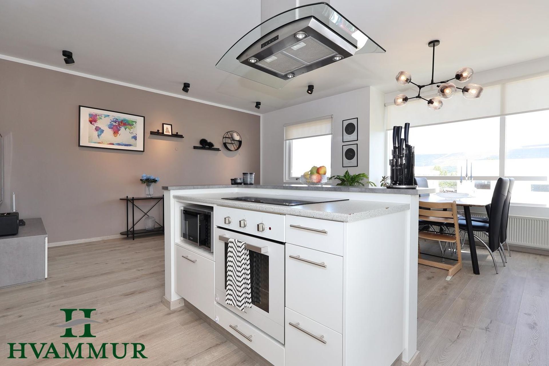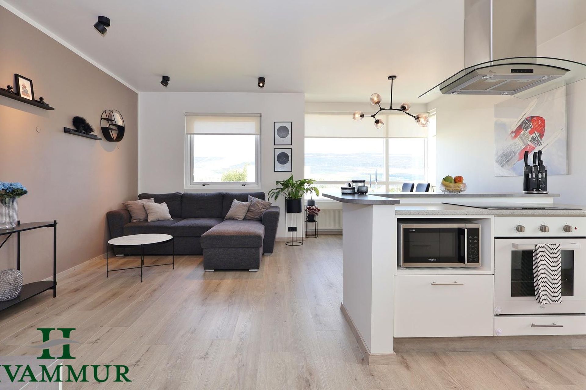 Stofa og eldhús eru í opnu og björtu rými með stórum gluggum og ljósu harð parketi á gólfi.