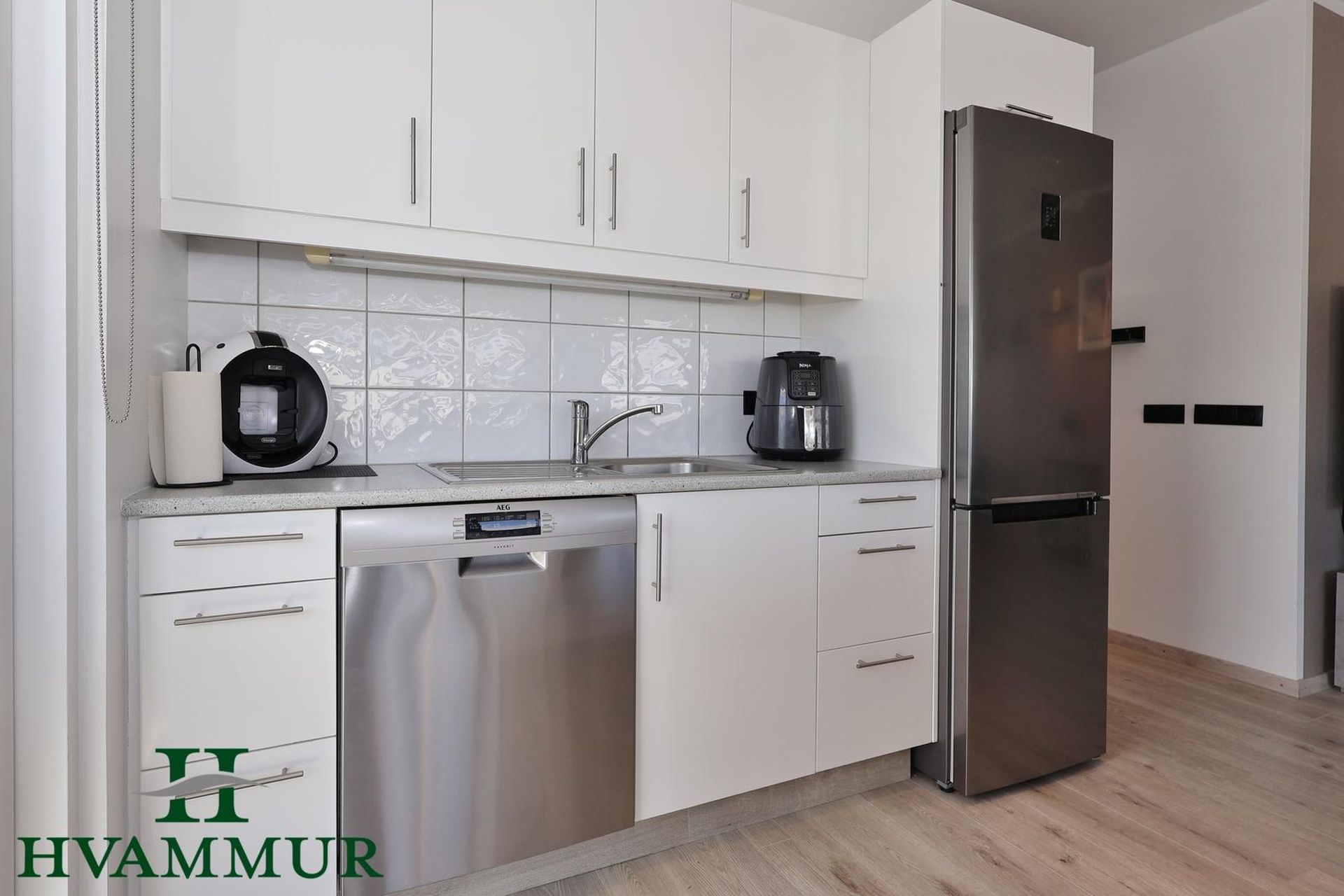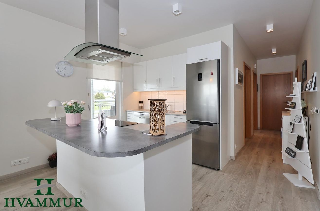 Eldhús, hvít sprautulökkuð innrétting með flísum á milli skápa og eyja með helluborði. Úr eldhúsinu er hurð út á hellulagðar svalir til suðurs.
