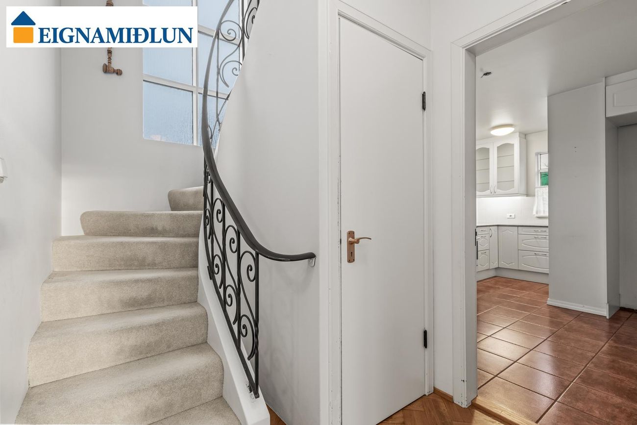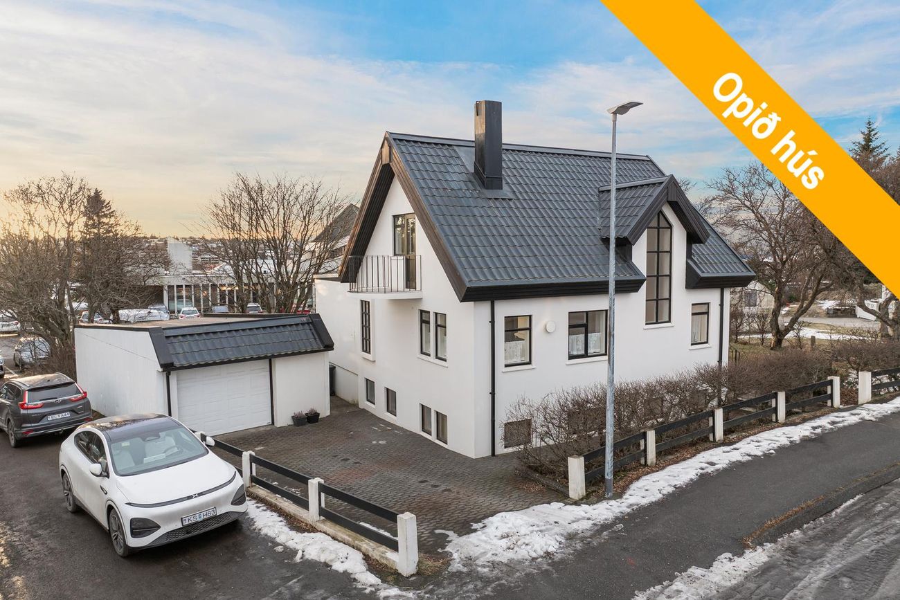 Þriggja hæða hús með rúmgóðum stofum, sérstakan bílskúr, kjallara með sérinngangi og möguleika á aukaíbúð.