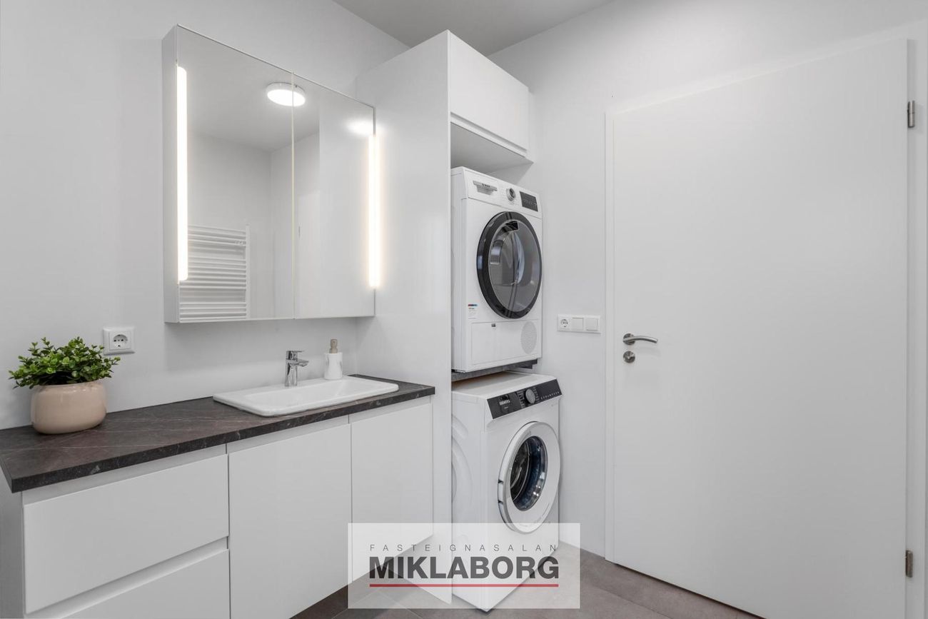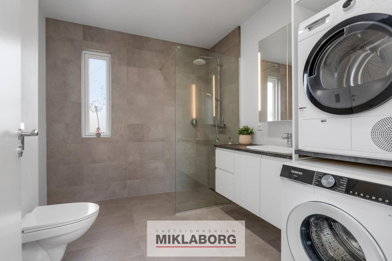 Baðherbergi: er flísalagt í hólf og gólf með sturtu og hvítri innréttingiu, handklæðaofni og upphengdu salerni. Inn á baðherberginu er þvottaaðstaða með tengi fyrir þvottavél og þurrkara.