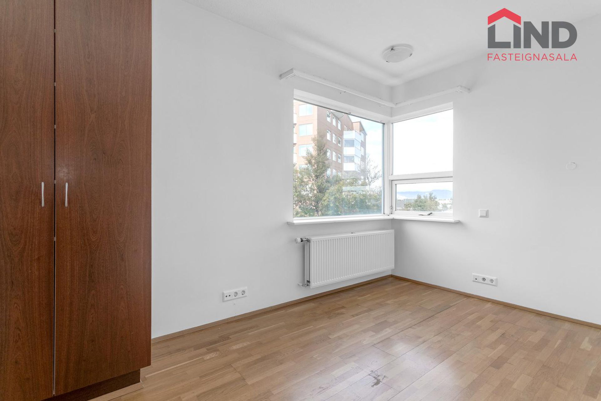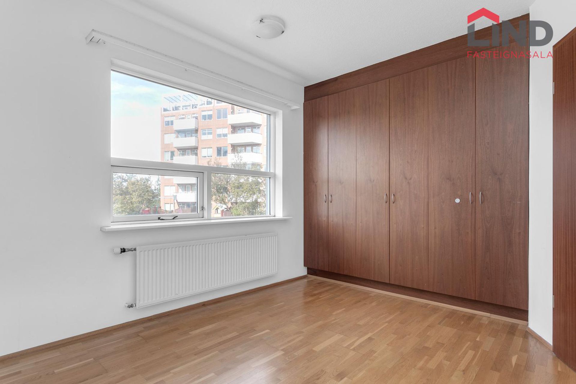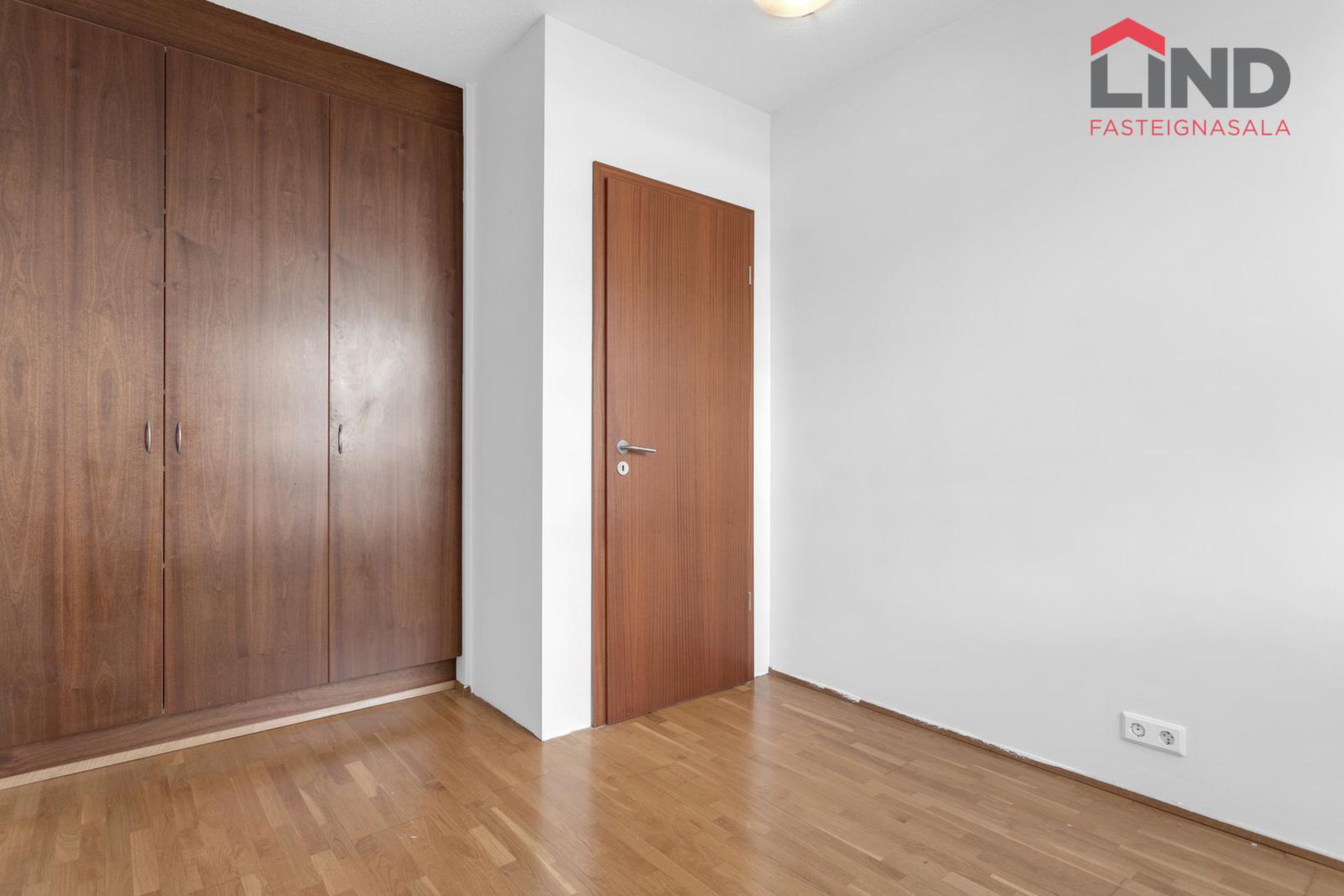 Hjónaherbergi með parketi á gólfi og fataskáp