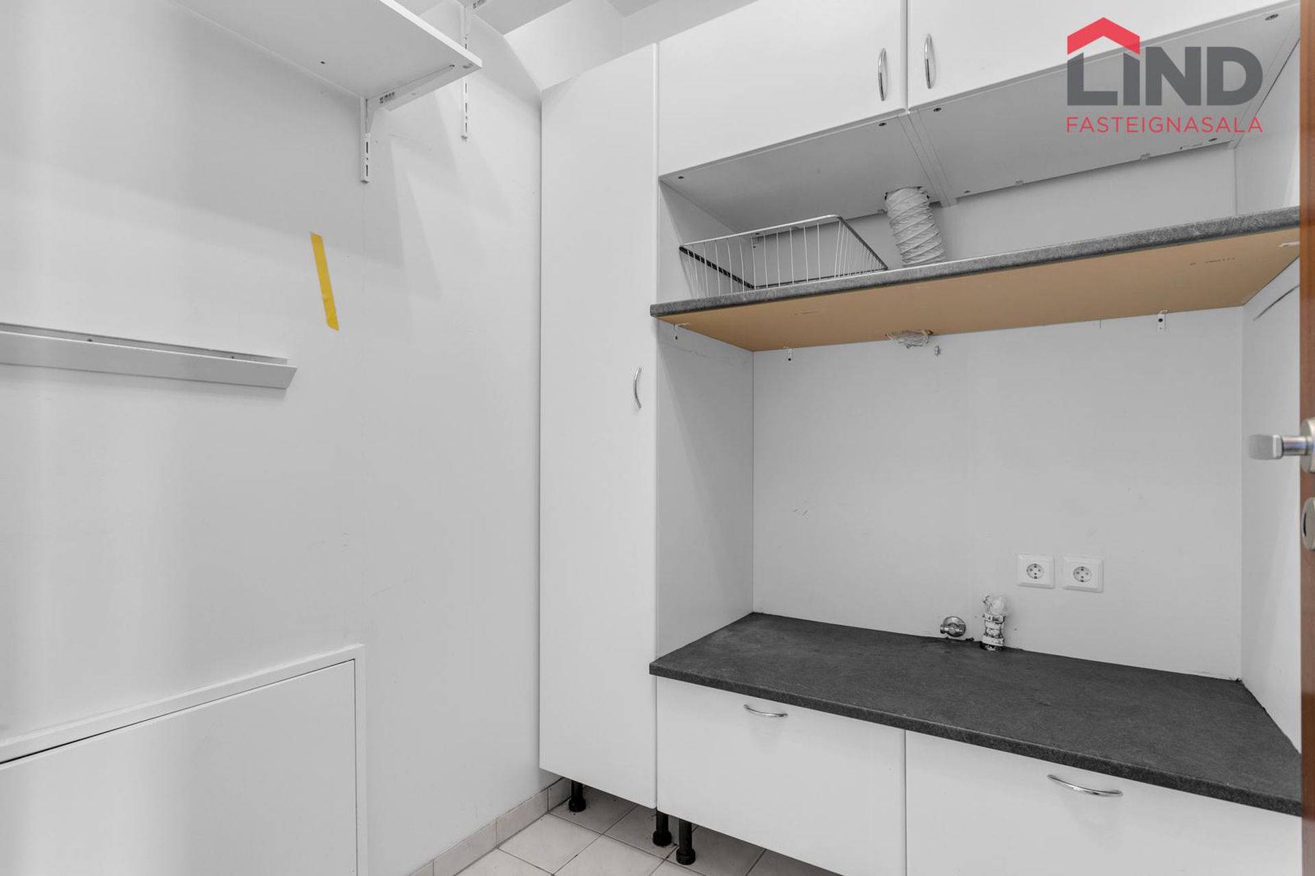 Þvottahús er innan íbúðar með tengi þvottavél og þurrkara, góðar hirslur.