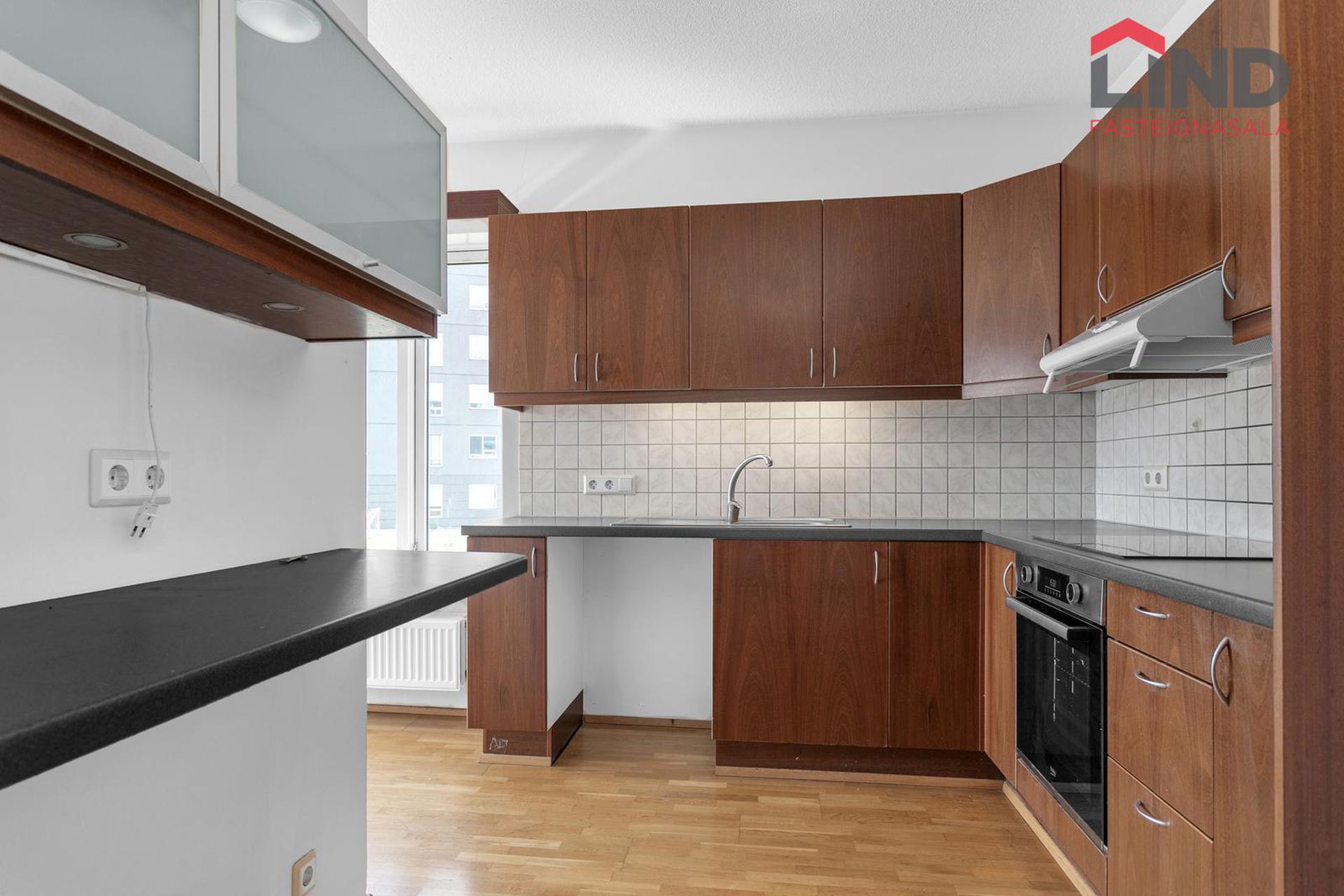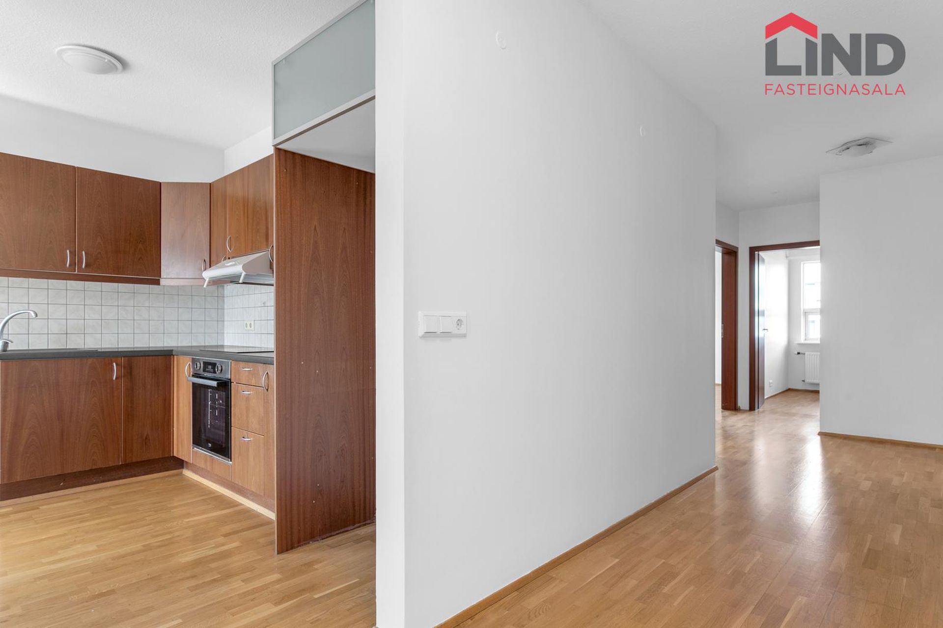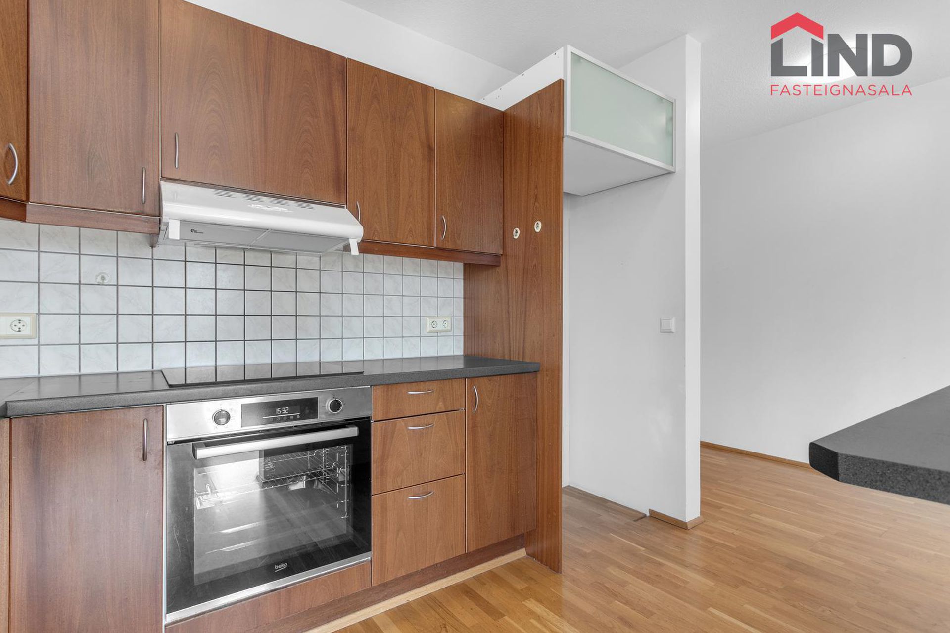 Eldhús með nýlegri innréttingu með innbyggðum ísskáp , frysti ásamt innbyggðri uppþvottavél, ofn í vinnuhæð, span helluborð og vifta, parket á gólfi.
