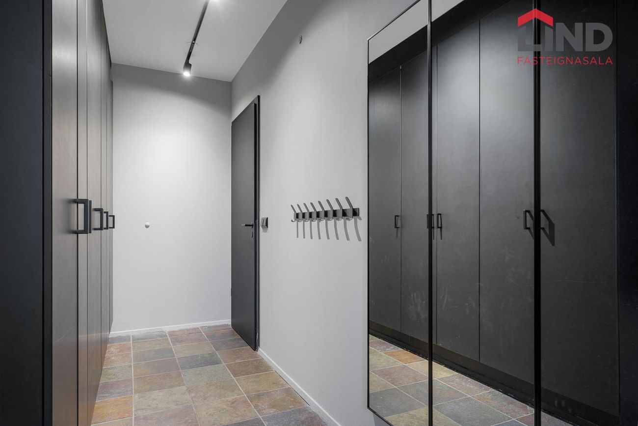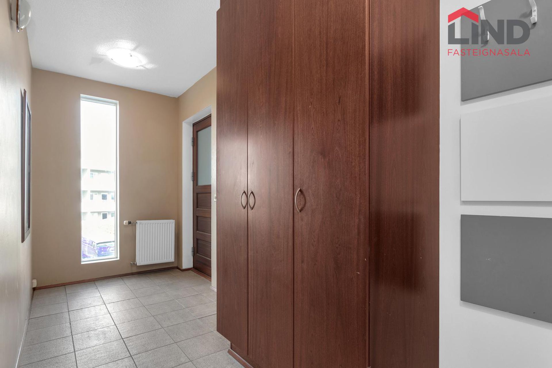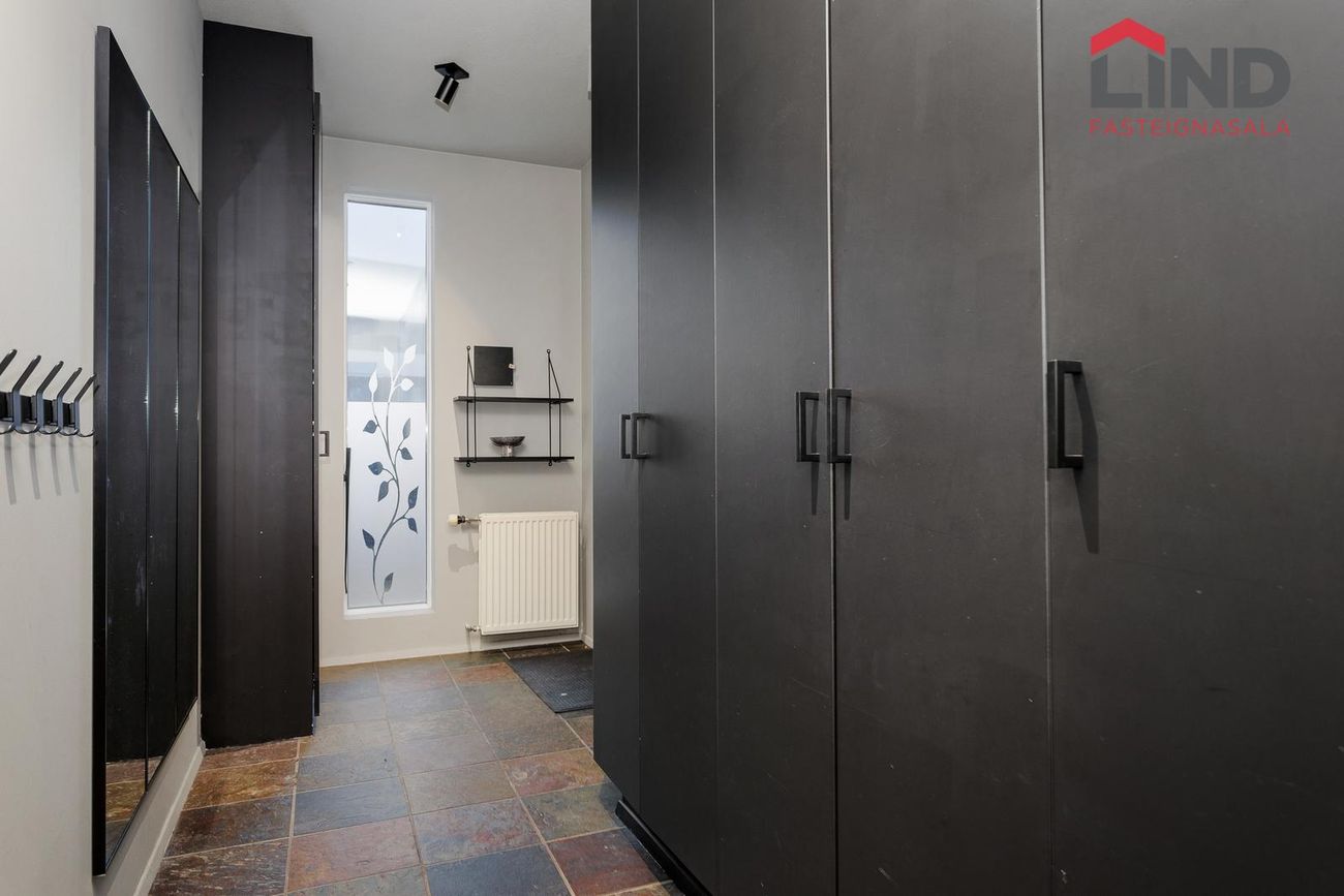 Nánari lýsing:Forstofa með góðum fataskápum og flísar á gólfi.