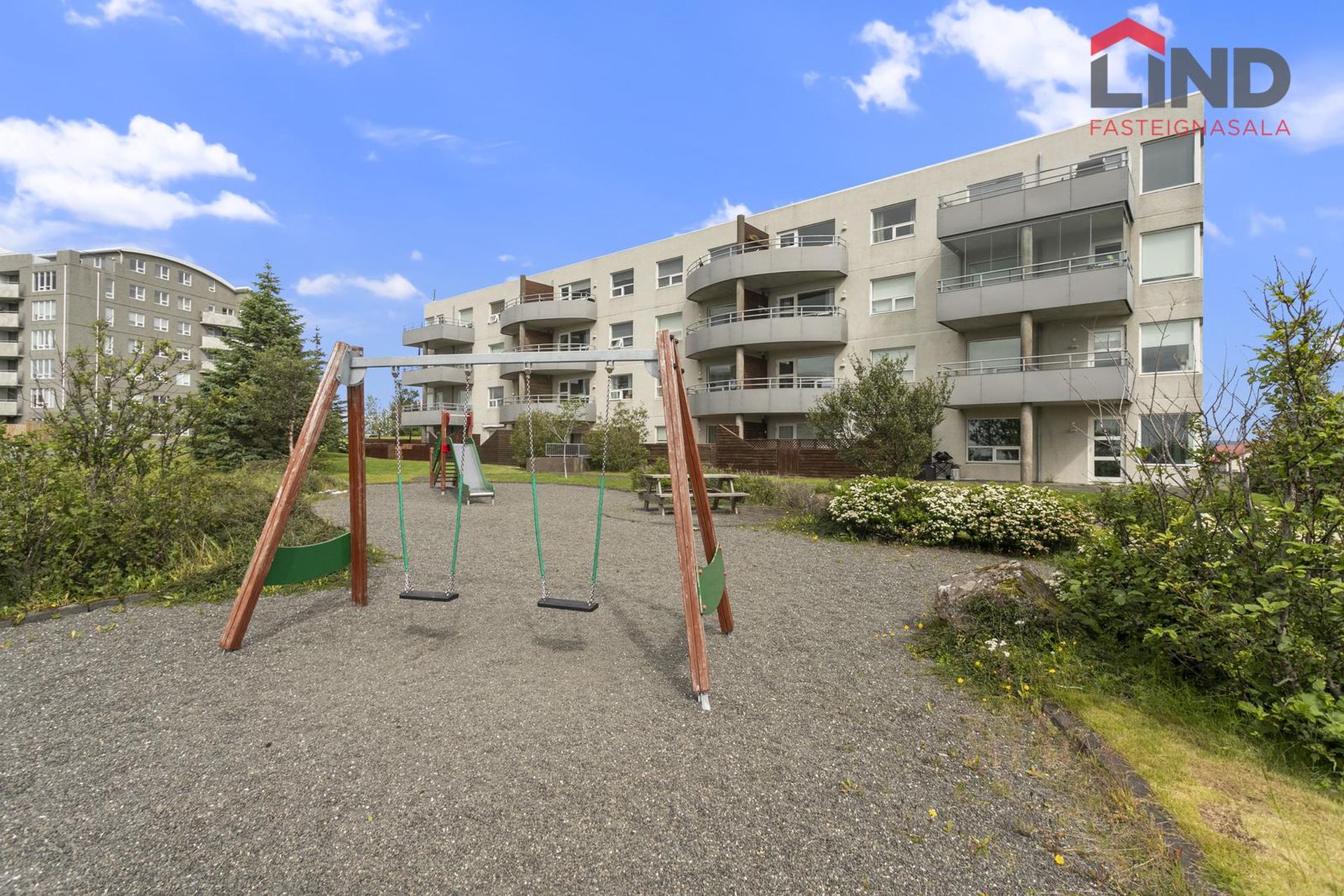 íbúðin er staðsett garðmegin í húsinu, ekki er því ónæði frá umferð. Leikvöllur fyrir börn er í garðinum með rólum og rennibrautun , og að auki er fullt af leiksvæðum í nágrenninu