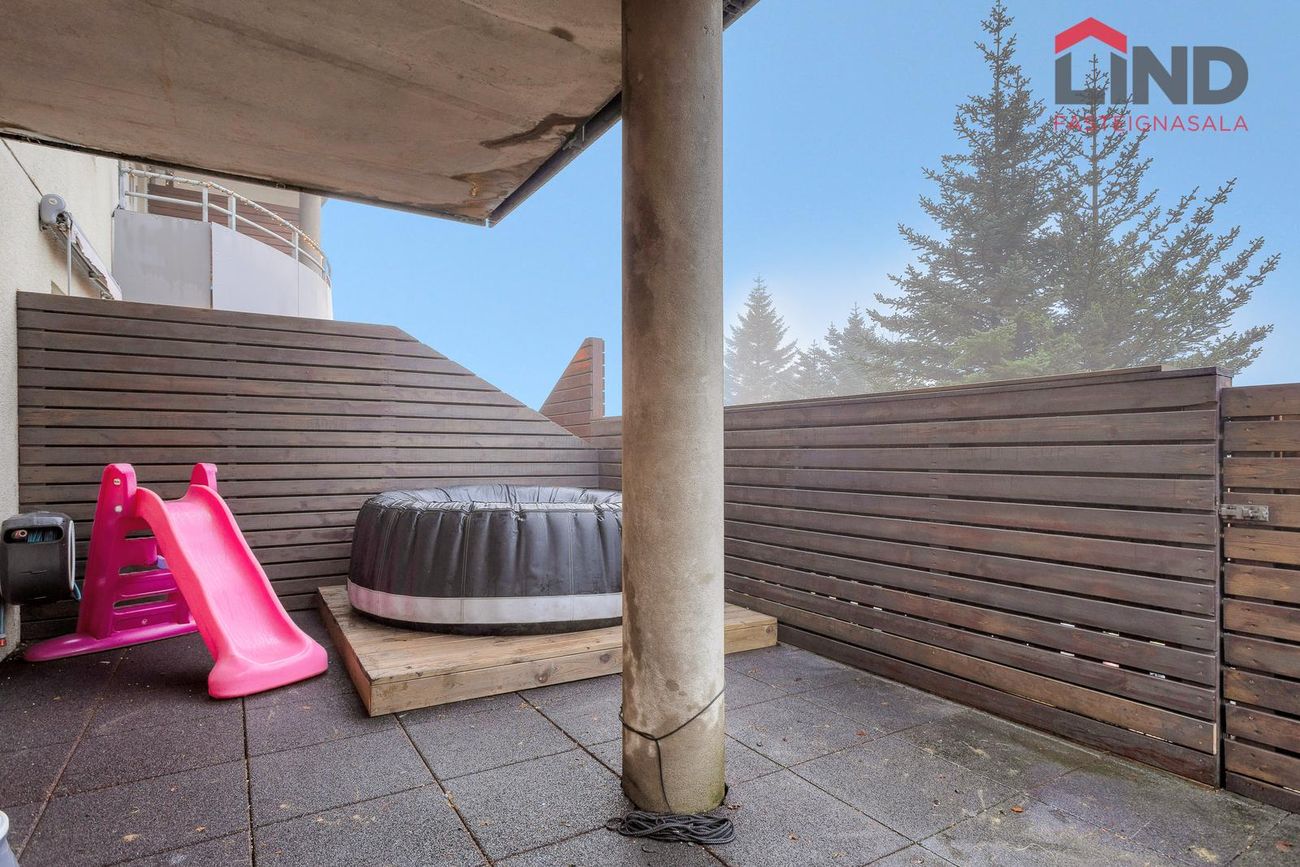 Stofa og borðstofa er parketlögð með útgengi út á hellulagðan sérafnotaflöt með skjólgirðingu. Pallurinn var stækkaður 2024.