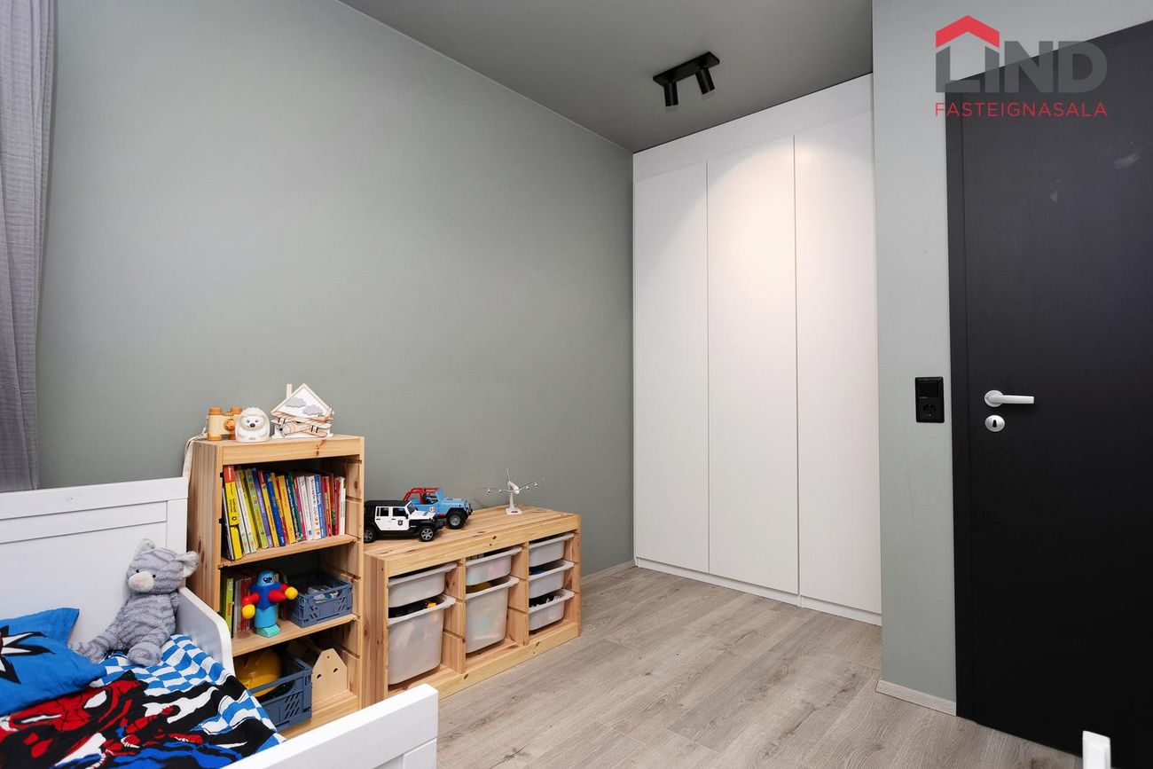 Barnaherbergin ertu tvö með parketi á gólfi og nýjum fataskápum.