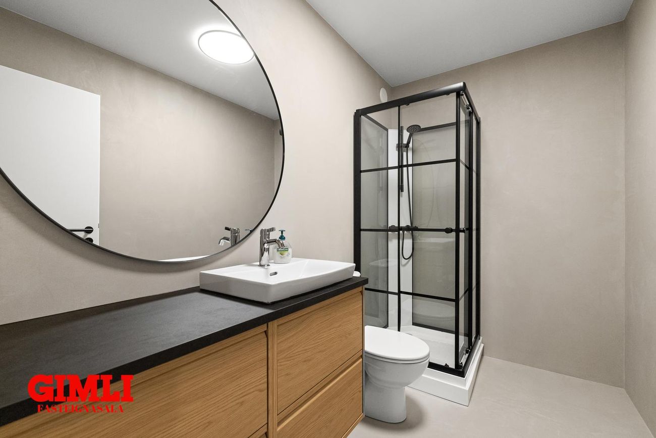 Baðherbergi: Er endurnýjað að öllu leiti. Veggir og gólf eru klædd með dröppuðu Stuc Vestre epoxý steinefnaspartli frá Sérefni sem gefur rýminu stílhreint og fágað yfirbragð. Ný IKEA Angsjö innrétting með tveimur skúffum, borðplötu og vaski. Nýr sturtuklefi, nýtt salerni.