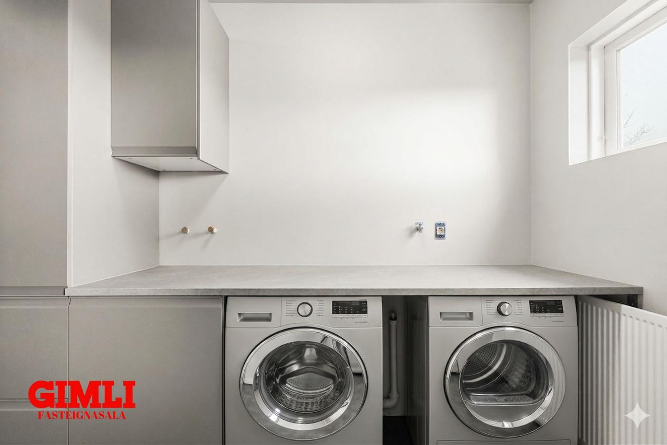 Þvottahús og búr: Ný IKEA METOD innrétting með dökkdröppuðum UPPLÖV frontum. Tengi fyrir þvottavél og þurrkara, möguleiki á að bæta við vaski. Nýjar vínilflísar á gólfum.