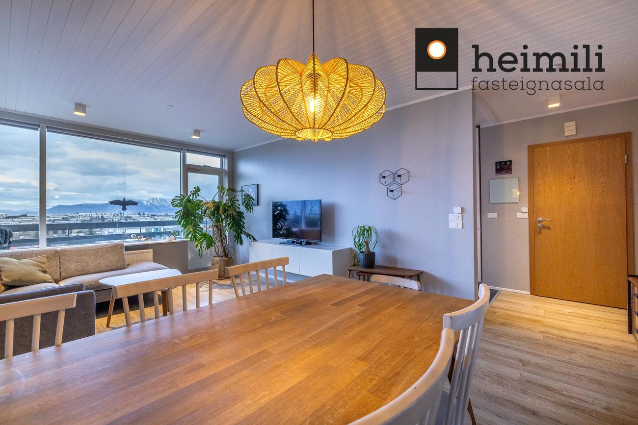 Stofa/Borðstofa er björt og falleg með góðum gluggum, fallegt útsýni til norðurs og vesturs. Útgengi á svalir.