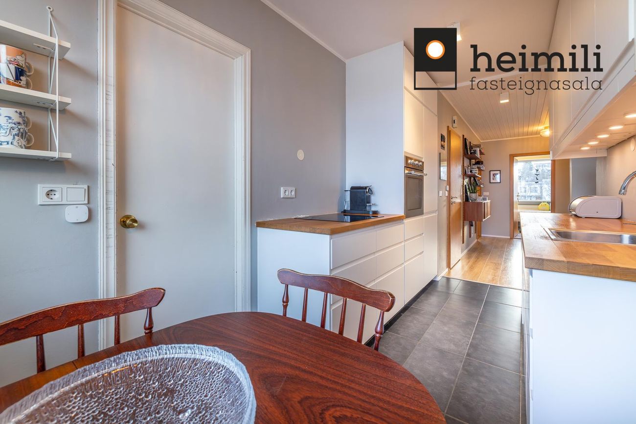 Eldhús er með fallegri hvítri innréttingu, gott skápapláss. Innbyggður ísskápur. og uppþvottavél. Flísar á gólfi. Borðkrókur með útsýni til norðurs og vesturs. Helluborð, bakaraofn í vinnuhæð.