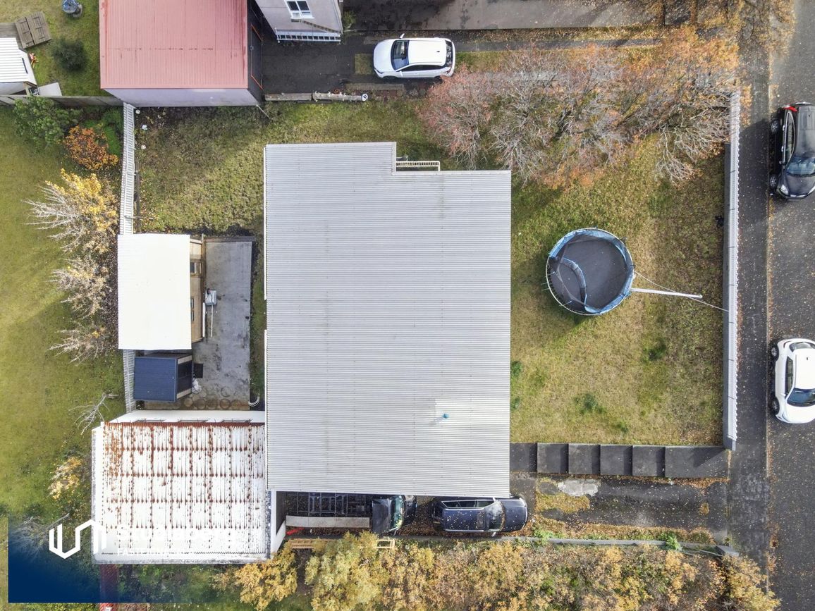 Geymsluskúr er 15fm á bakvið hús á steyptri plötu með stórri hurð á gafli og inngöngu hurð á hliðinni.