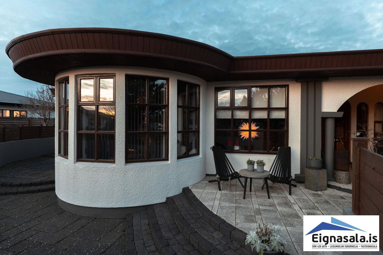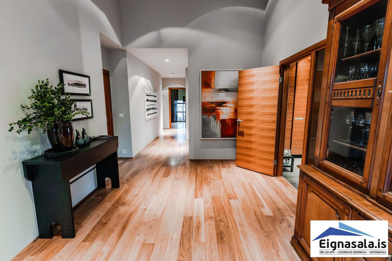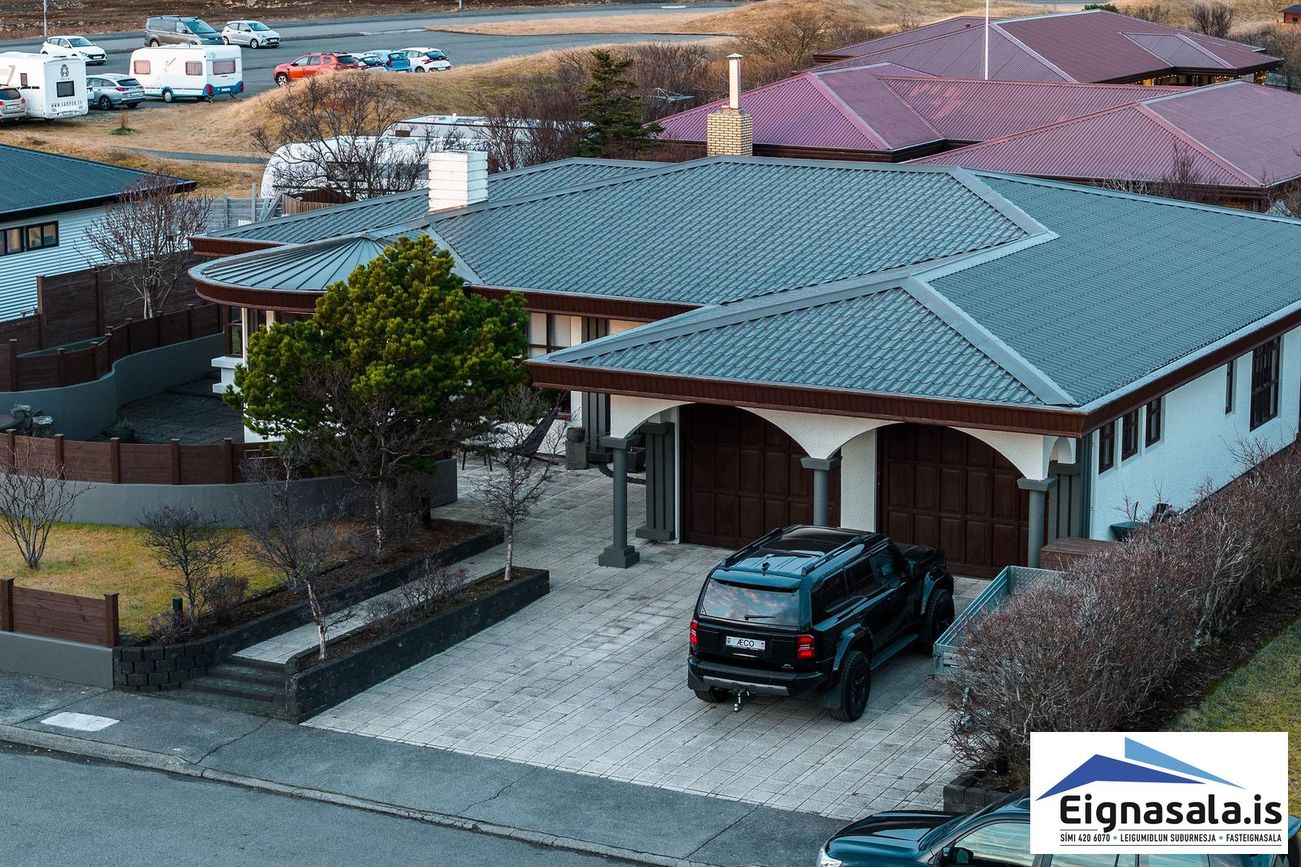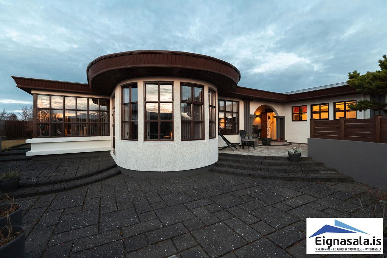 255.2 fm, fimm svefnherbergi, tvö baðherbergi, bílskúr, heitur pottur, gólfhiti í alrými.
