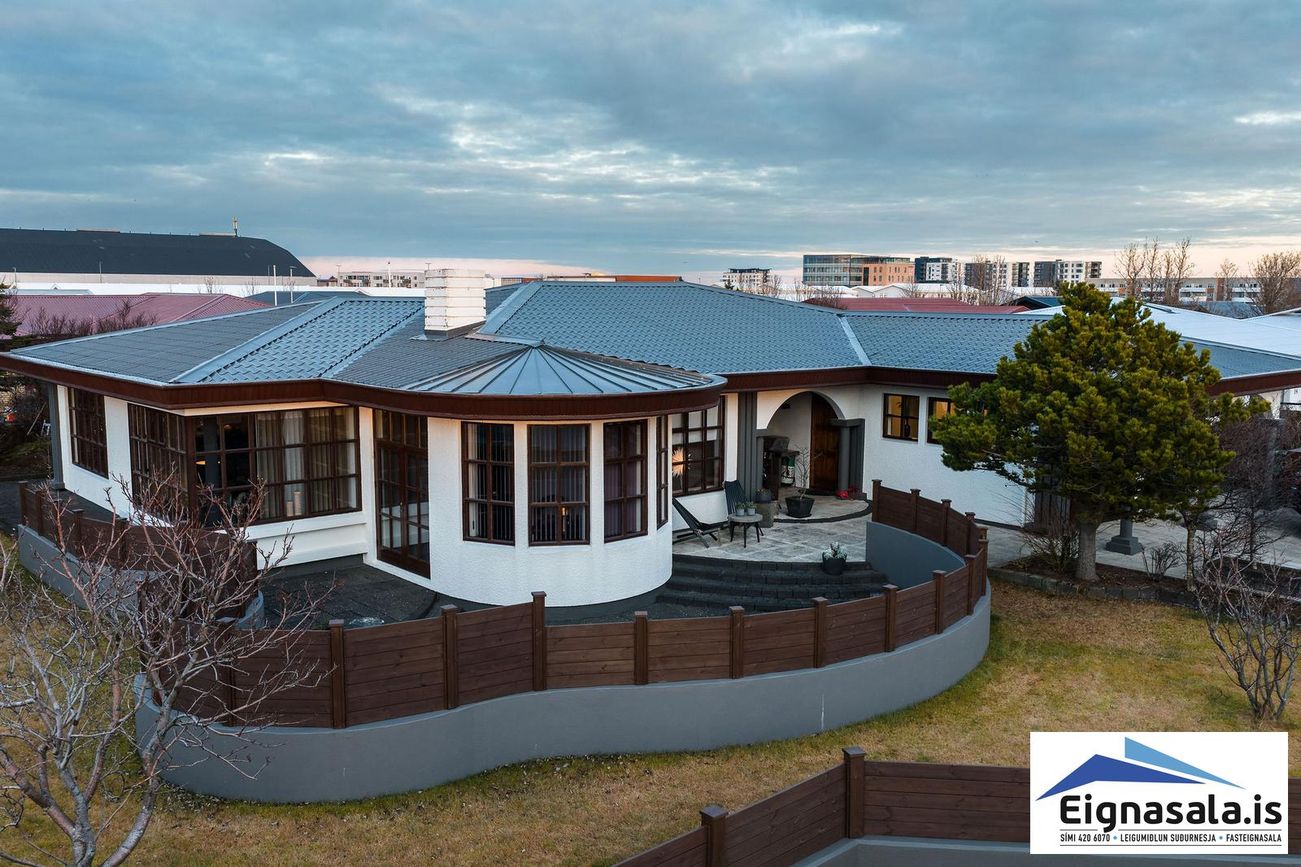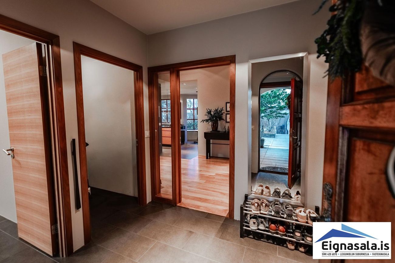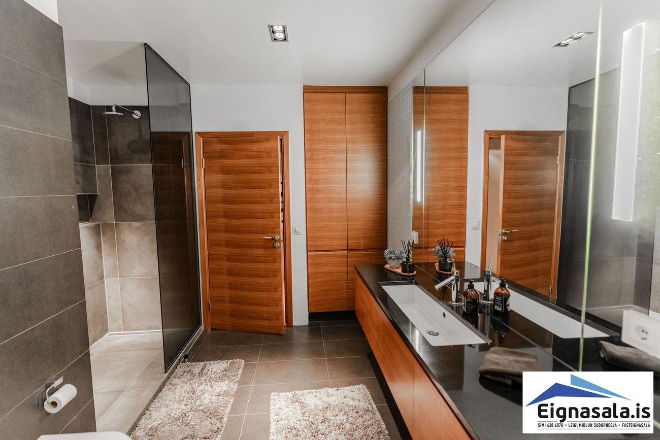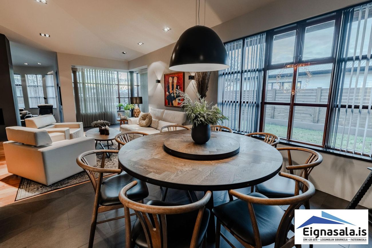 255.2 fm, fimm svefnherbergi, tvö baðherbergi, bílskúr, heitur pottur, gólfhiti í alrými.