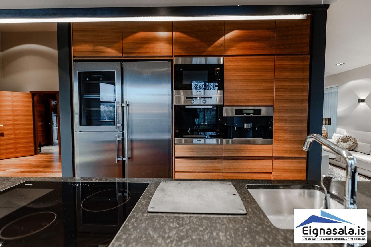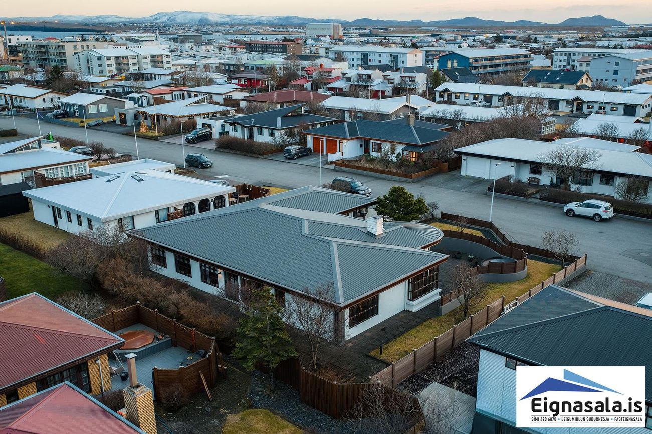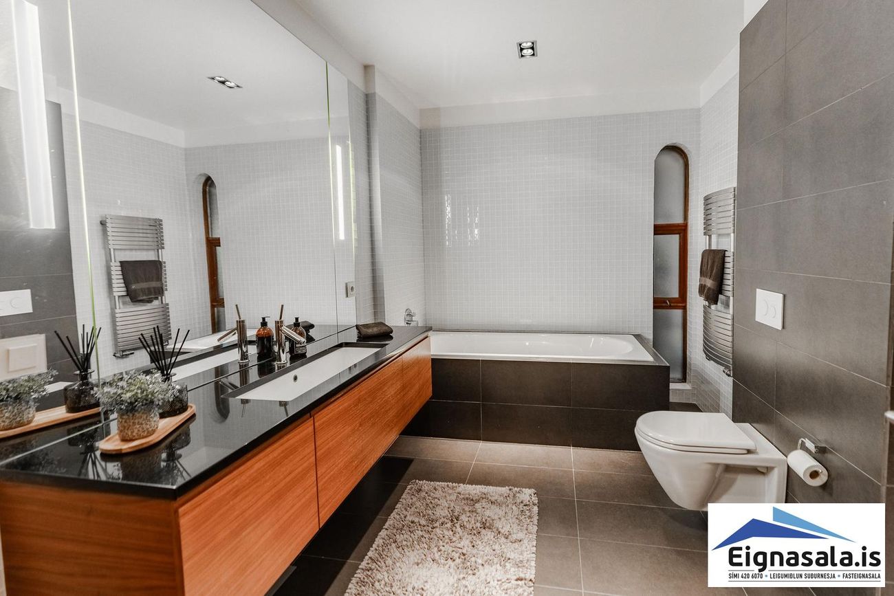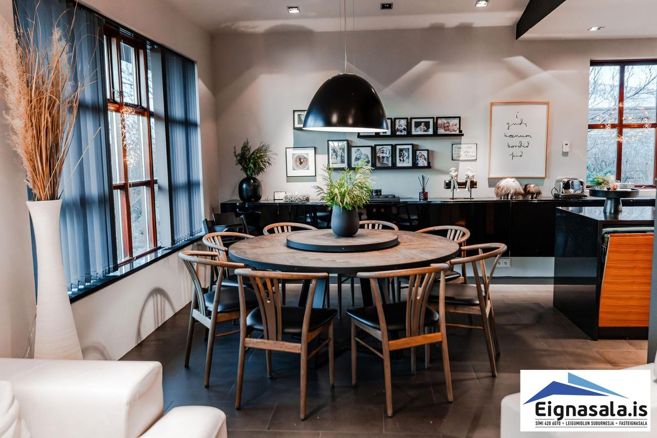 255.2 fm, fimm svefnherbergi, tvö baðherbergi, bílskúr, heitur pottur, gólfhiti í alrými.