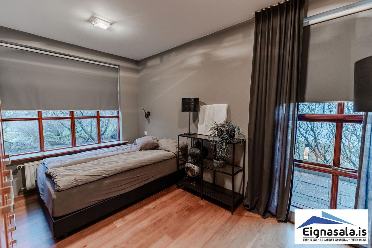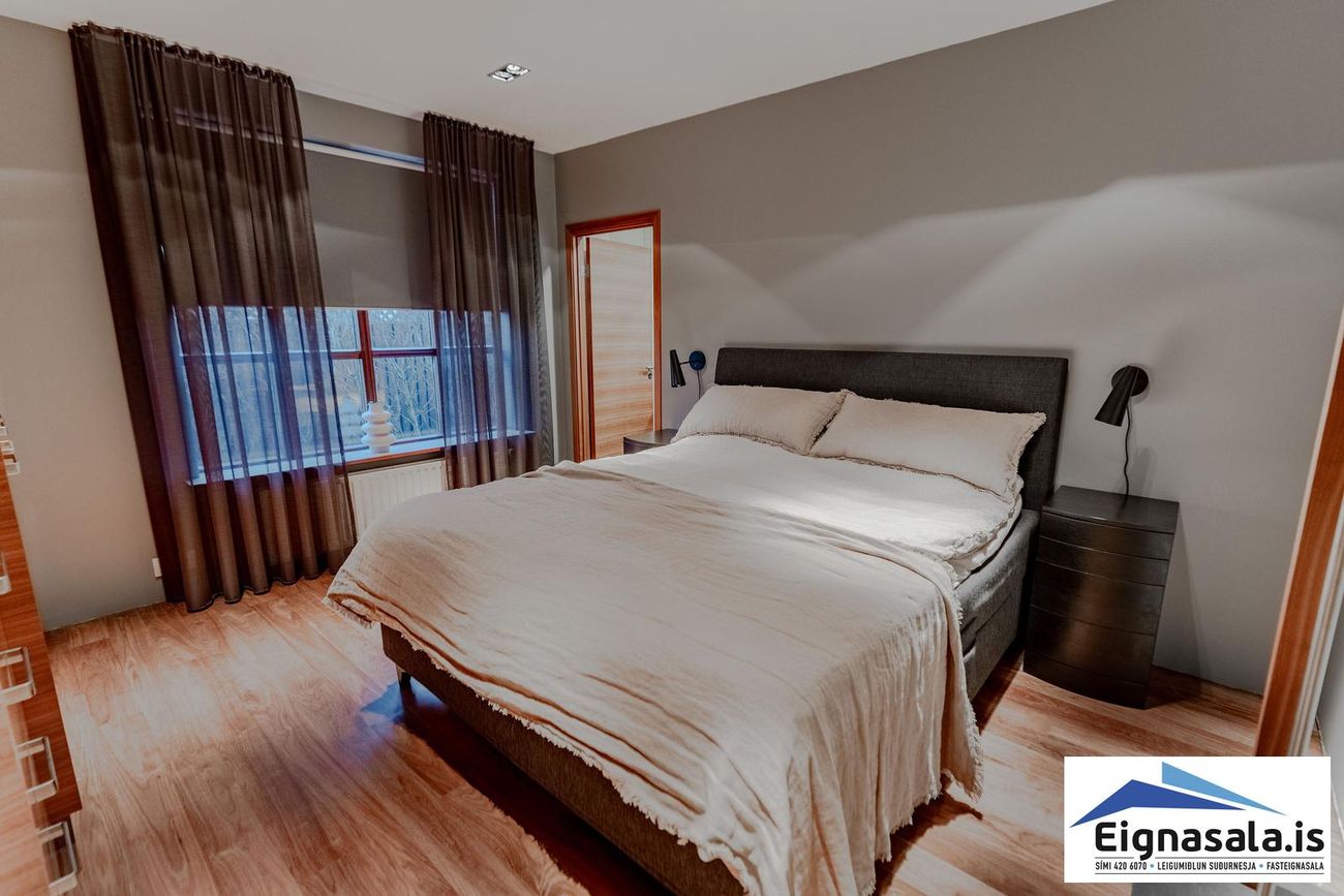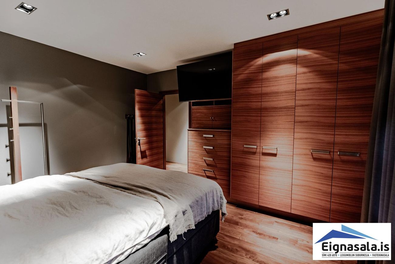 Fimm svefnherbergi: Hjónaherbergi með sér baðherbergi, þrjú önnur með góðum fataskápum.