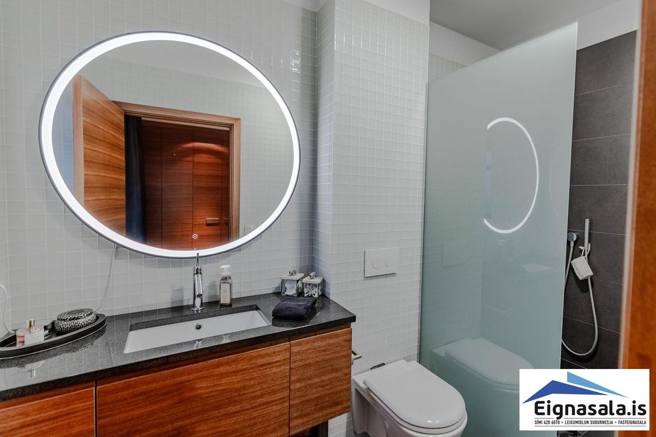 Hjónaherbergið með sér baðherbergi með sturtu og flísum. Aðalbaðherbergi með flísum á öllum veggjum og gólfi, snyrtileg innrétting.