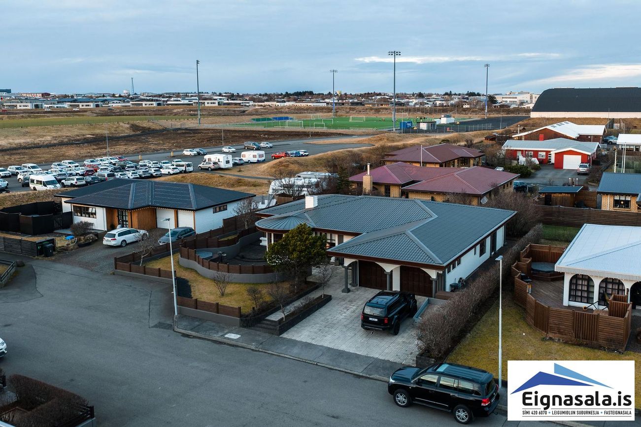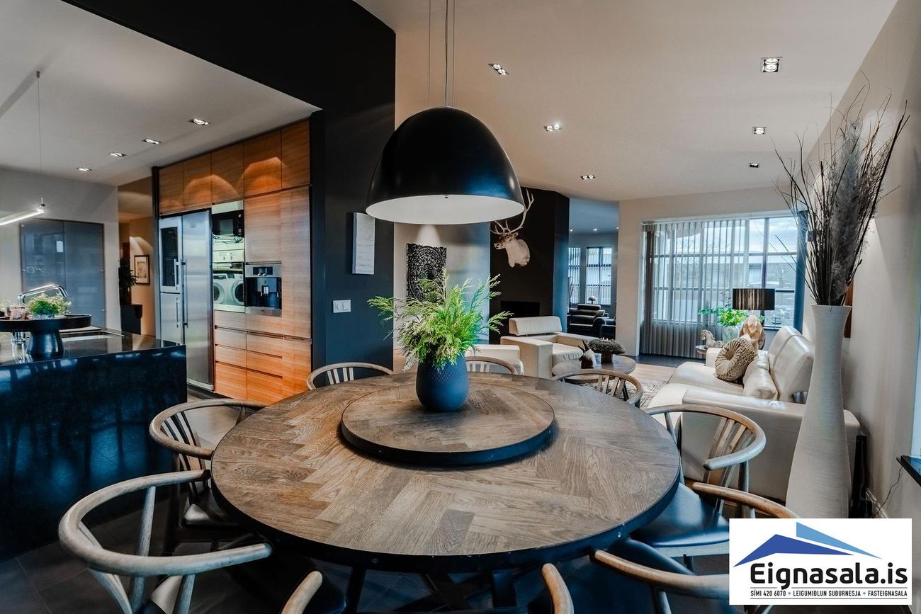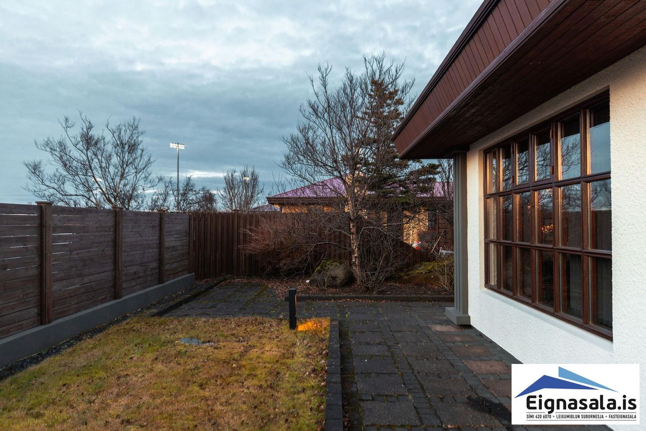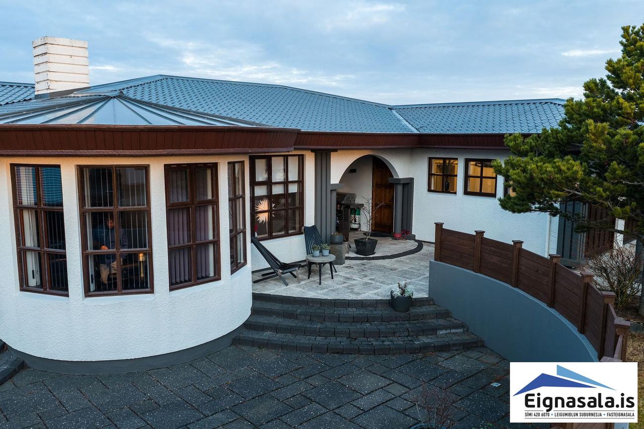 255.2 fm, fimm svefnherbergi, tvö baðherbergi, bílskúr, heitur pottur, gólfhiti í alrými.