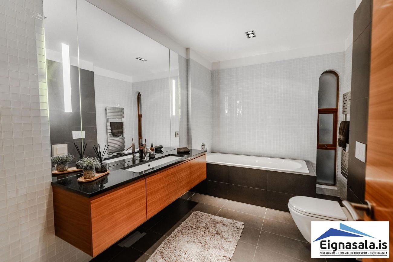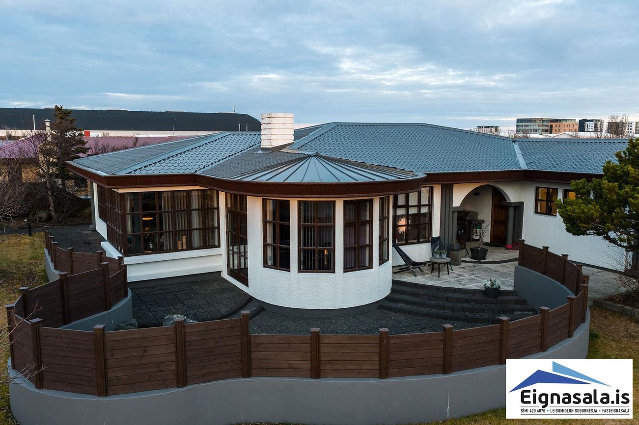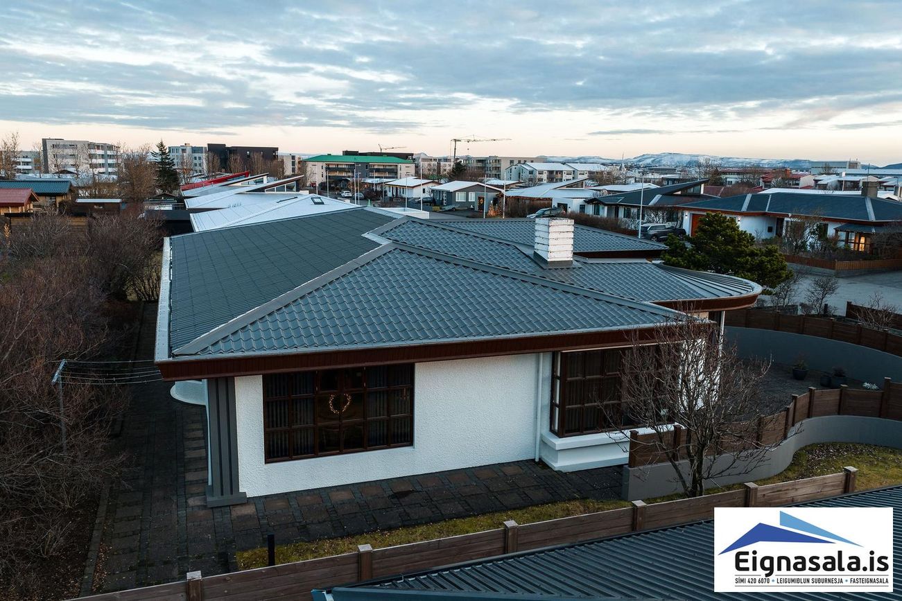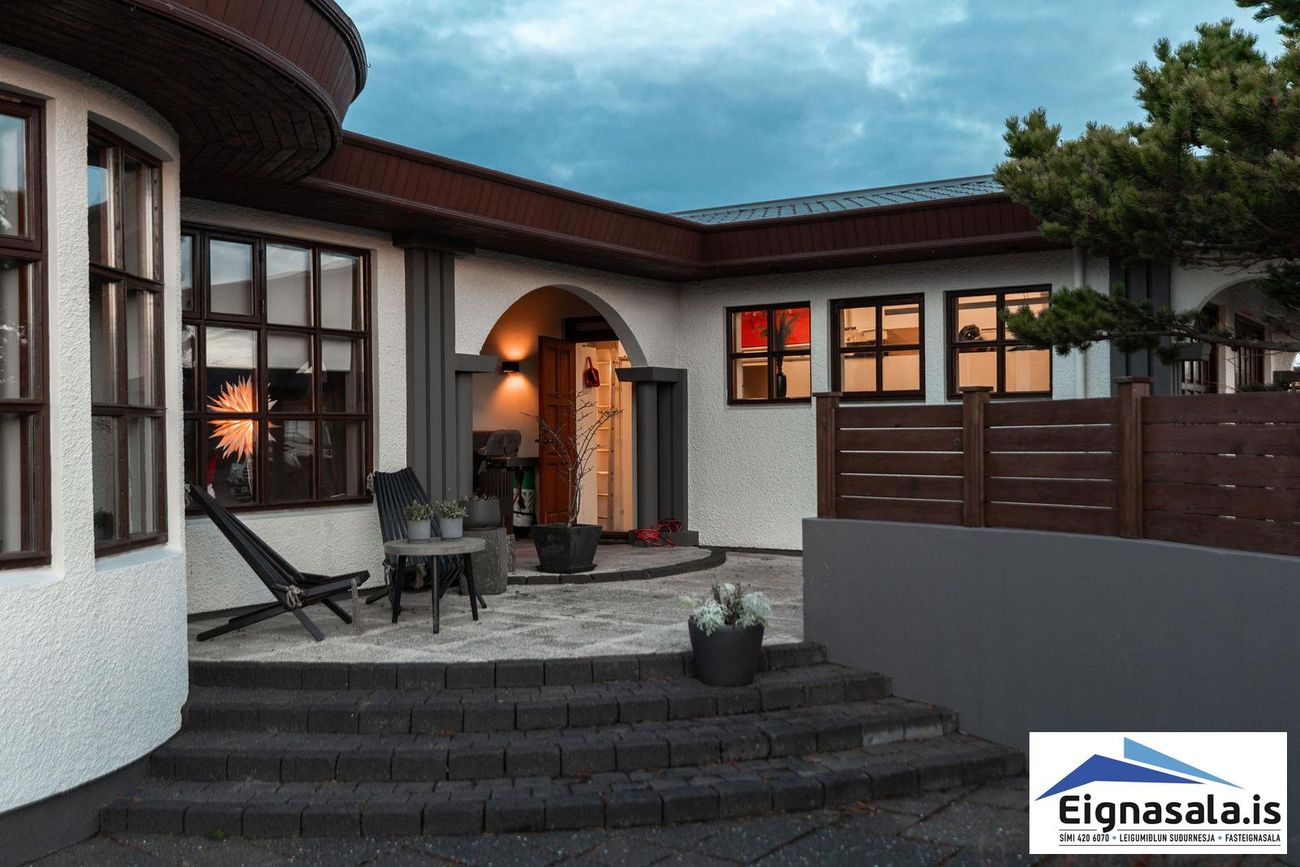 255.2 fm, fimm svefnherbergi, tvö baðherbergi, bílskúr, heitur pottur, gólfhiti í alrými.