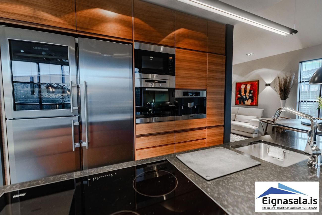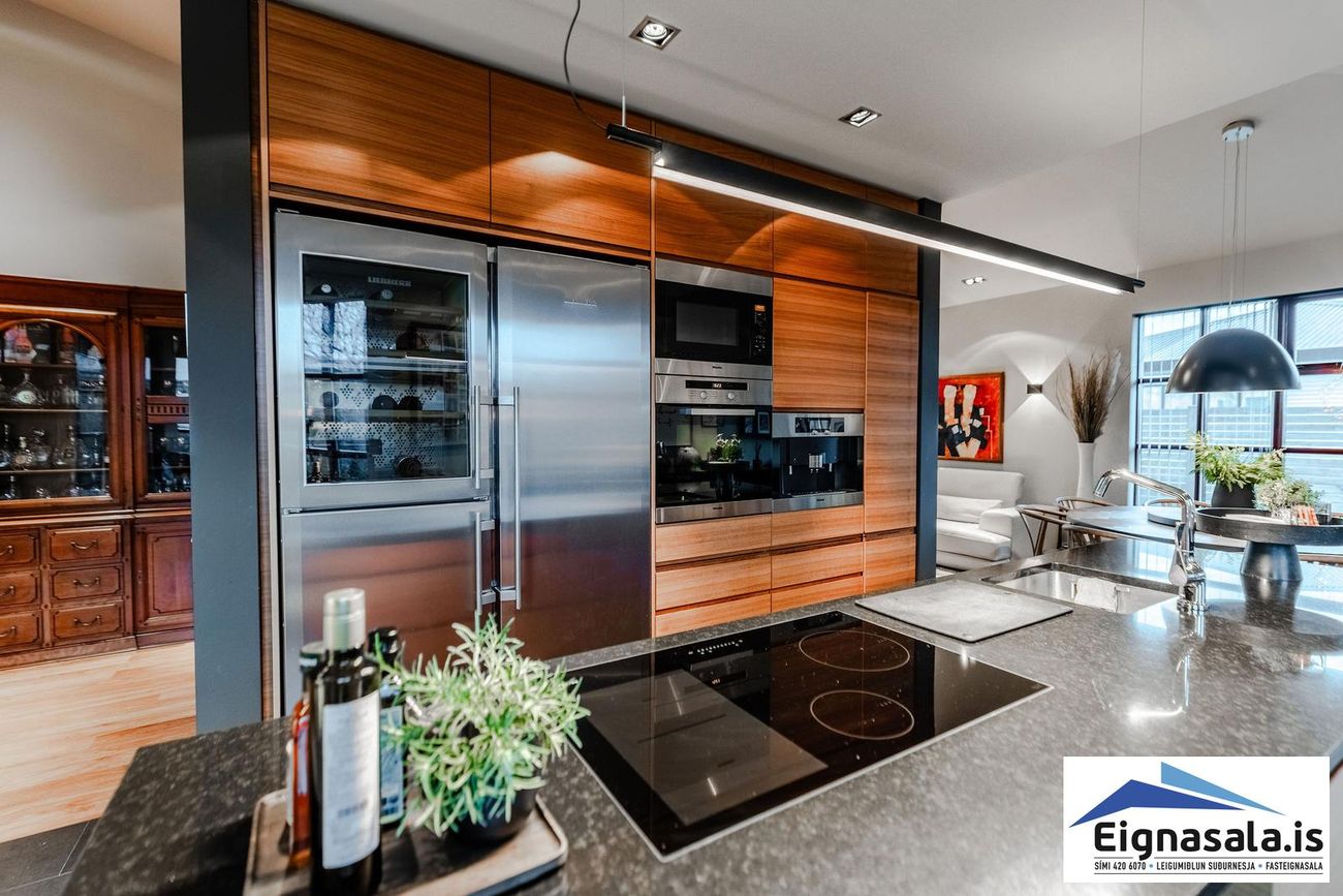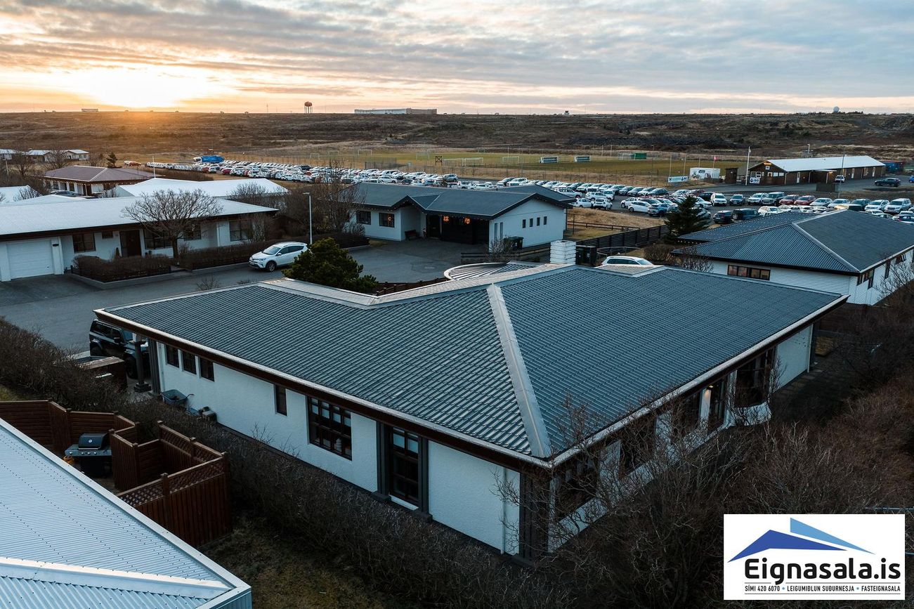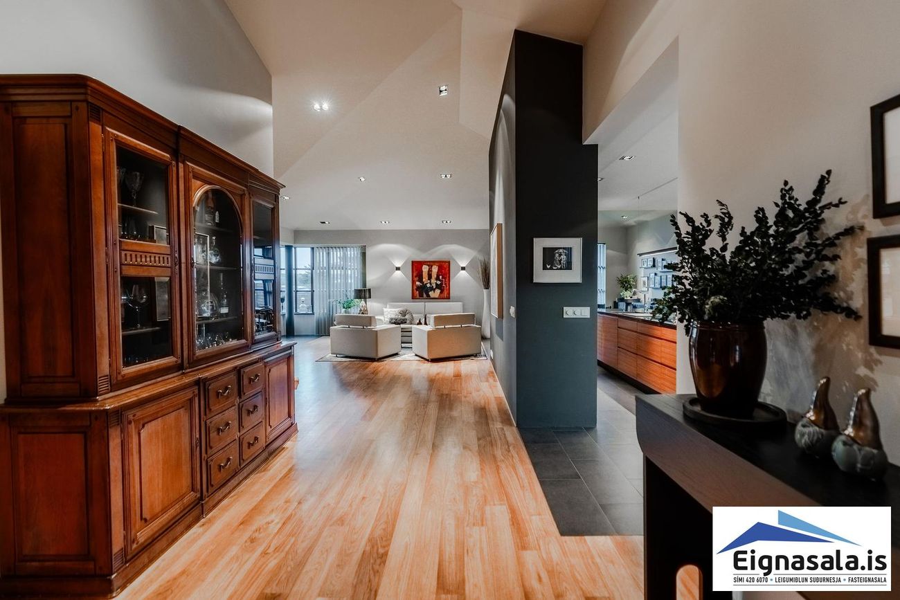 255.2 fm, fimm svefnherbergi, tvö baðherbergi, bílskúr, heitur pottur, gólfhiti í alrými.