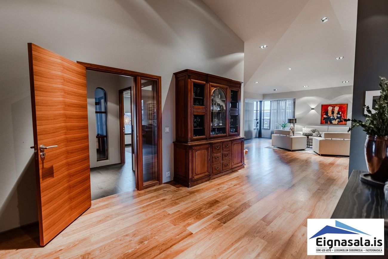 Opið og bjart alrými með parketgólfi og gólfhita frá 2008. Stórir gluggar og gott rými fyrir setu- og sjónvarpsrými.