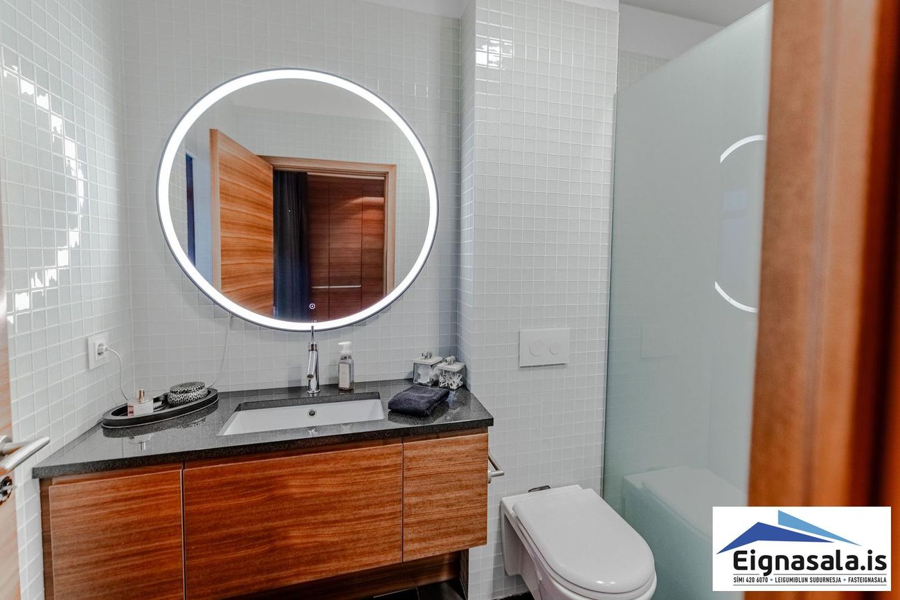 Hjónaherbergið með sér baðherbergi með sturtu og flísum. Aðalbaðherbergi með flísum á öllum veggjum og gólfi, snyrtileg innrétting.