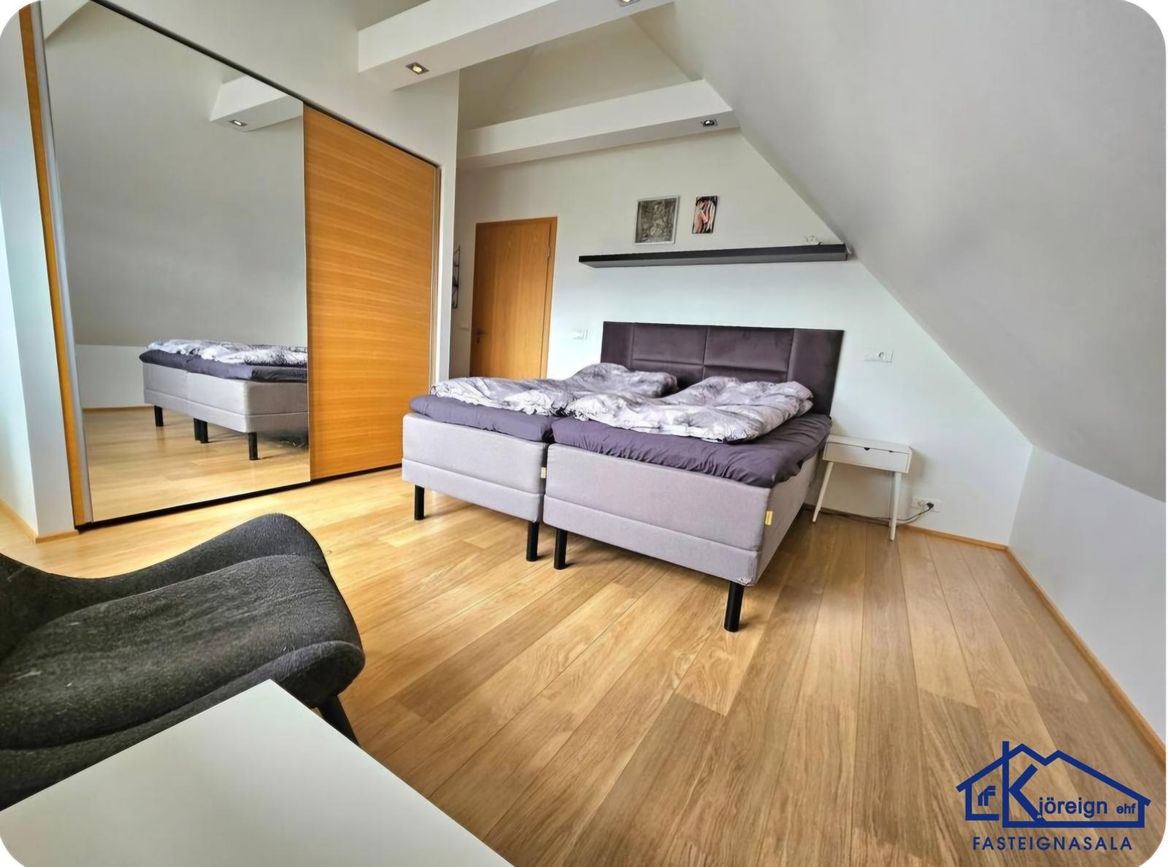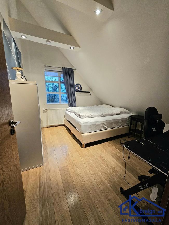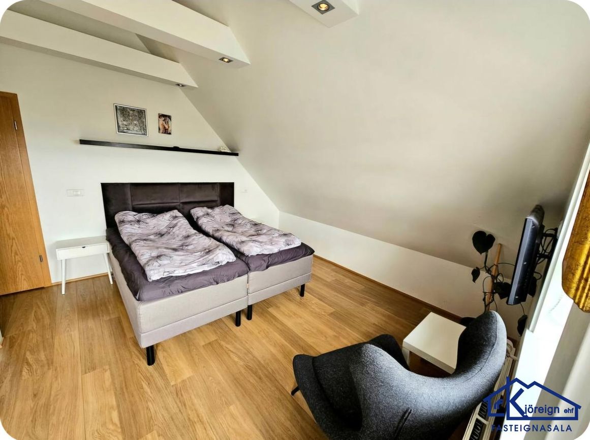 Eitt svefnherbergi á neðri hæð með parketi. Hjónaherbergi á efri hæð með sérsmíðuðum innréttingum og skápaplássi.