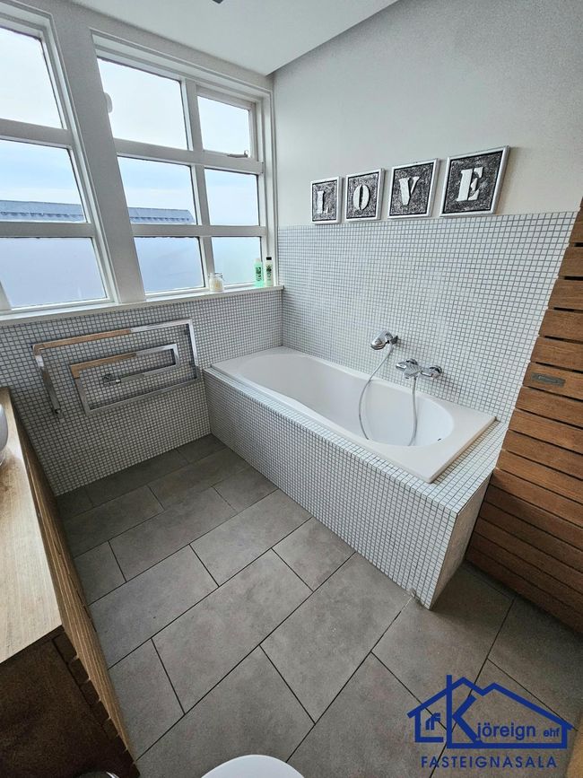 Baðherbergi á efri hæð með gólfhita, mósaikflísum á veggjum, baðkari og innréttingum frá 2008.