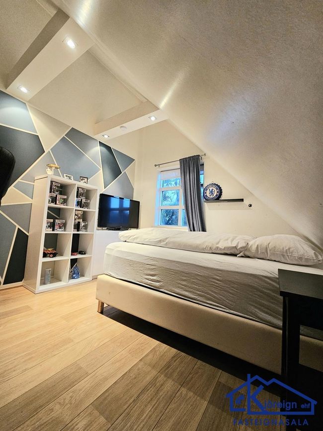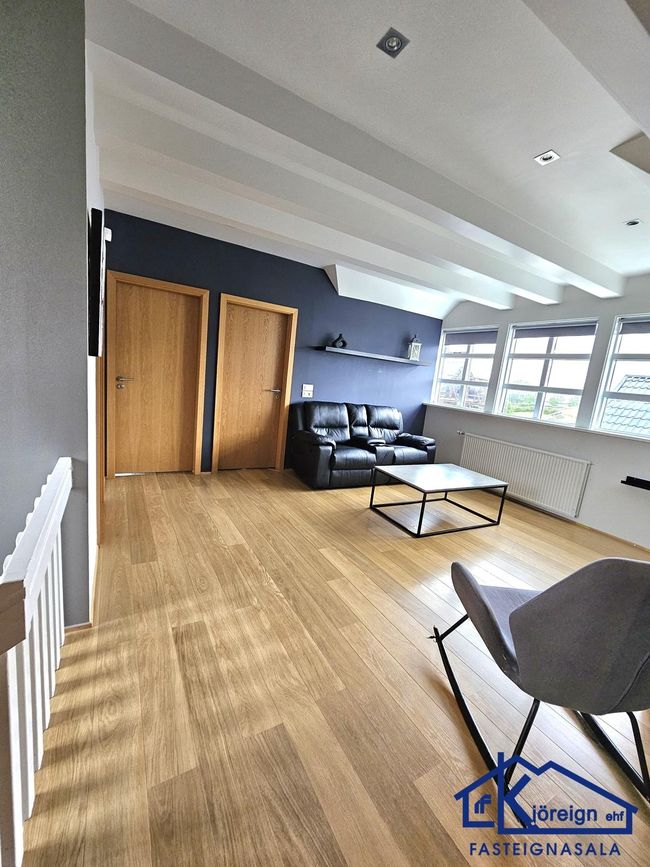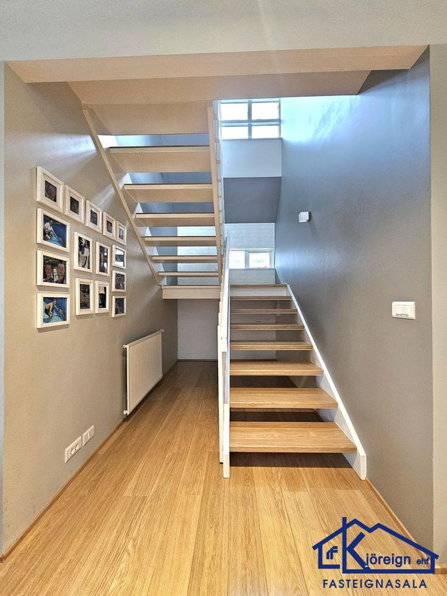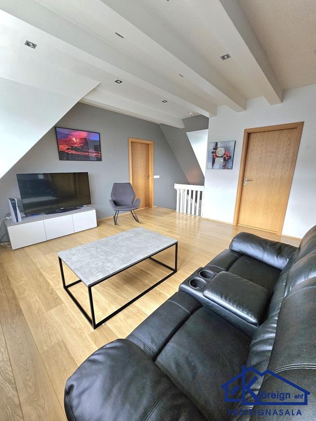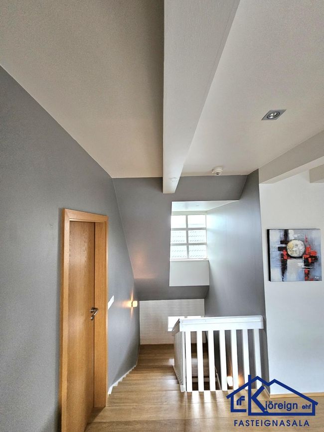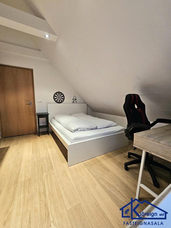 Tvö hæð, neðri hæð með forstofu, eldhús, stofu, svefnherbergi, gestasalerni og þvottahús. Efri hæð með þremur svefnherbergjum, baðherbergi og sjónvarpsholi. Hjónaherbergi með sérsmíðuðum innréttingum.