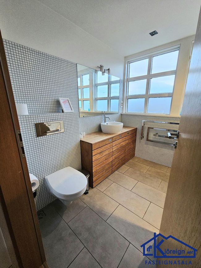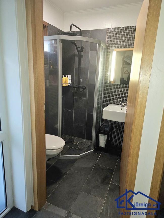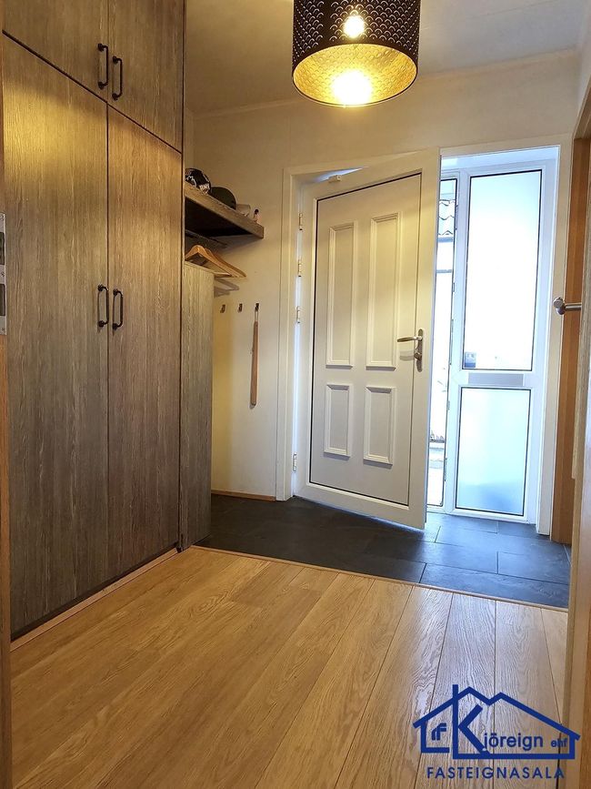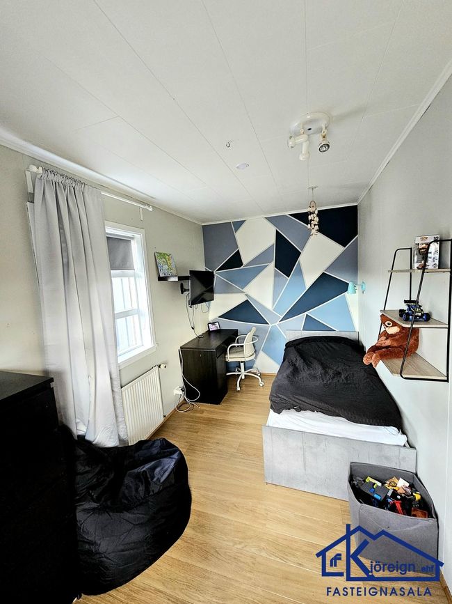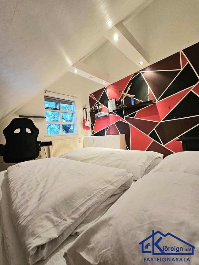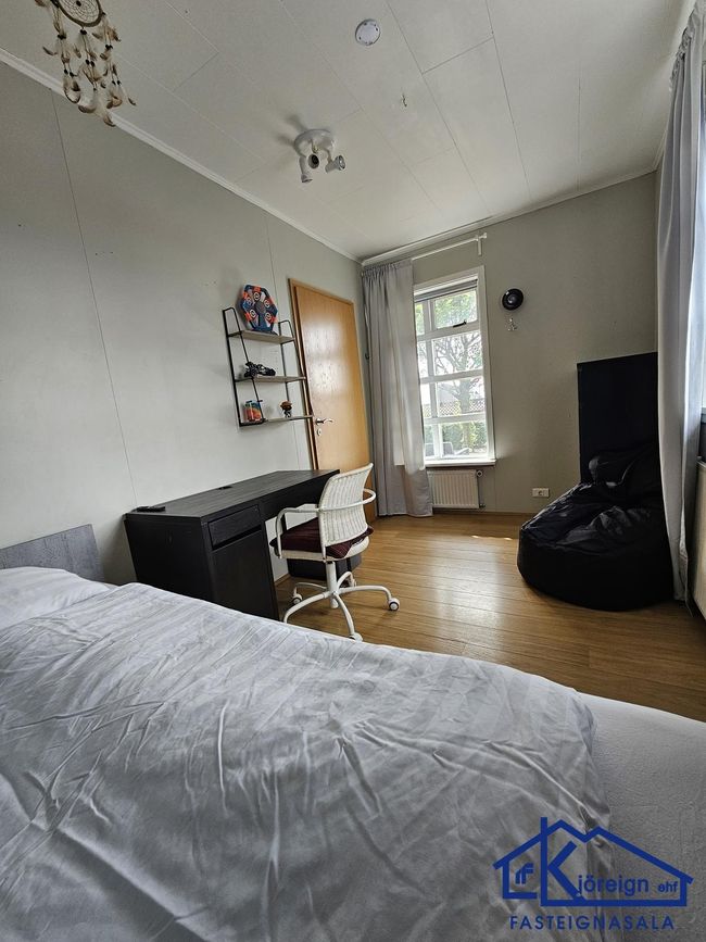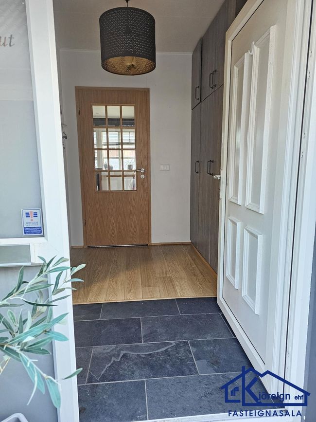 Tvö hæð, neðri hæð með forstofu, eldhús, stofu, svefnherbergi, gestasalerni og þvottahús. Efri hæð með þremur svefnherbergjum, baðherbergi og sjónvarpsholi. Hjónaherbergi með sérsmíðuðum innréttingum.