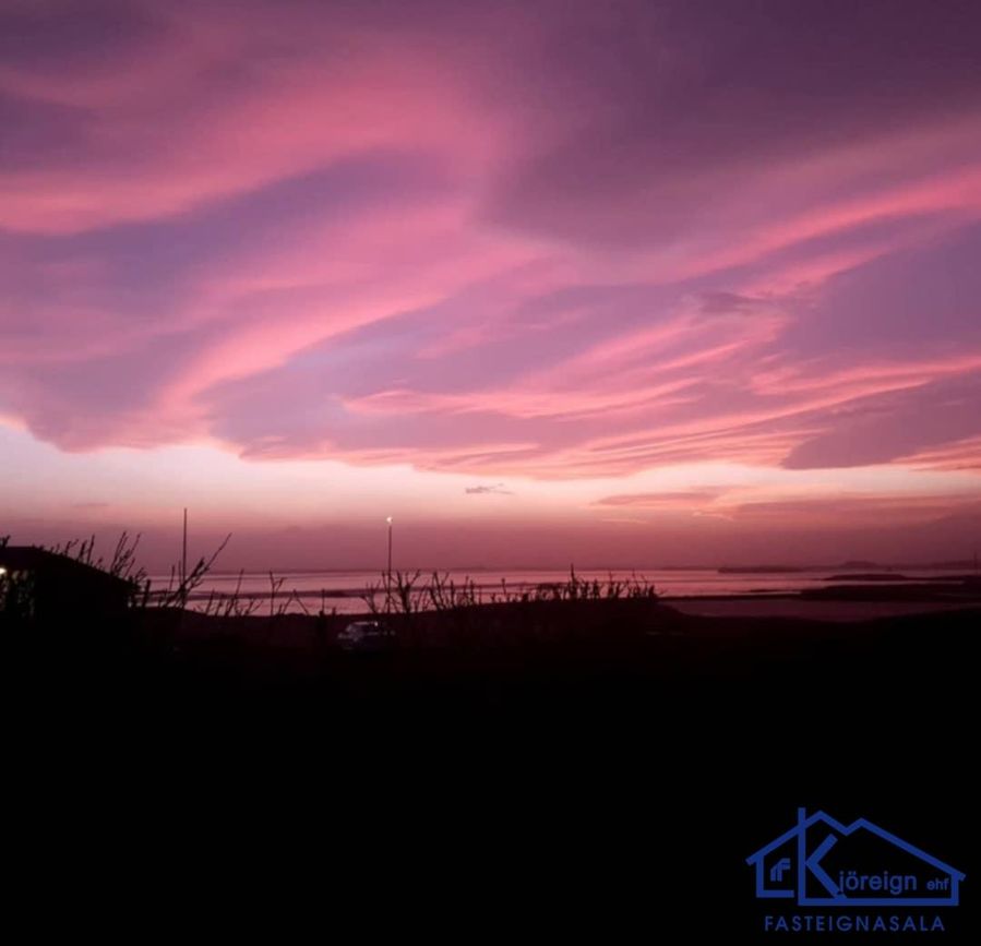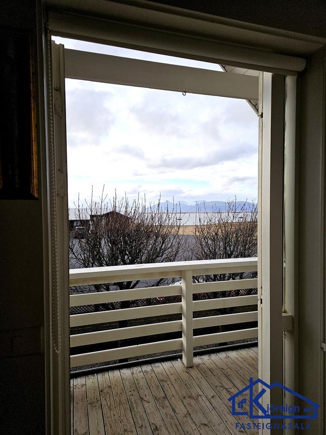 Svalir á vesturhlið með fjallahorfandi útsýni yfir fjörðinn og jökla.