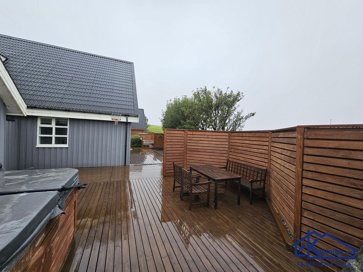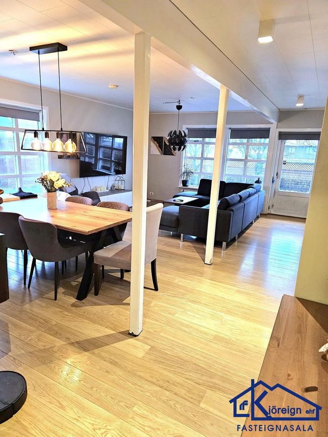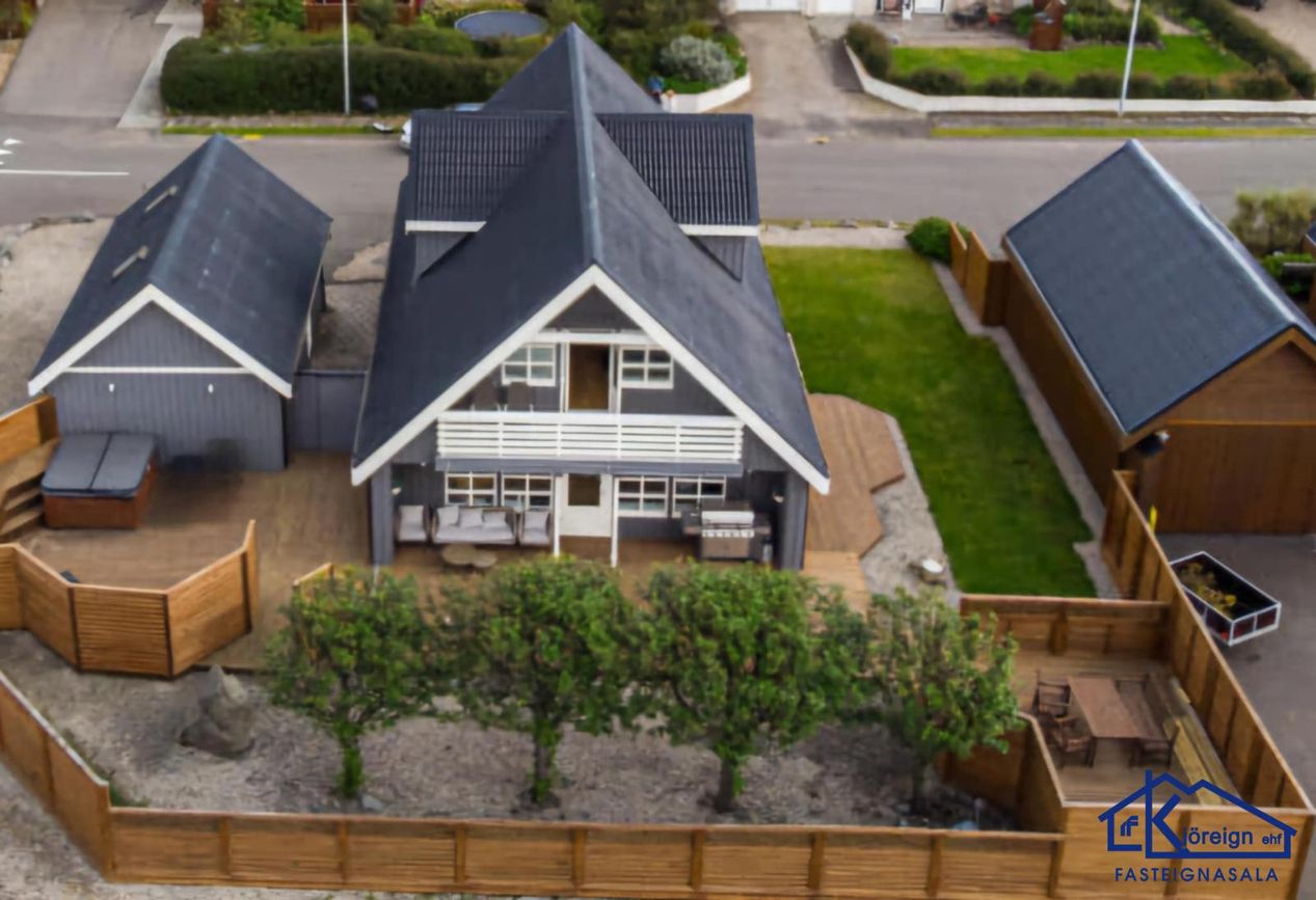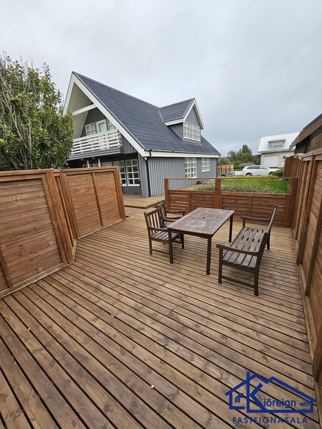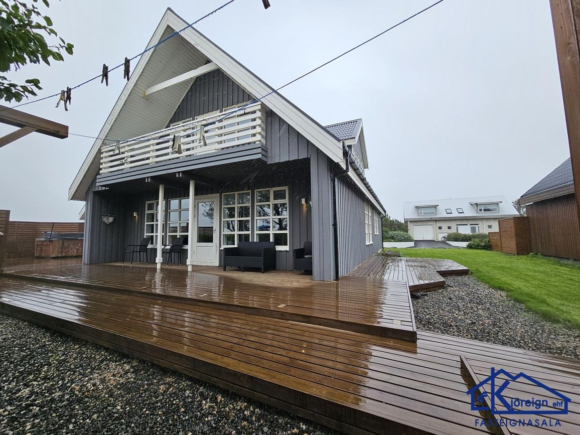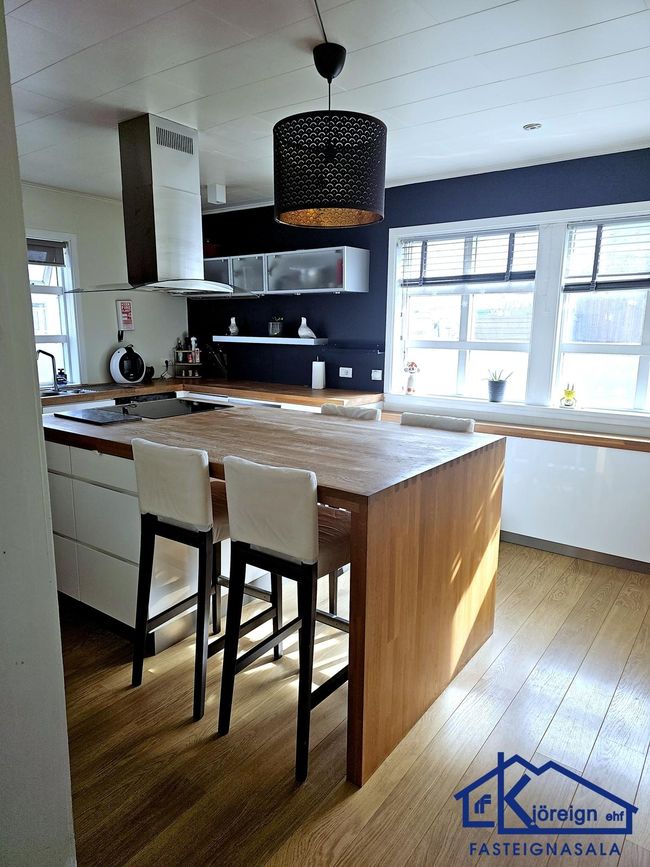 214,8 fm einbýlishús með 2 hæðum, endurnýjað eldhús og baðherbergi, bílskúr með rafmagni, garður með rafmangspotti.