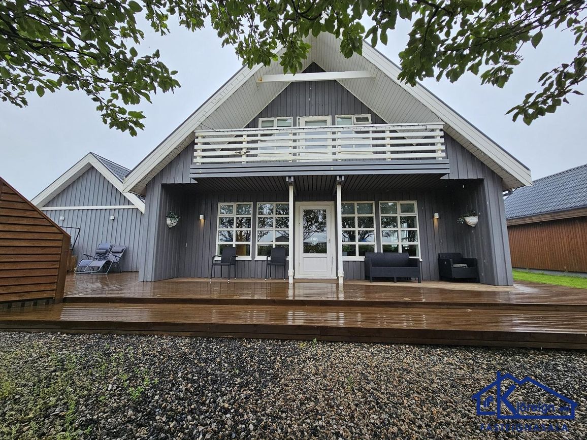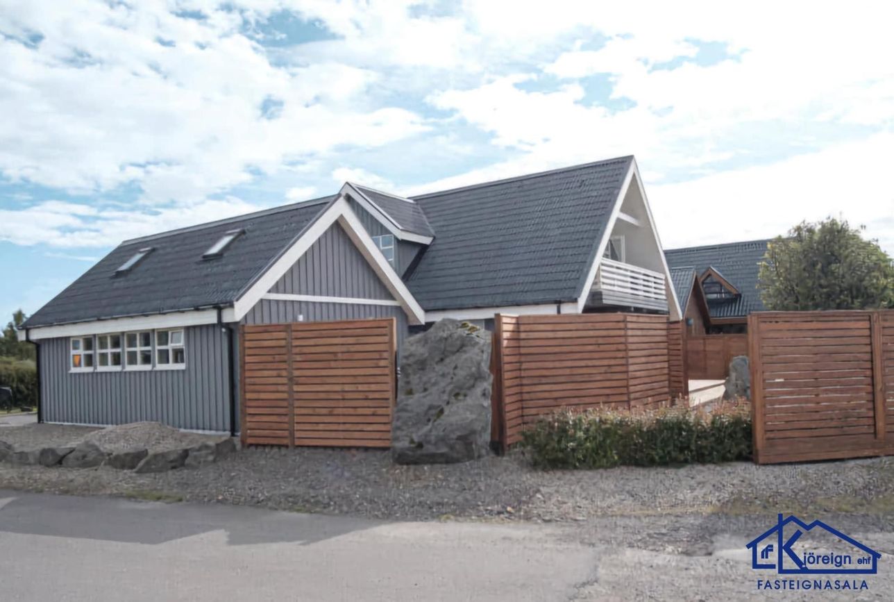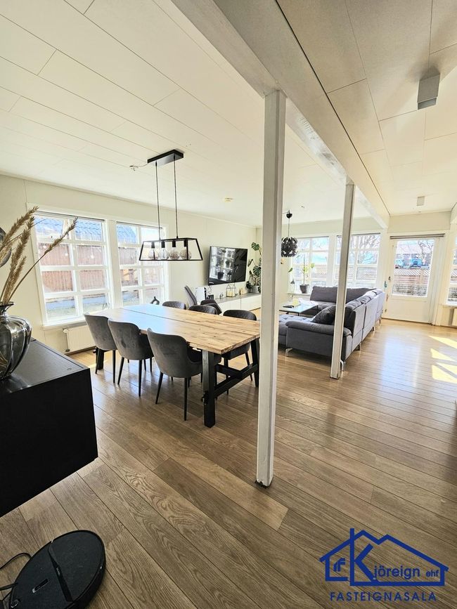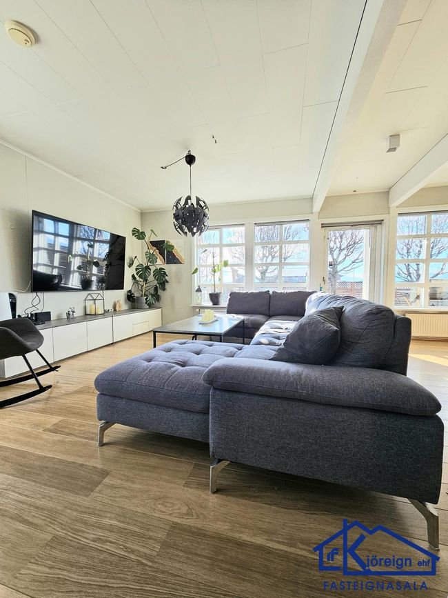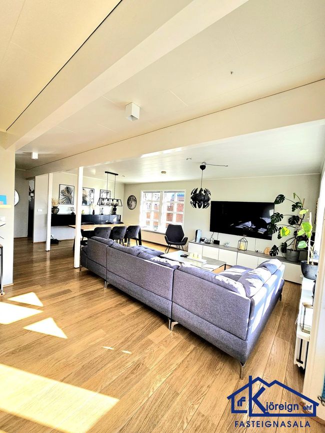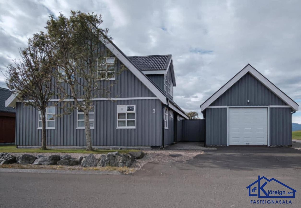 214,8 fm einbýlishús með 2 hæðum, endurnýjað eldhús og baðherbergi, bílskúr með rafmagni, garður með rafmangspotti.