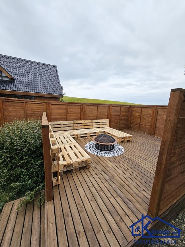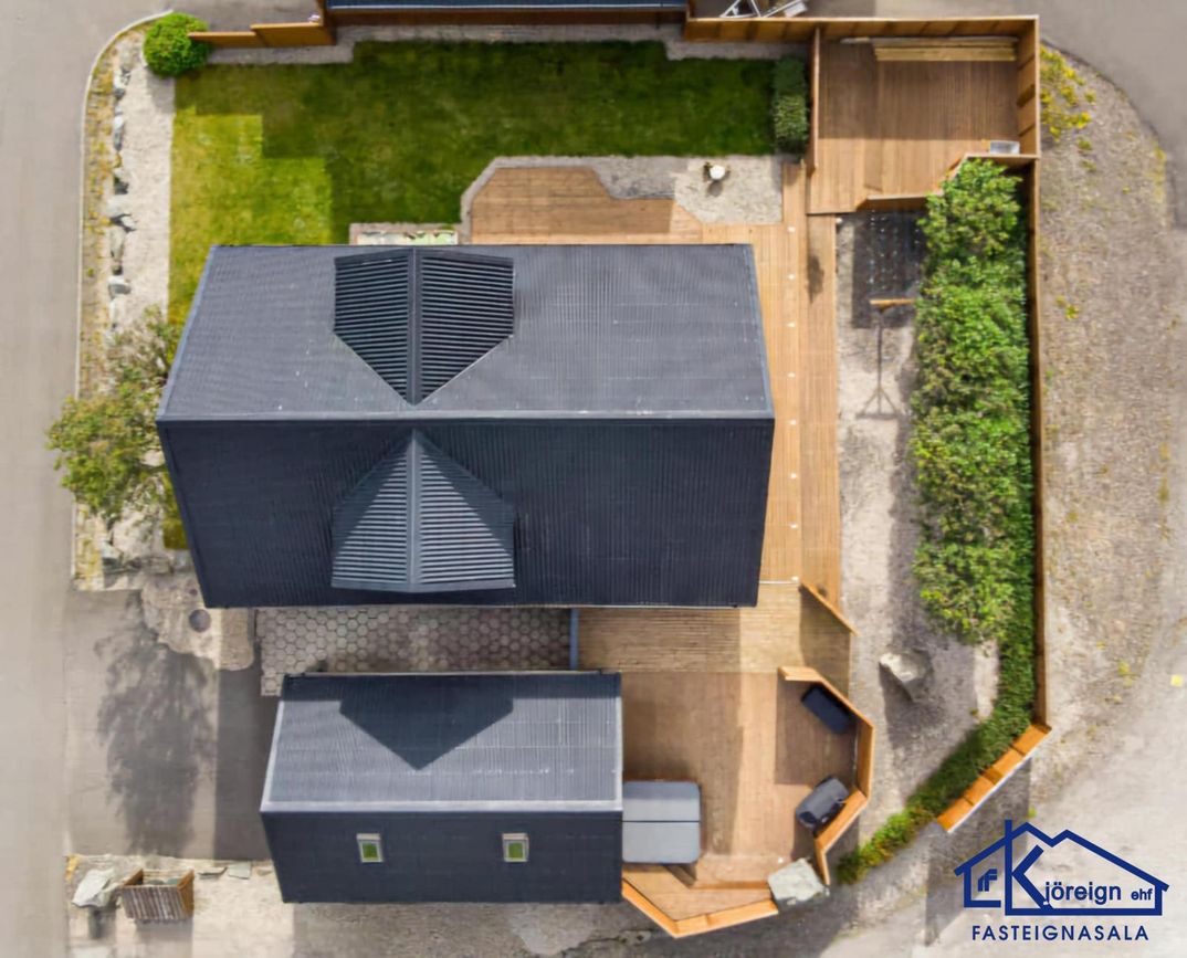 Glæsilegur og skjólgóður garður með pallum á suður- og vesturhlið. 8 manna rafmangspottur við bílskúrinn.