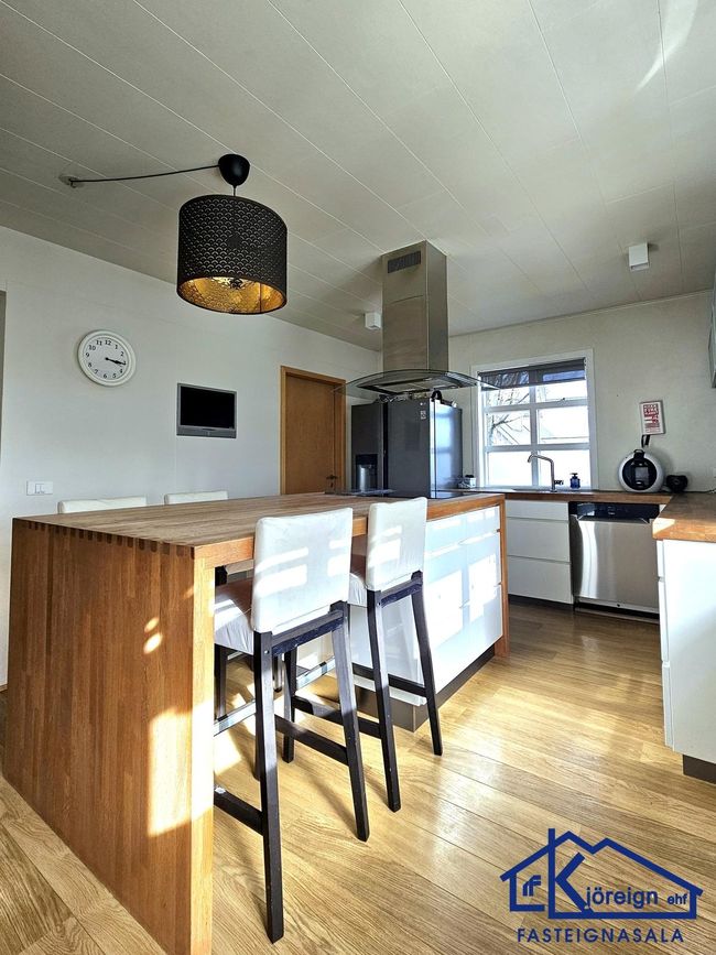 Endurnýjað 2007 með Kvik innréttingum, eikarborðfleti á eyju, parket á gólfi. Ný eldavél og háfur settir 2024.