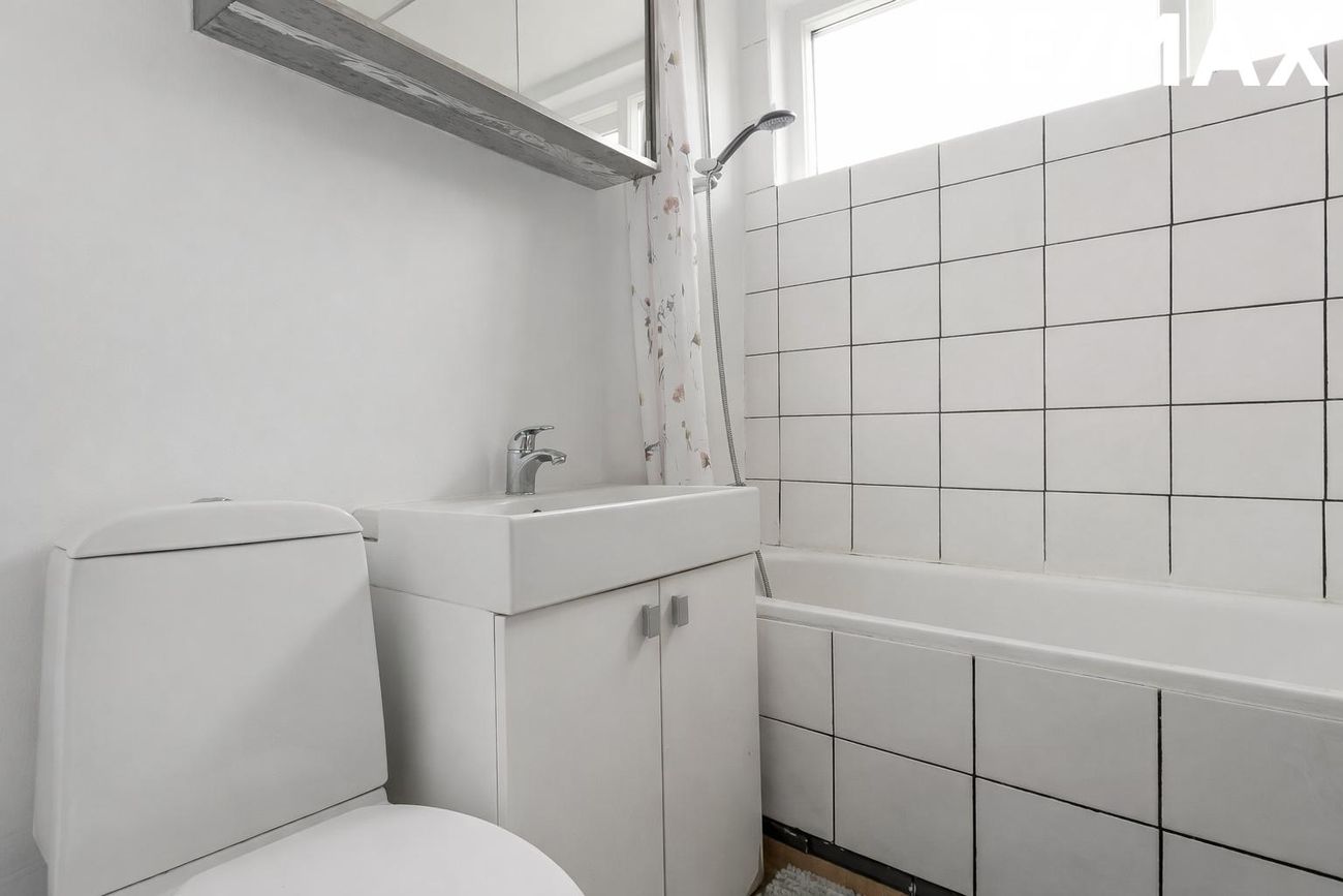 Baðherbergið er með lítilli innréttingu, flísar á gólfi og veggjum að hluta. Baðkar með sturtu aðstöðu. Gluggi er á baðherberginu.