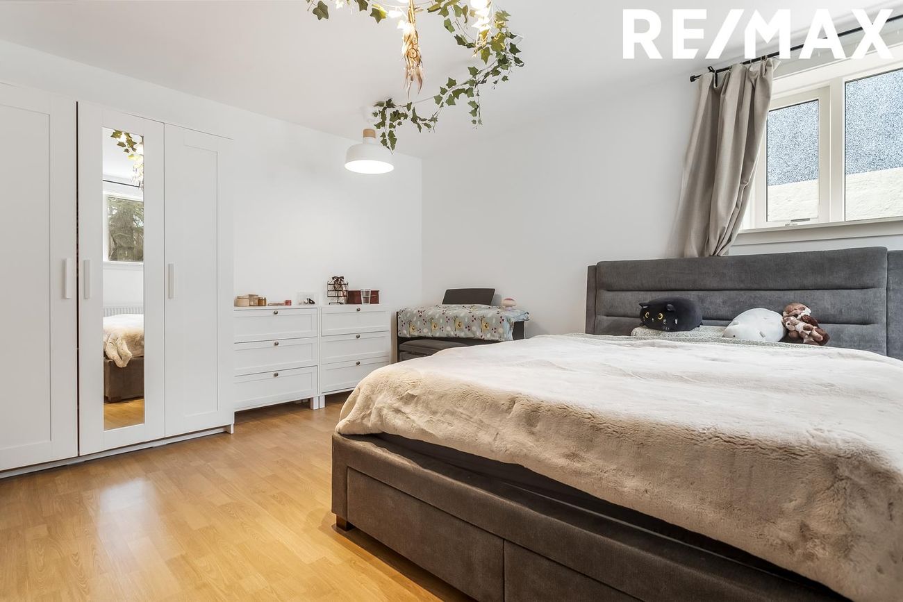 Svefnherbergið er rúmgott með parketi á gólfi og lausum fata skáp.